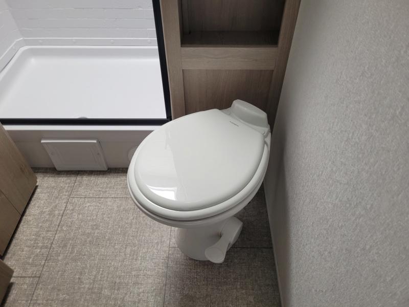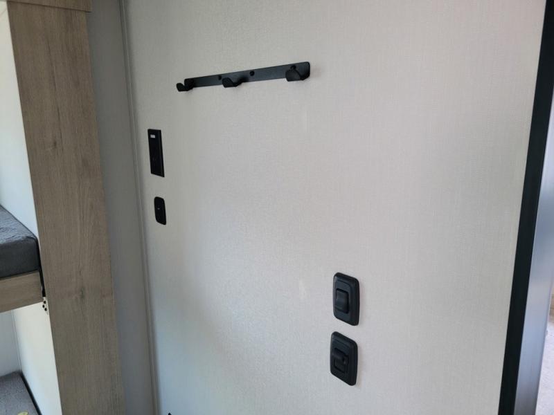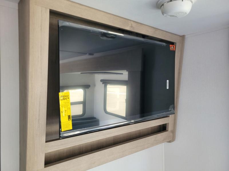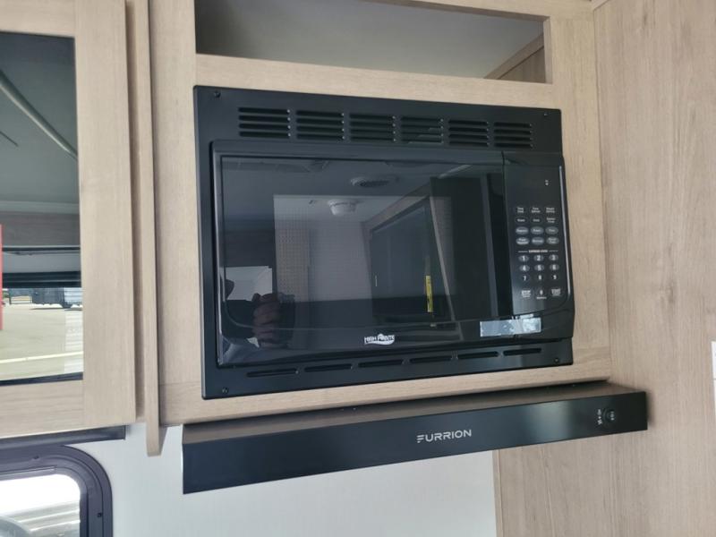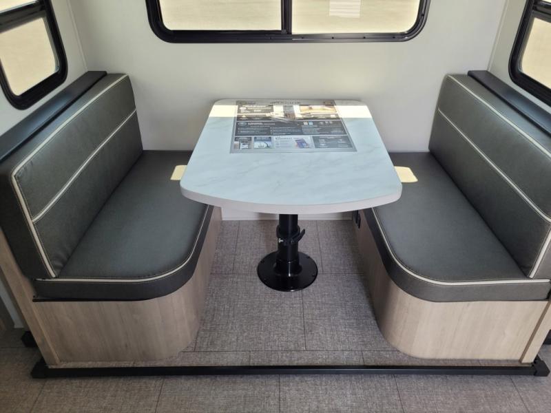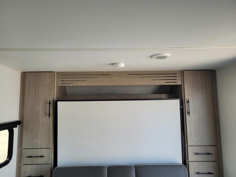 Your family will love camping in this spacious and versatile trailer thanks to the double slides and Murphy bed provided. During the day the Murphy bed is tucked away to provide more space and seating, and at night when folded down, there is a curtain for some privacy as you sleep. The booth dinette slides out to provide even more space and features windows on three sides so you can look out at your surroundings while you enjoy breakfast. The 30" flip top and bottom bunks each have some privacy with the sliding door, and the bunks are right next to the full bathroom for easy access in the middle of the night. The kitchen features everything you need to create meals and snacks as you travel, and you can have some more prep space by using the flip-up countertop extension.