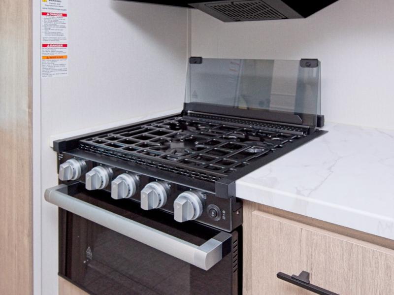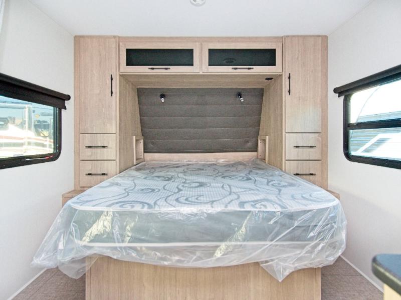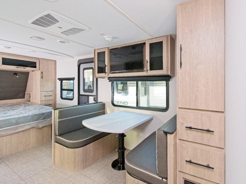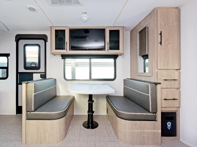 After a fun day outdoors, retreat to the theatre seating and booth dinette in the living area, perfect for unwinding with a coffee or catching up on your itinerary. Feel like watching a movie? The LED HDTV is there for your entertainment. The queen-size bed at the front offers a restful night’s sleep, and the privacy curtain allows you to create a semi-private bedroom. In the rear of the trailer, you'll find a full kitchen and bathroom to meet all your needs.