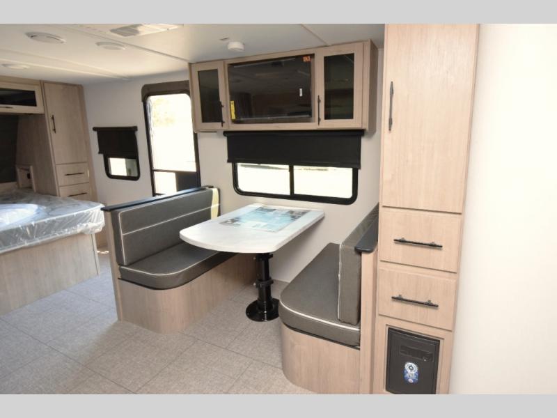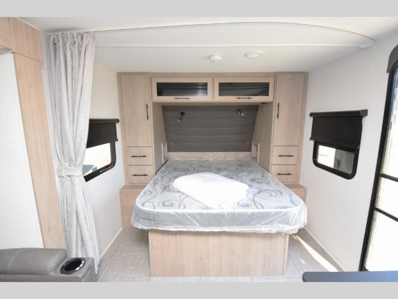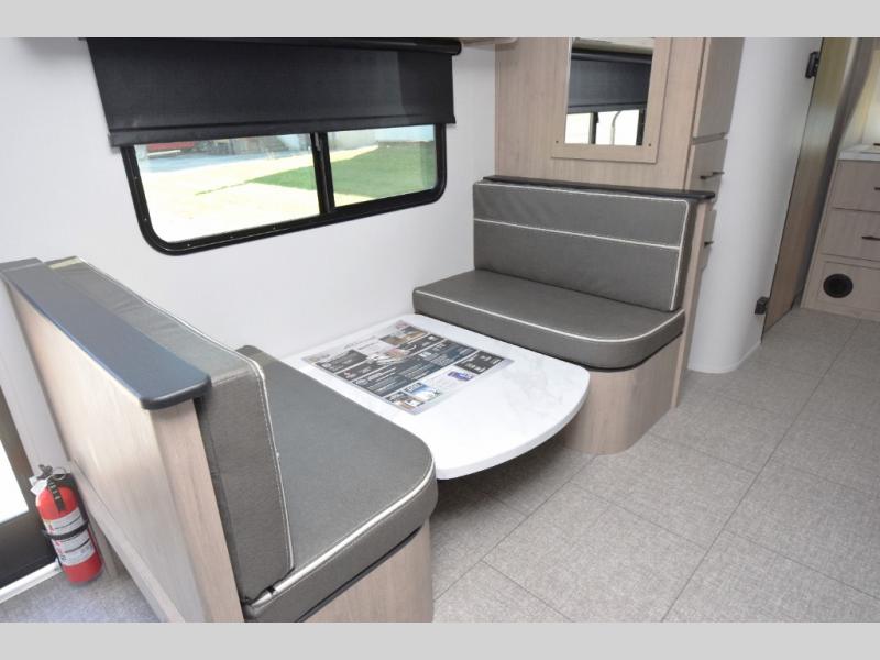 Innovative Layout and Spacious Design: The 22MLE offers an intelligent and spacious layout that maximizes every inch of the trailer. The unique Murphy bed design provides a comfortable queen-sized bed that folds up to create more living space during the day. The slide-out dinette adds even more space for family meals, relaxation, or entertaining guests. Plus, large windows throughout ensure a bright, airy feel that brings the outdoors in.