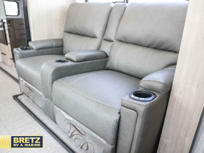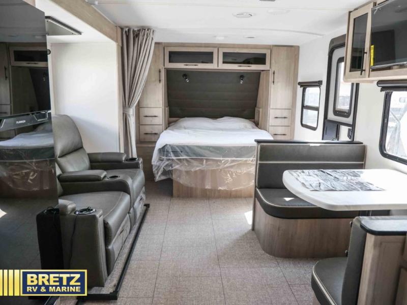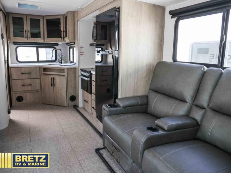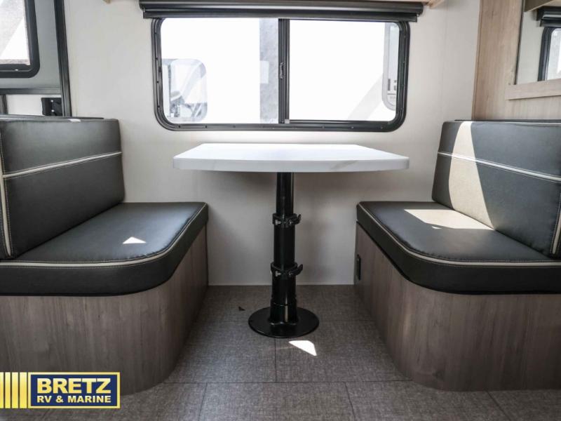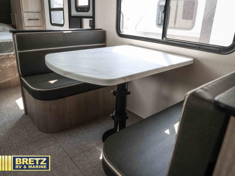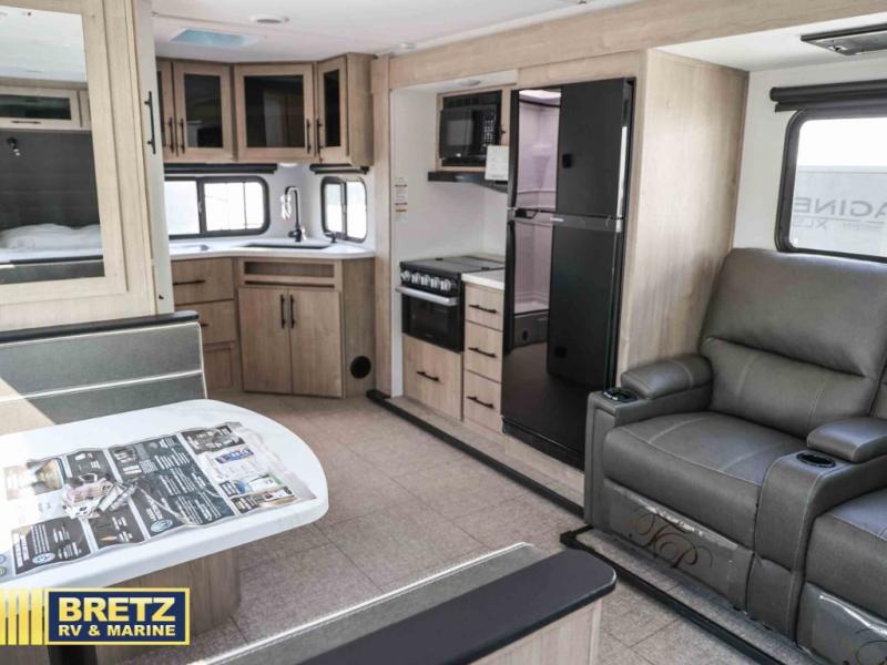 This Imagine XLS travel trailer has theater seating and a booth dinette that you can use any time you need a little break from the outdoors. If you want to come in and grab a coffee, put together a puzzle, or work on your itinerary for the week, just put up your feet and relax. You could even switch on the LED HDTV if you want a little entertainment. The front queen-size bed has a privacy curtain that you can draw to create a semi-private bedroom, and in the back of the trailer you will find the rest of your amenities, like the kitchen and the bathroom. The large slide makes it easy to enjoy spending your time indoors, but if you do want to get back outside, you can sit underneath the 18' electric awning for some shade.