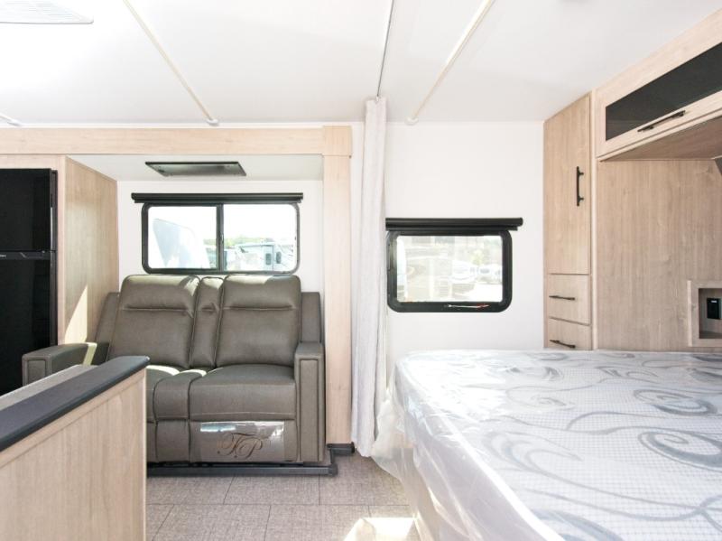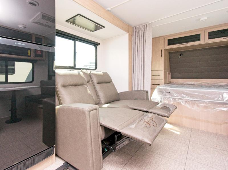 Experience ultimate relaxation and convenience with the Grand Design Imagine XLS, featuring cozy theater seating and a spacious queen bed with a privacy curtain.