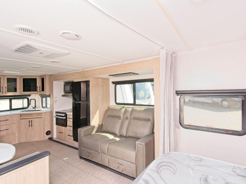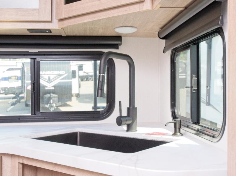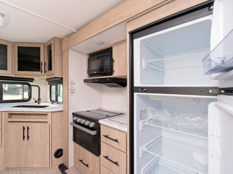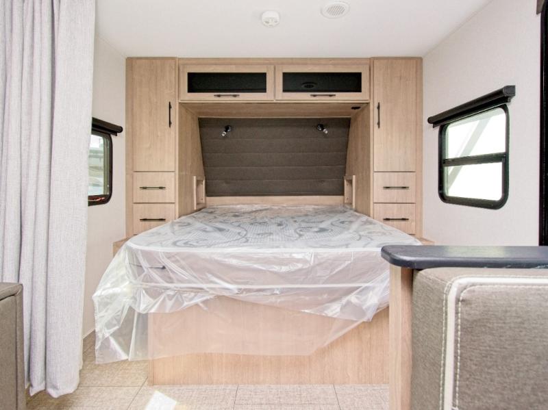 The kitchen and bathroom are conveniently located at the back of the trailer, and the large slide-out provides ample space for indoor activities. When you're ready to head back outside, the 18' electric awning offers shade and protection.