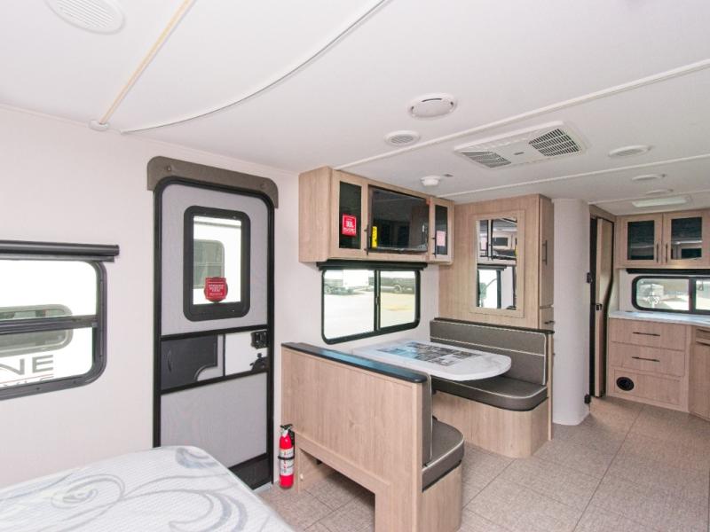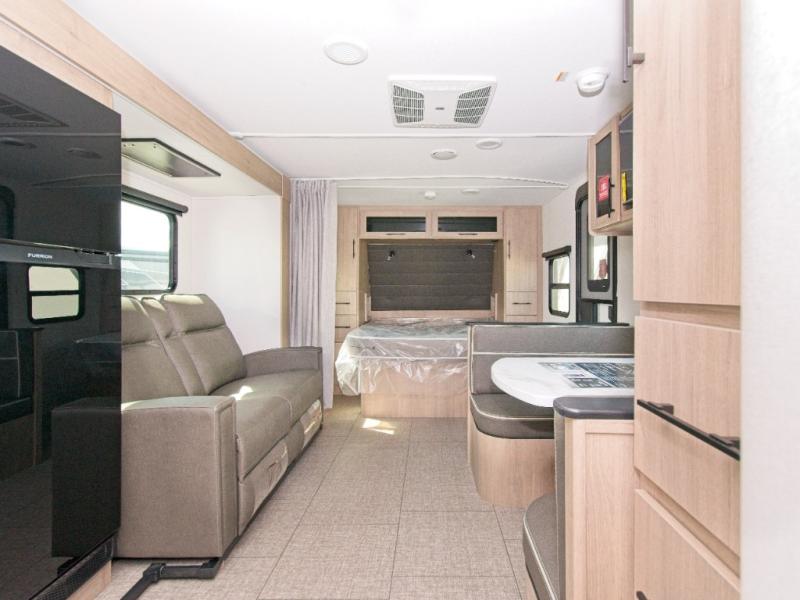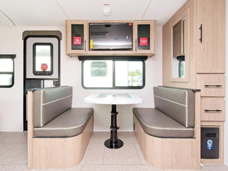 Take a break from the outdoors with the Imagine XLS travel trailer, featuring cozy theater seating and a booth dinette. Whether you're enjoying a coffee, working on a puzzle, or planning your itinerary, you can relax in comfort. Switch on the LED HDTV for some entertainment, and enjoy the semi-private front bedroom with a queen-size bed and privacy curtain.