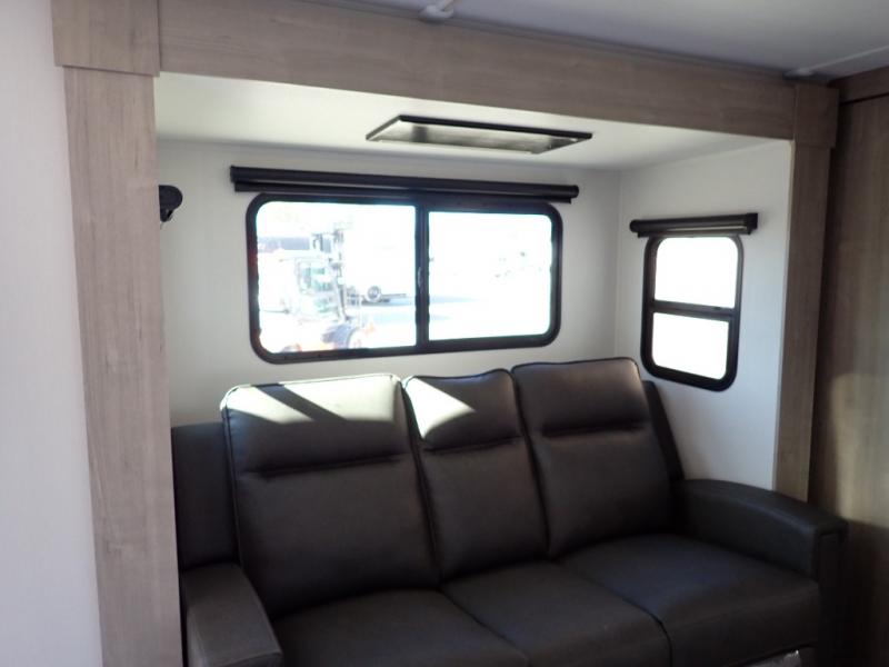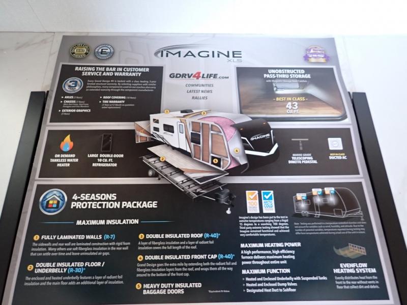 Let your imagination run wild with the possibilities that the Grand Design Imagine XLS travel trailer can provide! The Imagine XLS has been built with oversized tank capacities, an extra-large 2" fresh water drain valve, a ducted A/C system, a power tongue jack, and a heated and enclosed underbelly with suspended tanks. There is a designated heat duct to the subfloor and a residential ductless heating system throughout. For outdoor adventures, the electric awning with LED lights will enable you to stay protected, and the Tuff-Ply pass-thru flooring will withstand your many adventures. You will also love the XLS Solar Package that comes with a 180W roof mounted solar panel, a 40 Amp charge controller, a 12V 10 cu. ft. refrigerator, and roof mounted quick connect plugs!