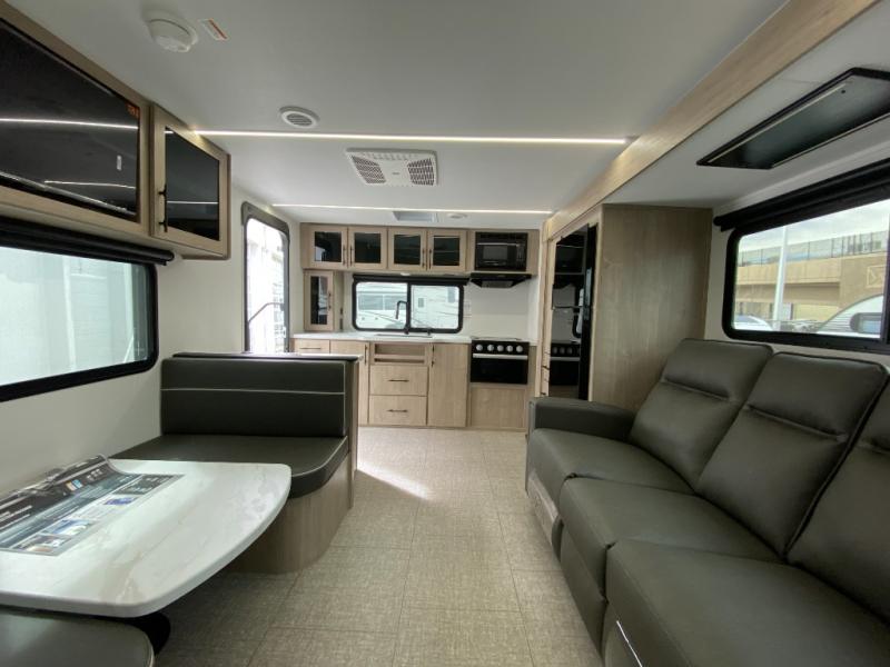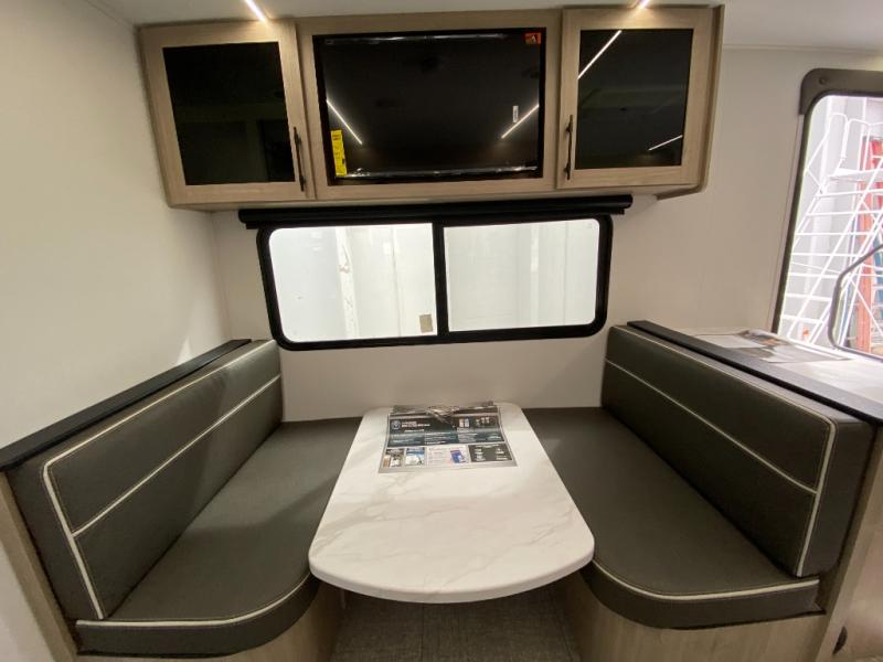 Treat yourself to a weekend of fun in this Imagine XLS travel trailer! Whether it's just you and your spouse, or you've chosen to bring along a group of friends, this trailer will meet the need. The front bedroom can sleep two people on the walk-around queen-size bed. The bedroom is quite functional because it not only contains the second exterior entry door, but it also has a private entrance into the walk-through bathroom since it is located on the other side of the bathroom. The booth dinette is functional too because it can transform from a dining location into a sleeping location, and the theater seating is directly across from the LED TV for easy viewing.