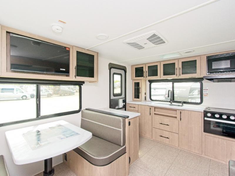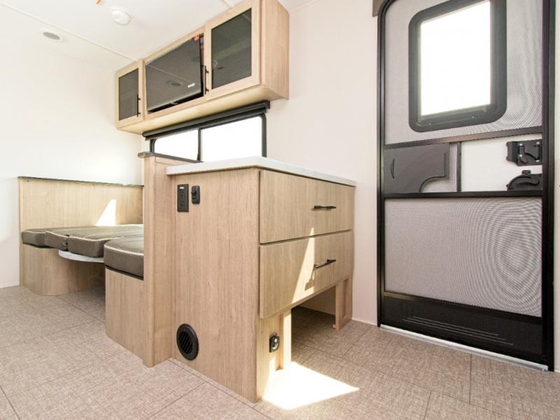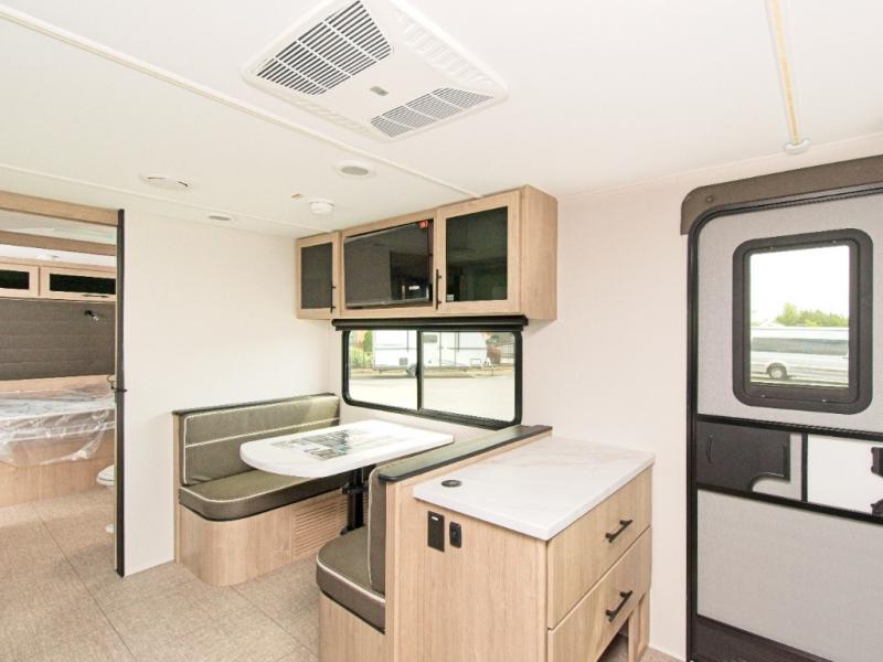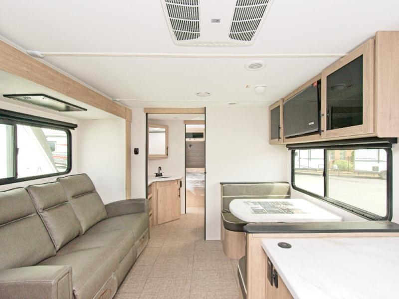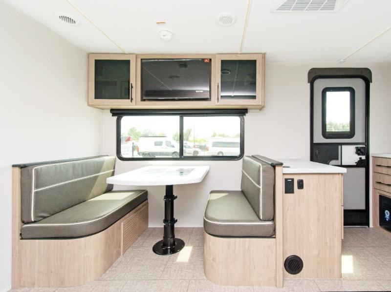 Treat yourself to a weekend of fun with the Grand Design Imagine XLS travel trailer 23LDE! Perfect for couples or groups, this trailer features a front bedroom with a walk-around queen-size bed and a private entrance to the walk-through bathroom. The dual entry doors add convenience, while the booth dinette transforms from a dining area to a sleeping space. Enjoy easy viewing from the theater seating directly across from the LED TV.