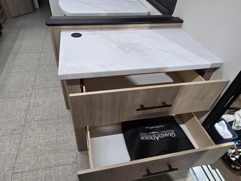 Let your imagination run wild with the possibilities that the Grand Design Imagine XLS travel trailer can provide! The Imagine XLS has been built with oversized tank capacities, an extra-large 2" fresh water drain valve, a ducted A/C system, a power tongue jack, and a heated and enclosed underbelly with suspended tanks. There is a designated heat duct to the subfloor and a residential ductless heating system throughout. For outdoor adventures, the electric awning with LED lights will enable you to stay protected, and the Tuff-Ply pass-thru flooring will withstand your many adventures. You will also love the XLS Solar Package that comes with a 200W roof mounted solar panel, a 40 Amp charge controller, a 12V 10 cu. ft. refrigerator, and roof mounted quick connect plugs!