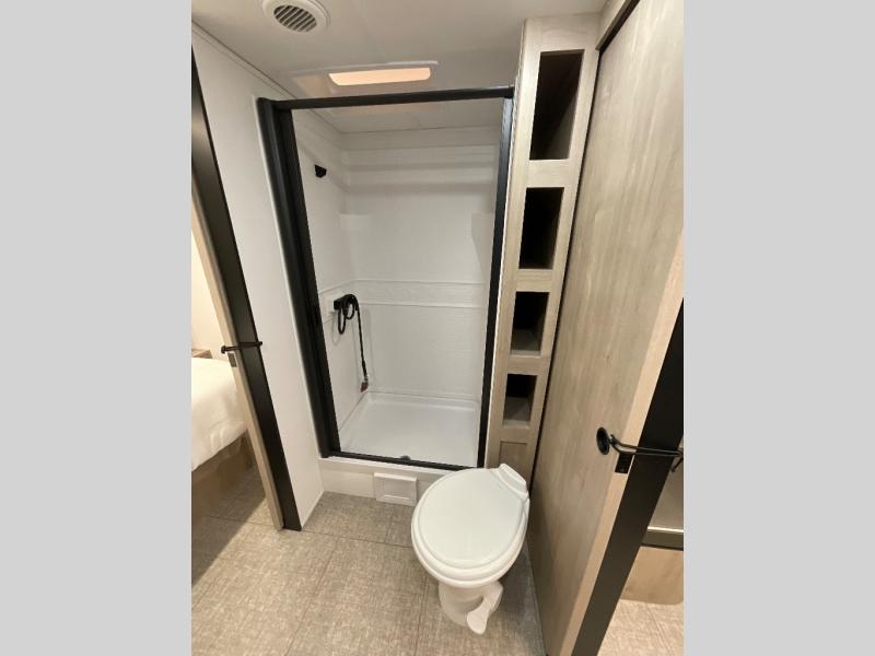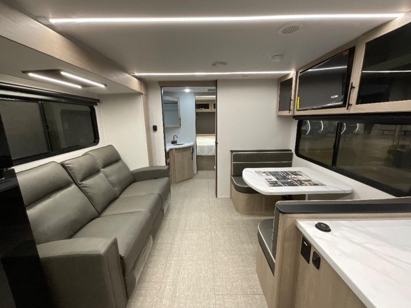 Treat yourself to a weekend of fun in this Imagine XLS travel trailer! Whether it's just you and your spouse, or you've chosen to bring along a group of friends, this trailer will meet the need. The front bedroom can sleep two people on the walk-around queen-size bed. The bedroom is quite functional because it not only contains the second exterior entry door, but it also has a private entrance into the walk-through bathroom since it is located on the other side of the bathroom. The booth dinette is functional too because it can transform from a dining location into a sleeping location, and the theater seating is directly across from the LED TV for easy viewing.