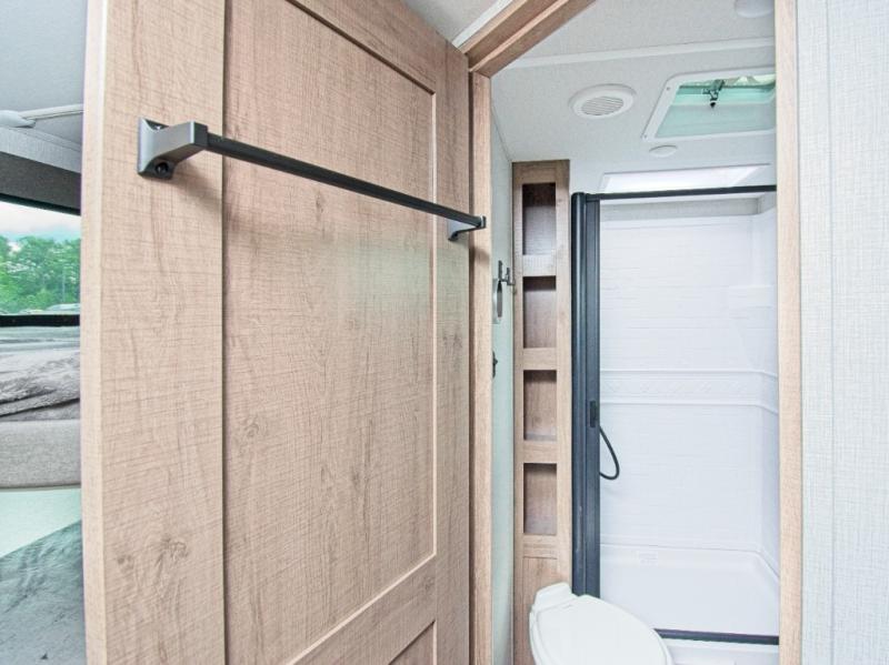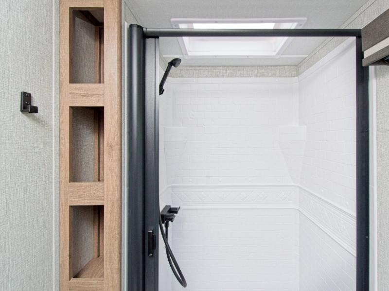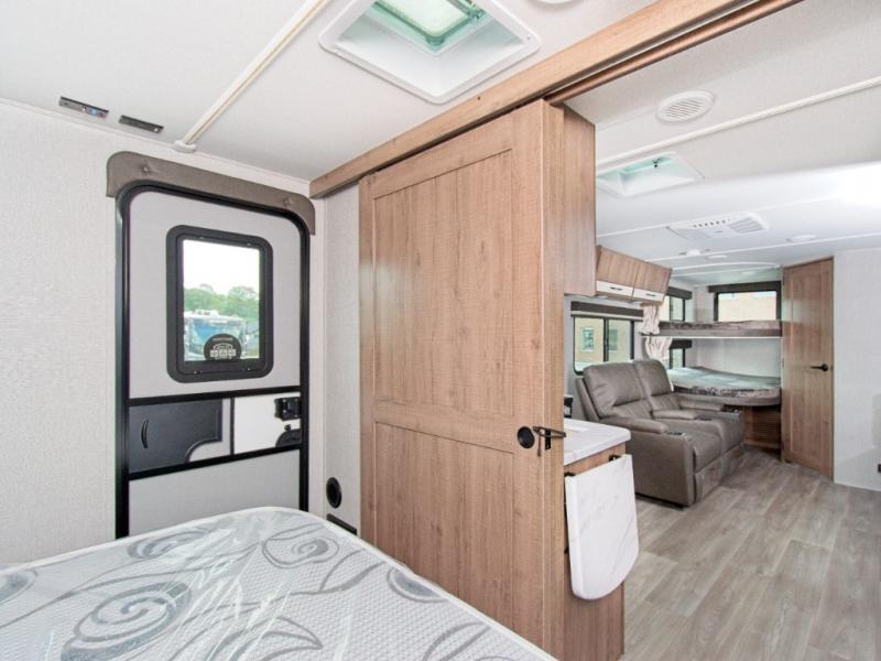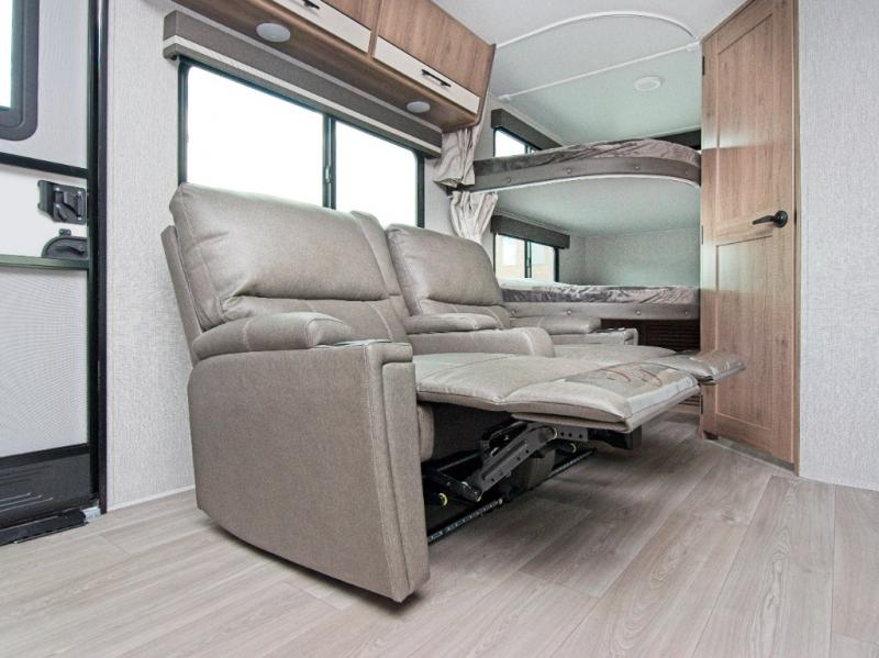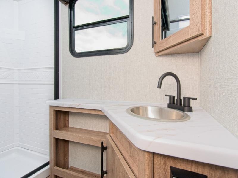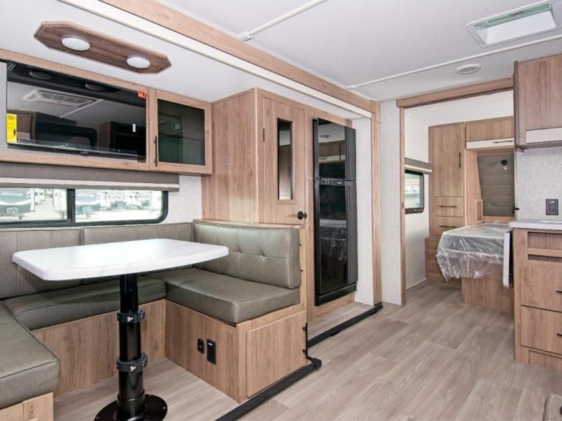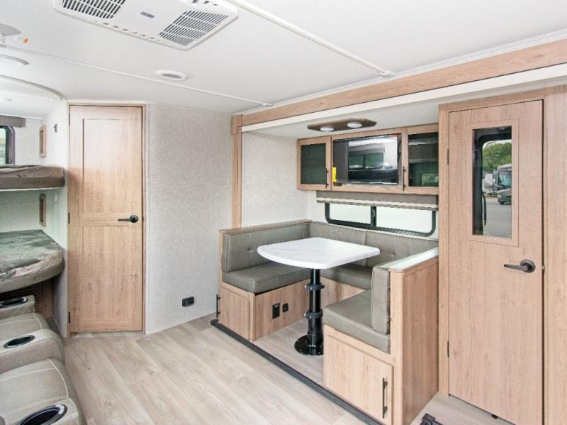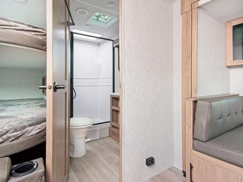 The U-shaped dinette sits by the window, allowing you to enjoy your breakfast while soaking in the scenic views. The full bathroom is conveniently located next to the bunks for quick access, especially during those late-night bathroom trips.