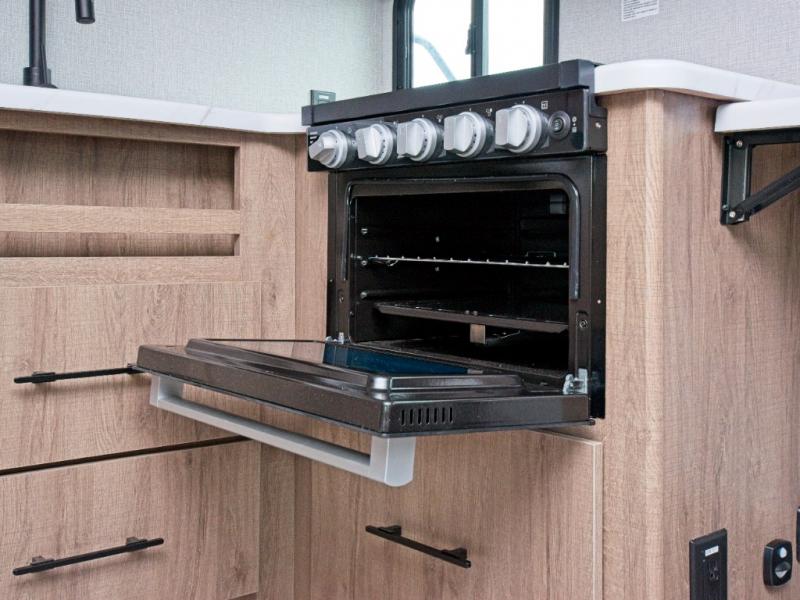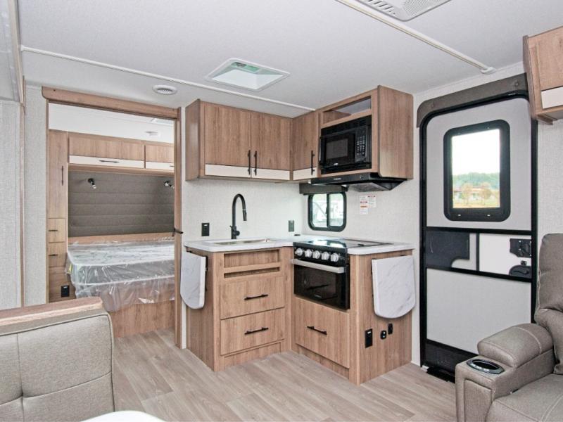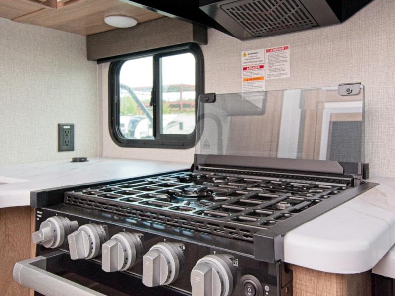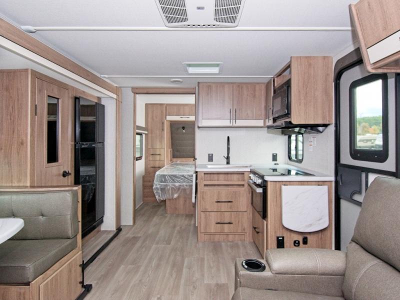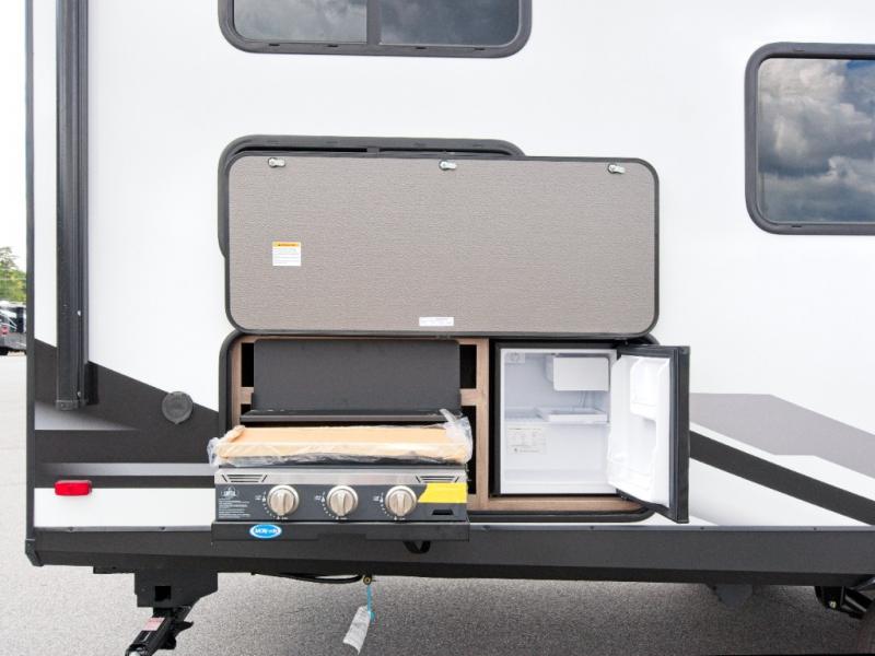 The well-equipped kitchen features everything you need for meal prep, and the flip-up countertop extension provides extra space when you need it. Outdoor cooking is a breeze with the outdoor griddle and 1.6 cu. ft. refrigerator, perfect for grilling under the 22' electric awning with LED lights, so you can enjoy your meals while staying cool and shaded.