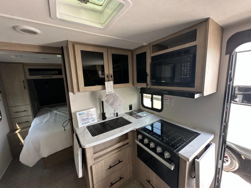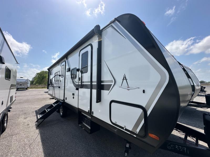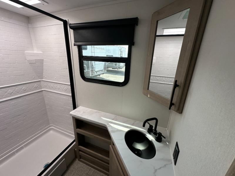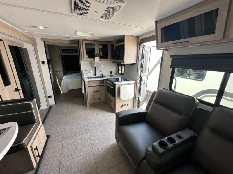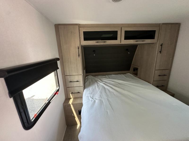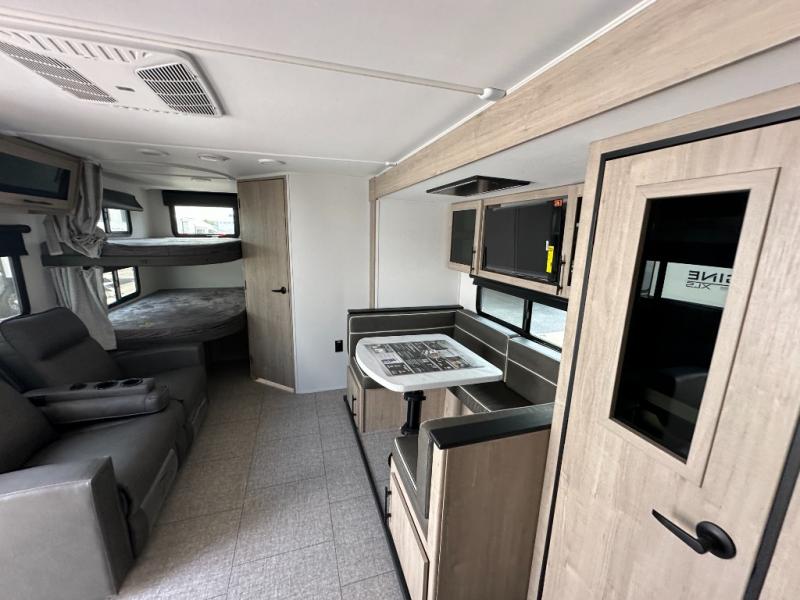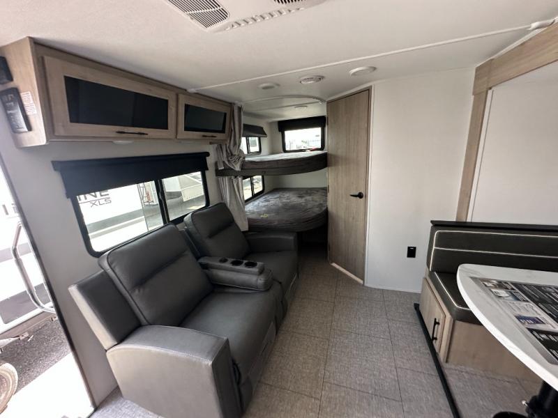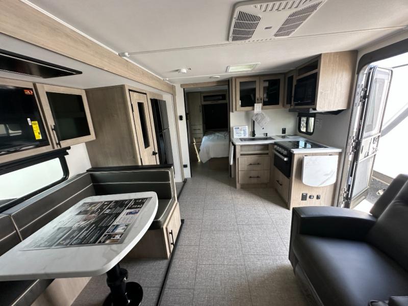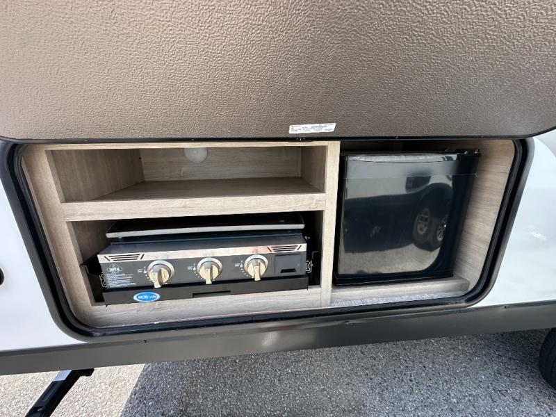 The dual entry doors make it easy to enter and exit this travel trailer! You will find a walk-around queen-size bed up front in the private bedroom, and one of the entry/exit doors to the unit so you can quietly slip out for an early morning fishing trip. The U-shaped dinette is right next to the window, so you can look out at your surroundings while you enjoy breakfast. The double-size bunks have some privacy curtains, and the bunks are right next to the full bathroom for easy access in the middle of the night. The fully equipped kitchen has everything you need to get dinner in the oven, and you can have some more prep space by using the flip-up countertop extension. You even have an outdoor griddle and an outdoor 1.6 cu. ft. refrigerator to enjoy a cold beverage while you cook under the 22' electric awning!