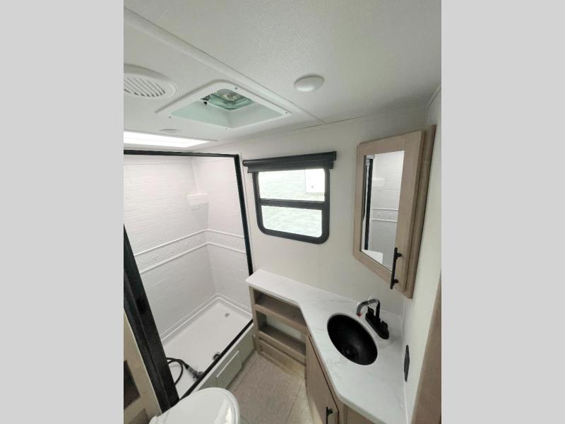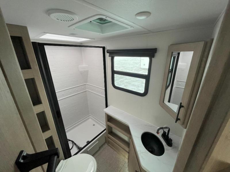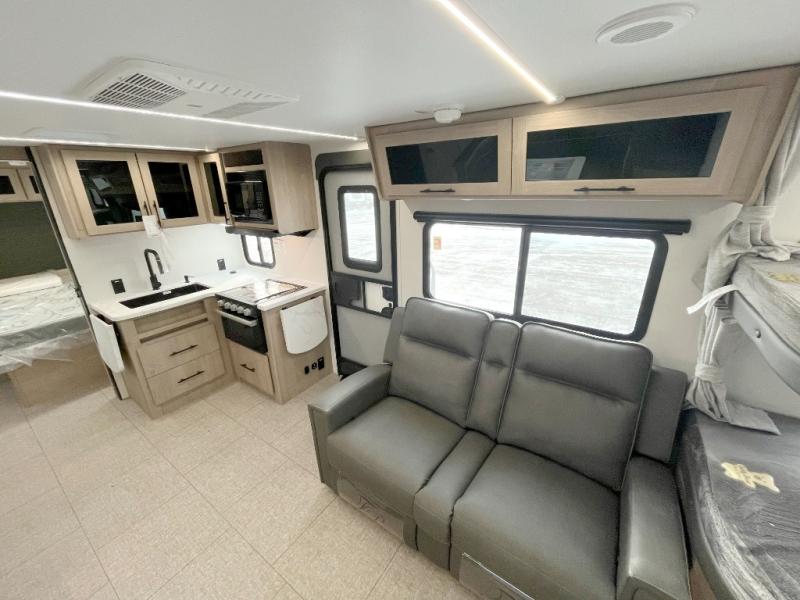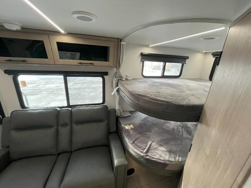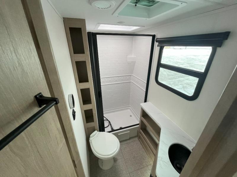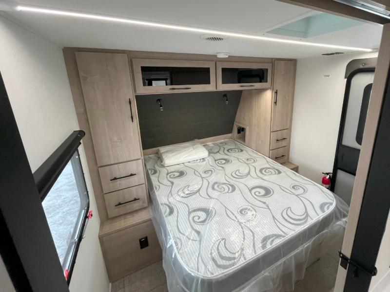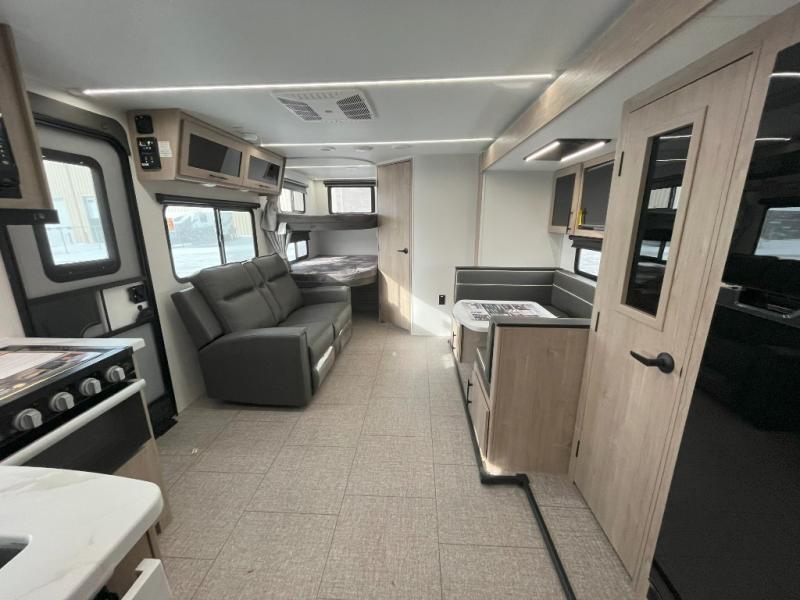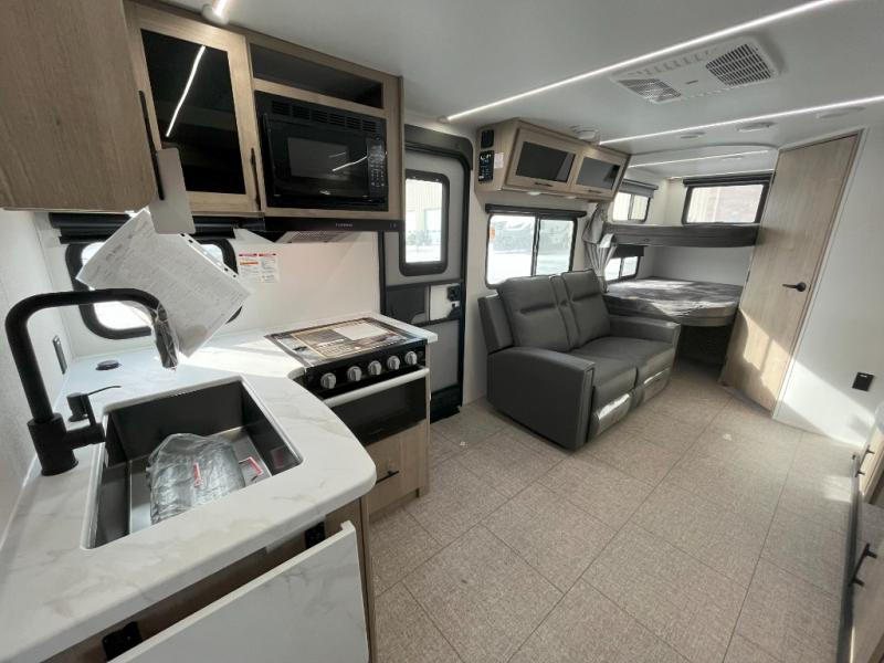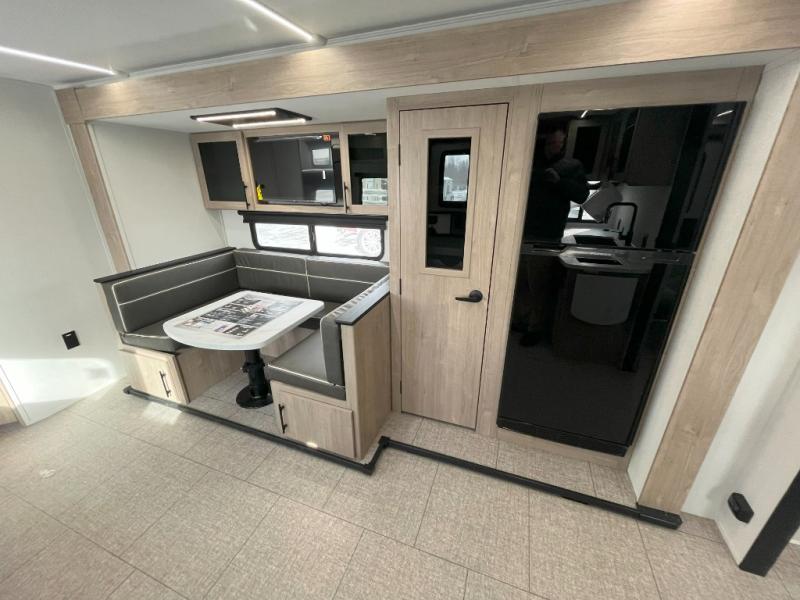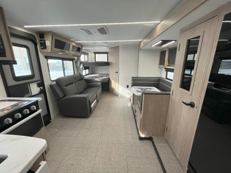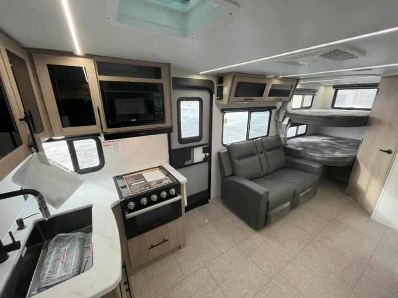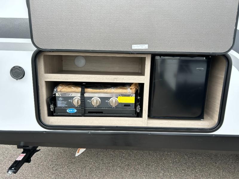 The dual entry doors make it easy to enter and exit this travel trailer! You will find a walk-around queen-size bed up front in the private bedroom, and one of the entry/exit doors to the unit so you can quietly slip out for an early morning fishing trip. The U-shaped dinette is right next to the window, so you can look out at your surroundings while you enjoy breakfast. The double-size bunks have some privacy curtains, and the bunks are right next to the full bathroom for easy access in the middle of the night. The fully equipped kitchen has everything you need to get dinner in the oven, and you can have some more prep space by using the flip-up countertop extension. You even have an outdoor griddle and an outdoor 1.6 cu. ft. refrigerator to enjoy a cold beverage while you cook under the 22' electric awning!