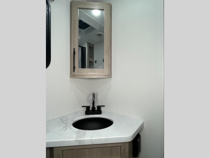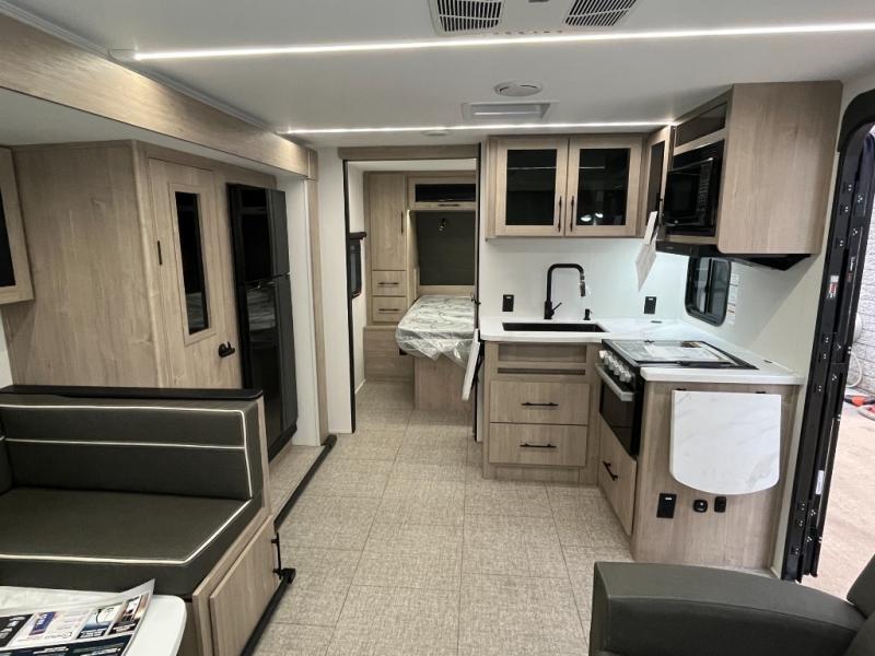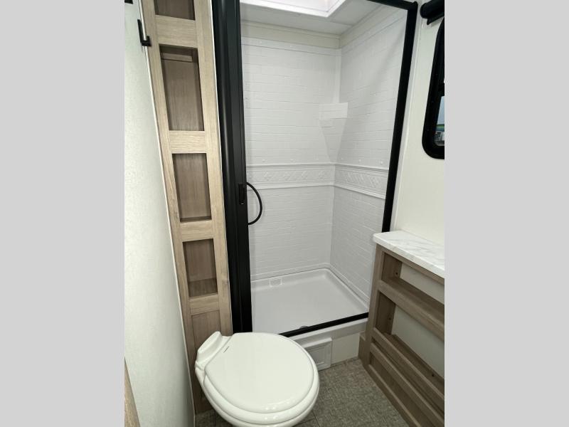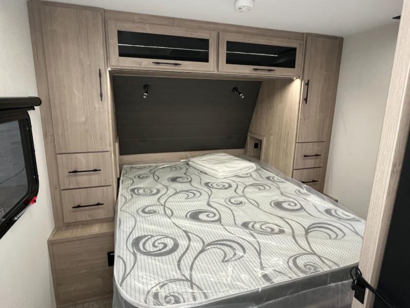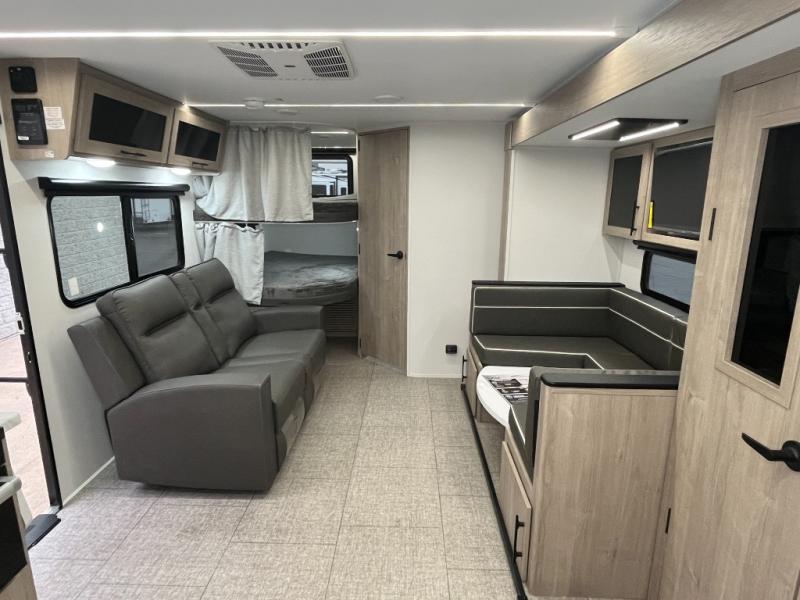 The dual entry doors make it easy to enter and exit this travel trailer! You will find a walk-around queen-size bed up front in the private bedroom, and one of the entry/exit doors to the unit so you can quietly slip out for an early morning fishing trip. The U-shaped dinette is right next to the window, so you can look out at your surroundings while you enjoy breakfast. The double-size bunks have some privacy curtains, and the bunks are right next to the full bathroom for easy access in the middle of the night. The fully equipped kitchen has everything you need to get dinner in the oven, and you can have some more prep space by using the flip-up countertop extension. You even have an outdoor griddle and an outdoor 1.6 cu. ft. refrigerator to enjoy a cold beverage while you cook under the 22' electric awning!