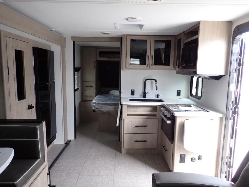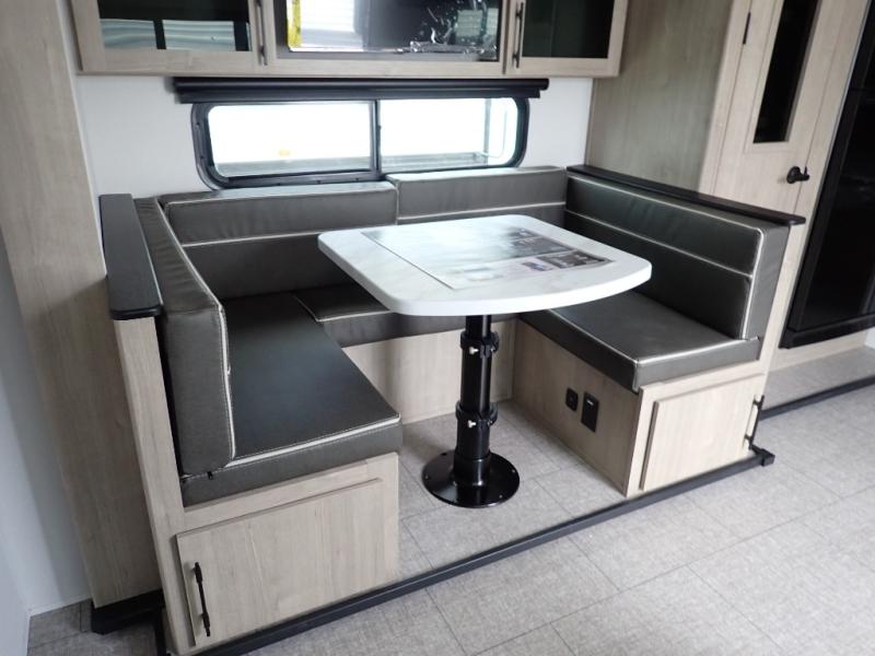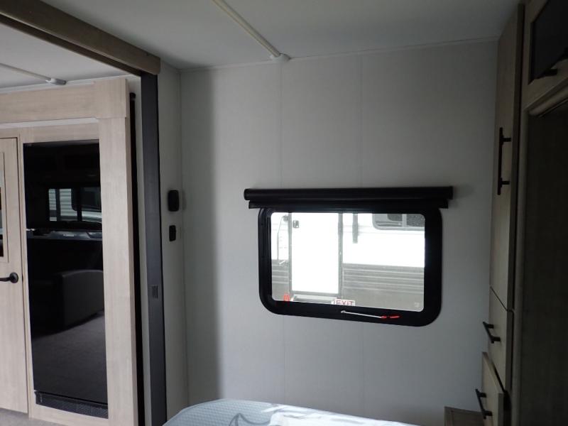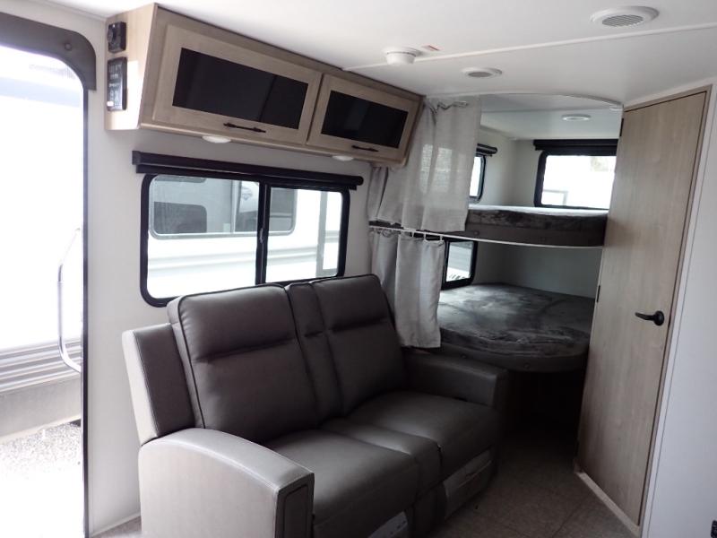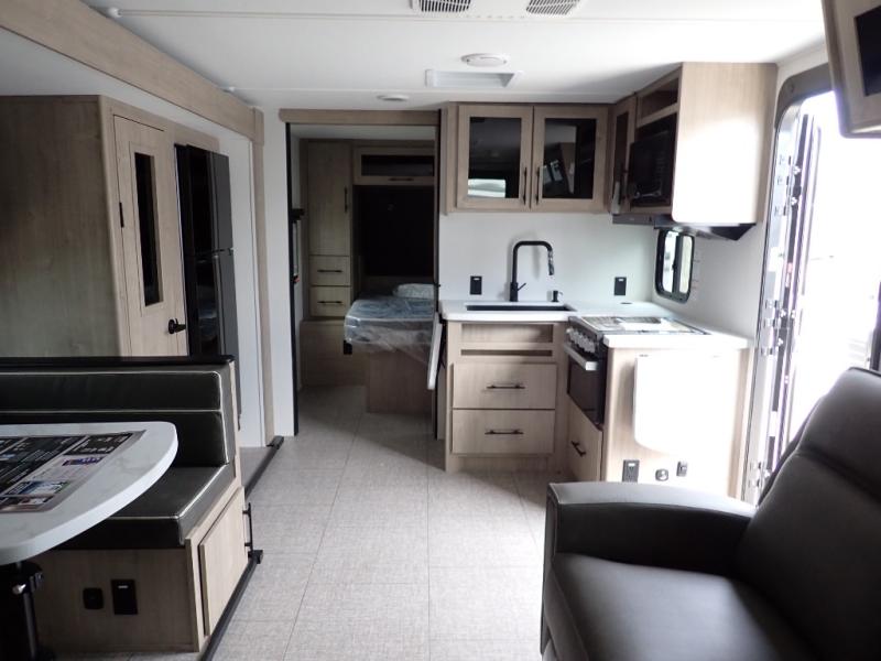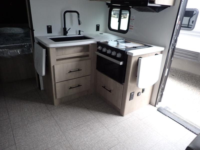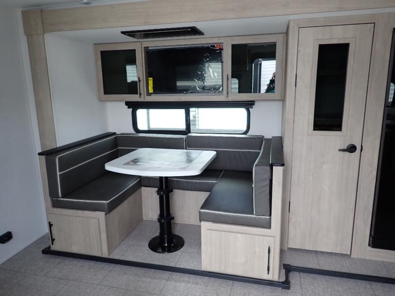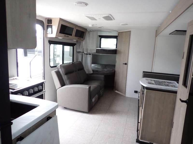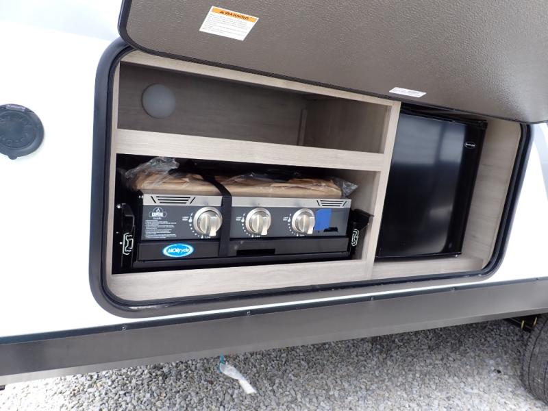 The dual entry doors make it easy to enter and exit this travel trailer! You will find a walk-around queen-size bed up front in the private bedroom, and one of the entry/exit doors to the unit so you can quietly slip out for an early morning fishing trip. The U-shaped dinette is right next to the window, so you can look out at your surroundings while you enjoy breakfast. The double-size bunks have some privacy curtains, and the bunks are right next to the full bathroom for easy access in the middle of the night. The fully equipped kitchen has everything you need to get dinner in the oven, and you can have some more prep space by using the flip-up countertop extension. You even have an outdoor griddle and an outdoor 1.6 cu. ft. refrigerator to enjoy a cold beverage while you cook under the 22' electric awning!