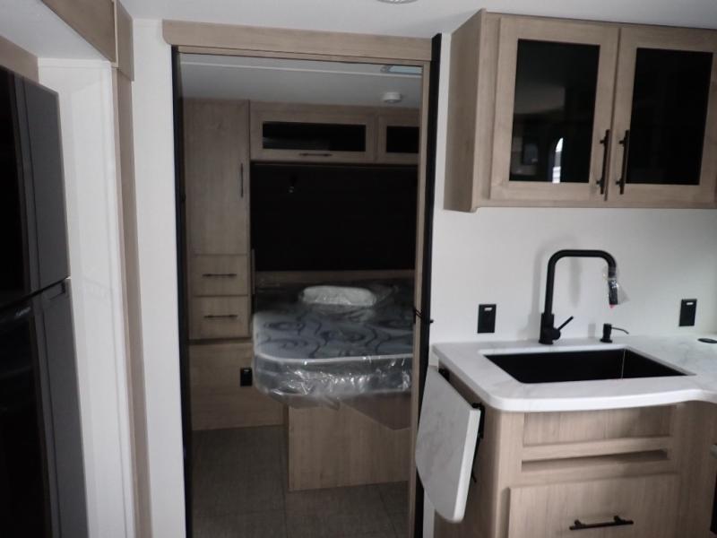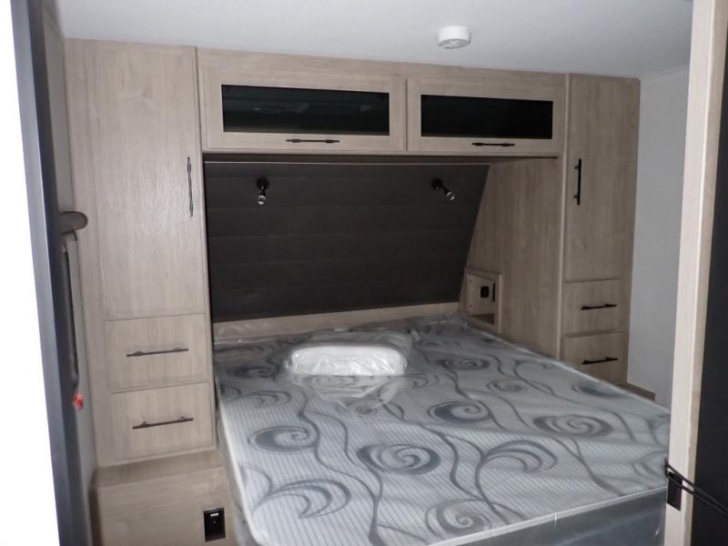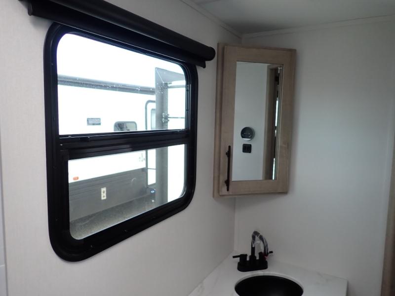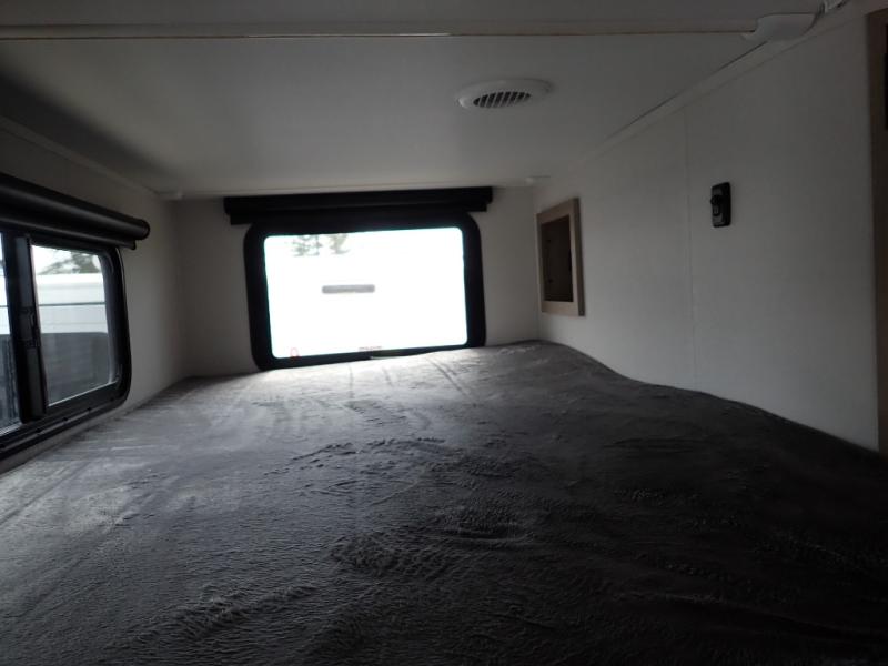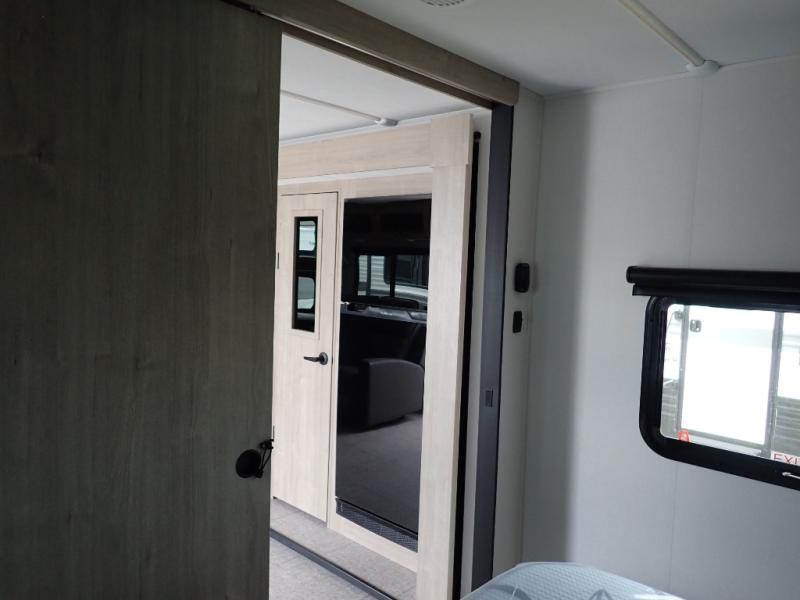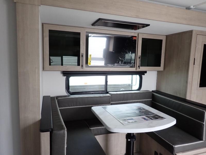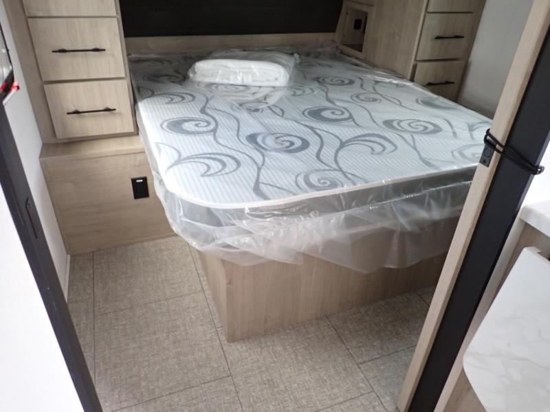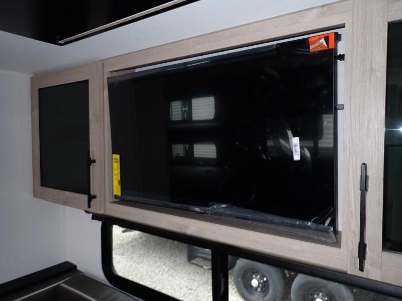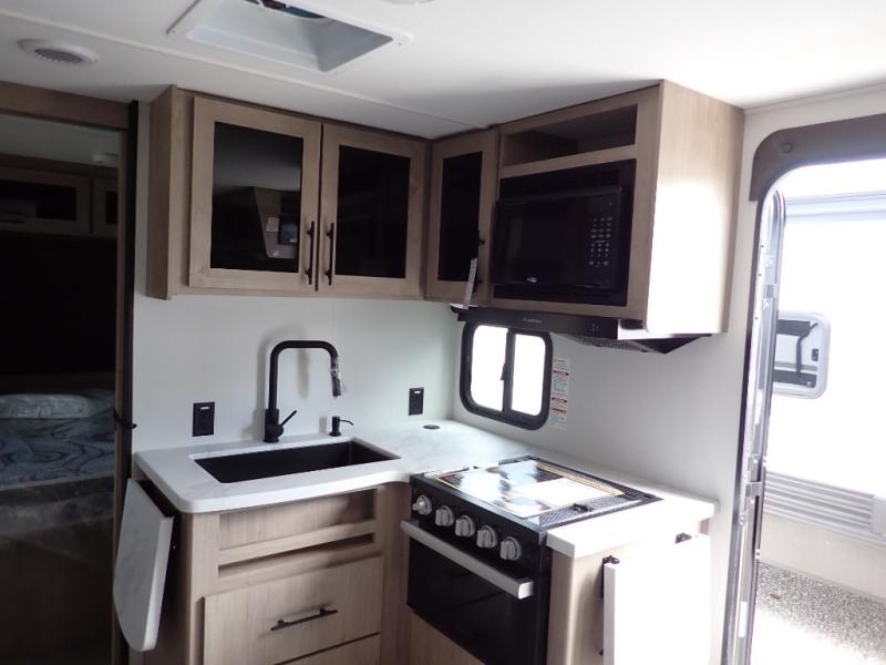 The dual entry doors make it easy to enter and exit this travel trailer! You will find a walk-around queen-size bed up front in the private bedroom, and one of the entry/exit doors to the unit so you can quietly slip out for an early morning fishing trip. The U-shaped dinette is right next to the window, so you can look out at your surroundings while you enjoy breakfast. The double-size bunks have some privacy curtains, and the bunks are right next to the full bathroom for easy access in the middle of the night. The fully equipped kitchen has everything you need to get dinner in the oven, and you can have some more prep space by using the flip-up countertop extension. You even have an outdoor griddle and an outdoor 1.6 cu. ft. refrigerator to enjoy a cold beverage while you cook under the 22' electric awning!