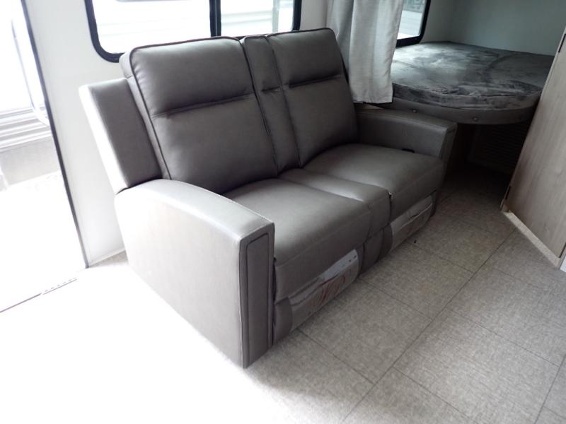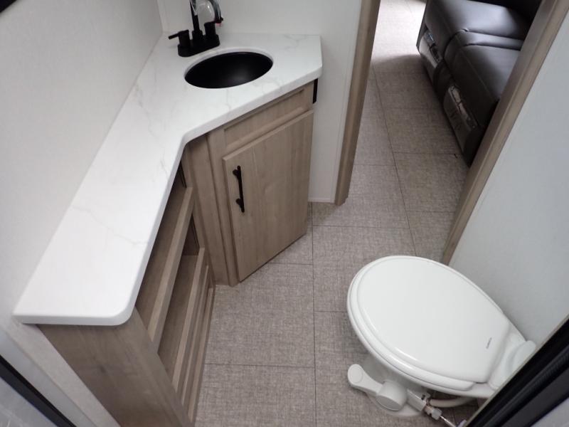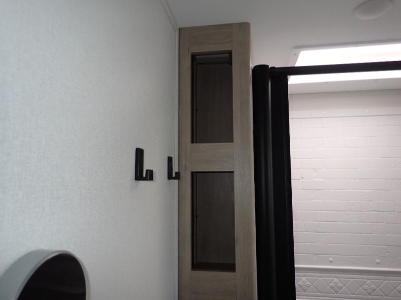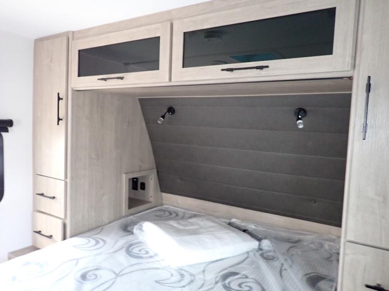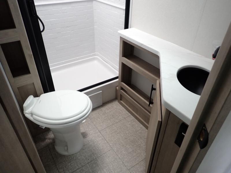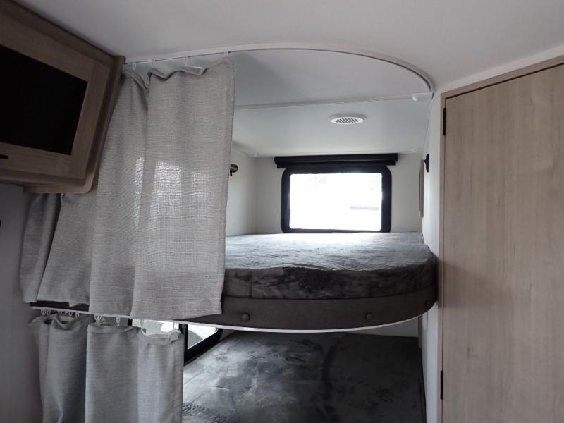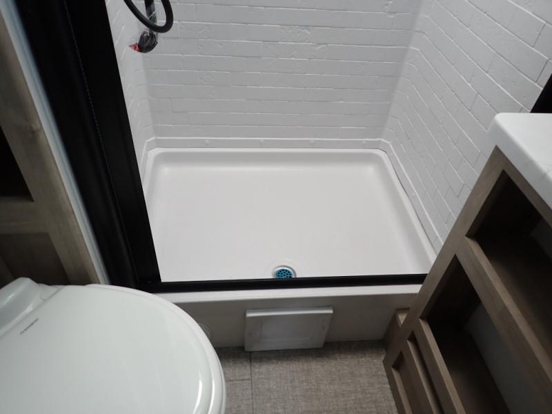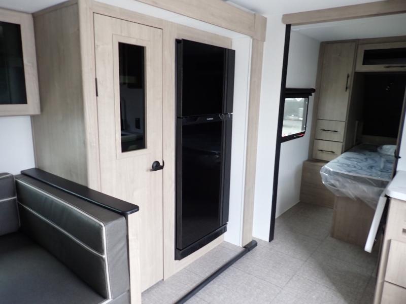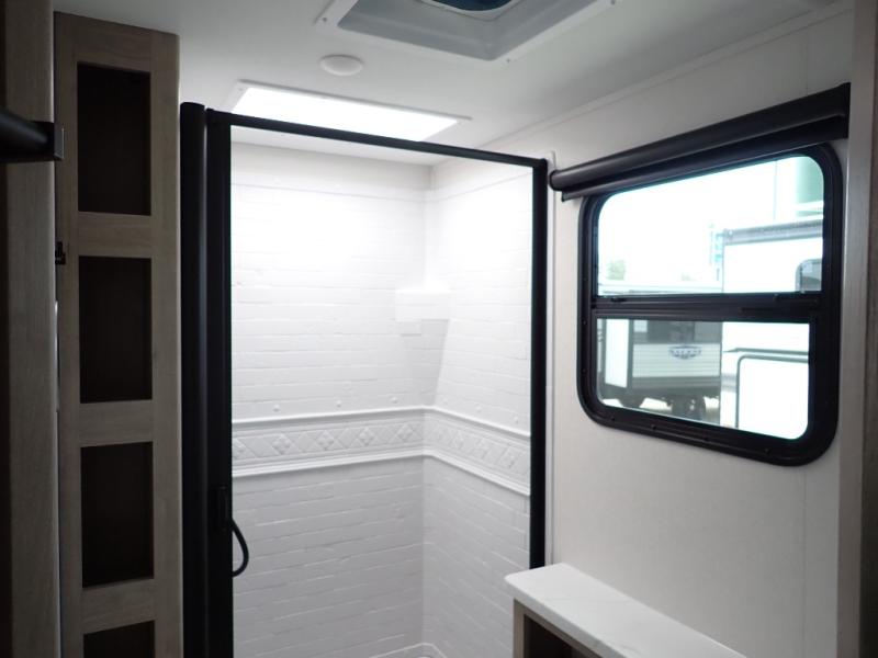 The dual entry doors make it easy to enter and exit this travel trailer! You will find a walk-around queen-size bed up front in the private bedroom, and one of the entry/exit doors to the unit so you can quietly slip out for an early morning fishing trip. The U-shaped dinette is right next to the window, so you can look out at your surroundings while you enjoy breakfast. The double-size bunks have some privacy curtains, and the bunks are right next to the full bathroom for easy access in the middle of the night. The fully equipped kitchen has everything you need to get dinner in the oven, and you can have some more prep space by using the flip-up countertop extension. You even have an outdoor griddle and an outdoor 1.6 cu. ft. refrigerator to enjoy a cold beverage while you cook under the 22' electric awning!