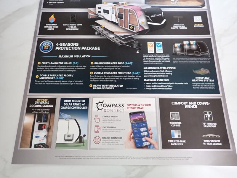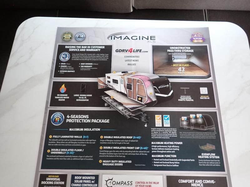 Let your imagination run wild with the possibilities that the Grand Design Imagine XLS travel trailer can provide! The Imagine XLS has been built with oversized tank capacities, an extra-large 2" fresh water drain valve, a ducted A/C system, a power tongue jack, and a heated and enclosed underbelly with suspended tanks. There is a designated heat duct to the subfloor and a residential ductless heating system throughout. For outdoor adventures, the electric awning with LED lights will enable you to stay protected, and the Tuff-Ply pass-thru flooring will withstand your many adventures. You will also love the XLS Solar Package that comes with a 180W roof mounted solar panel, a 40 Amp charge controller, a 12V 10 cu. ft. refrigerator, and roof mounted quick connect plugs!