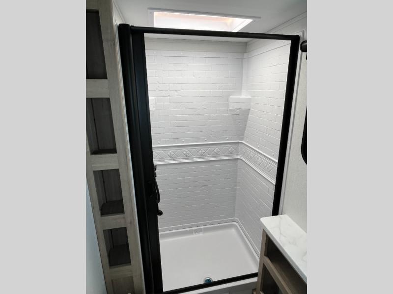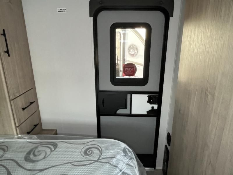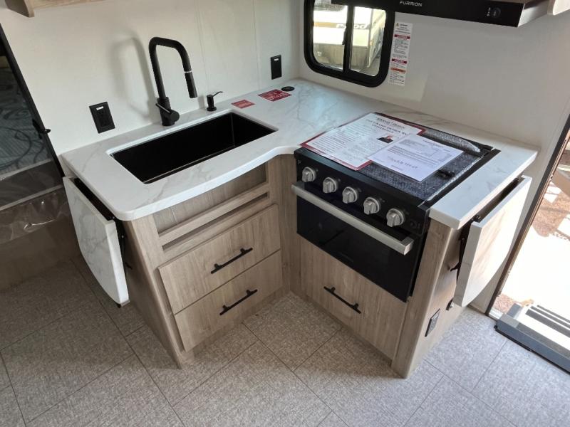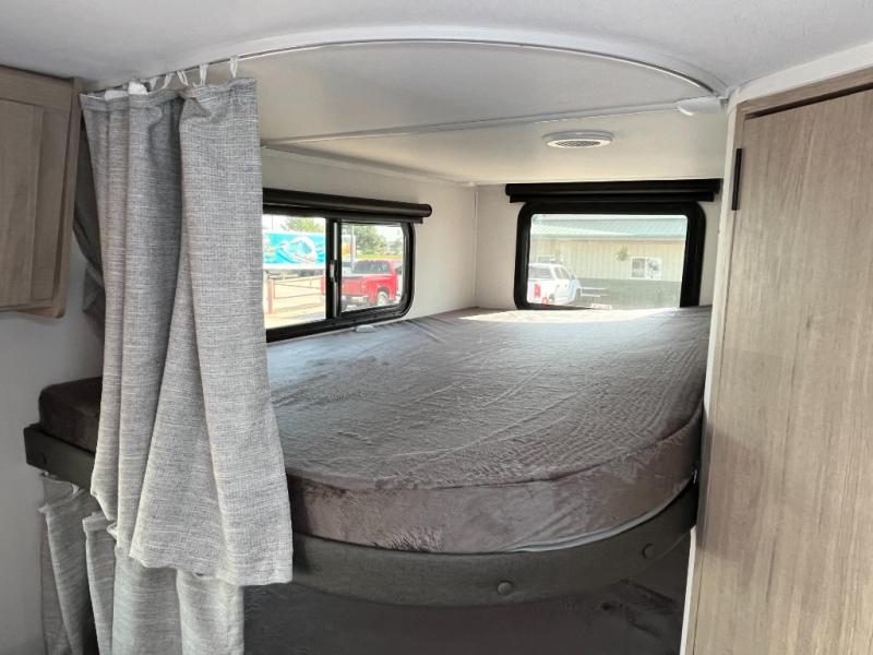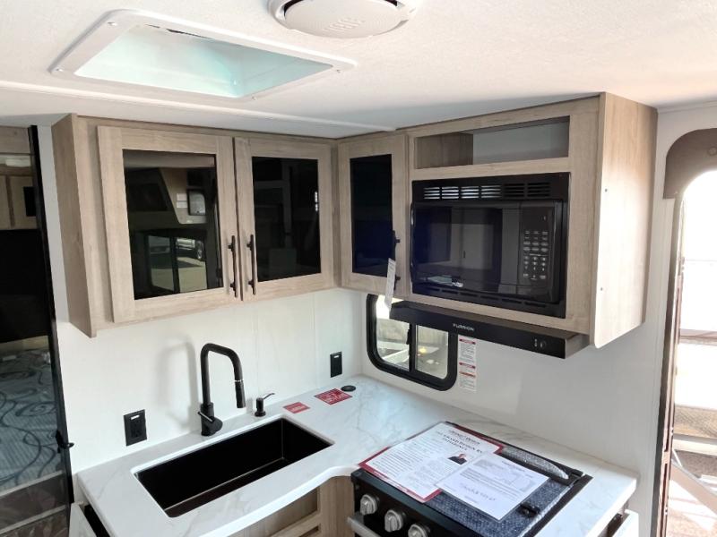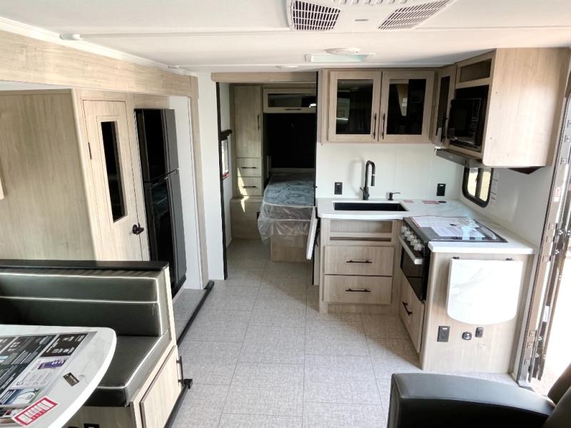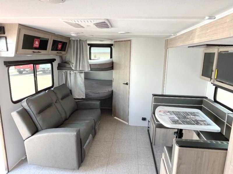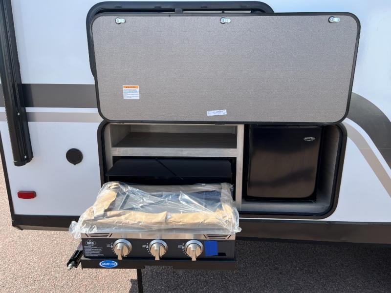 The dual entry doors make it easy to enter and exit this travel trailer! You will find a walk-around queen-size bed up front in the private bedroom, and one of the entry/exit doors to the unit so you can quietly slip out for an early morning fishing trip. The U-shaped dinette is right next to the window, so you can look out at your surroundings while you enjoy breakfast. The double-size bunks have some privacy curtains, and the bunks are right next to the full bathroom for easy access in the middle of the night. The fully equipped kitchen has everything you need to get dinner in the oven, and you can have some more prep space by using the flip-up countertop extension. You even have an outdoor griddle and an outdoor 1.6 cu. ft. refrigerator to enjoy a cold beverage while you cook under the 22' electric awning!