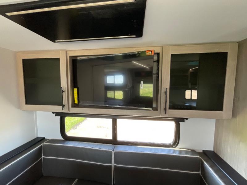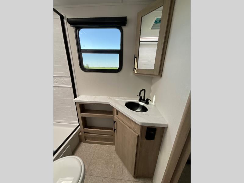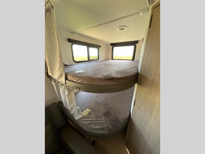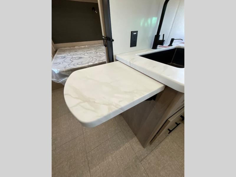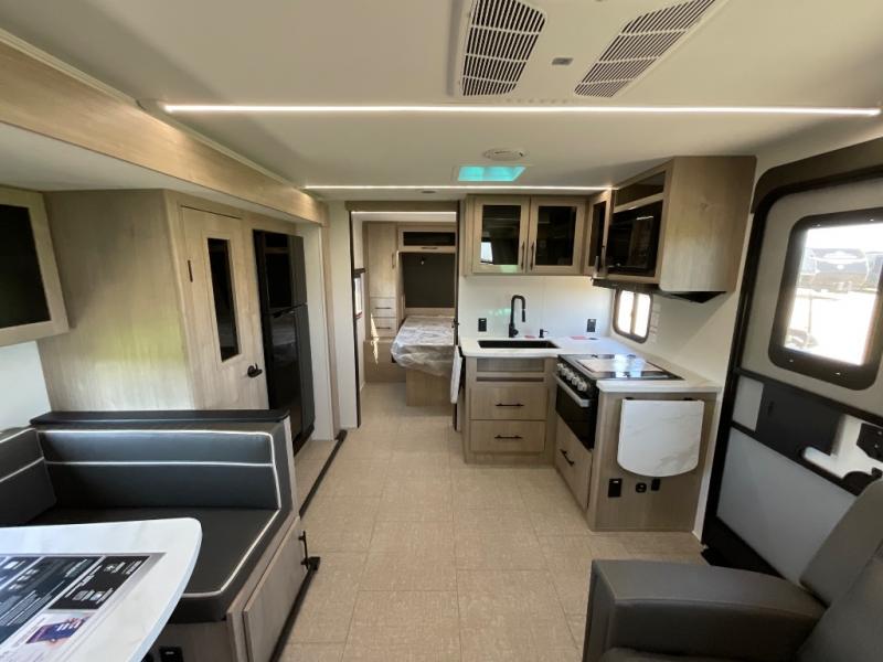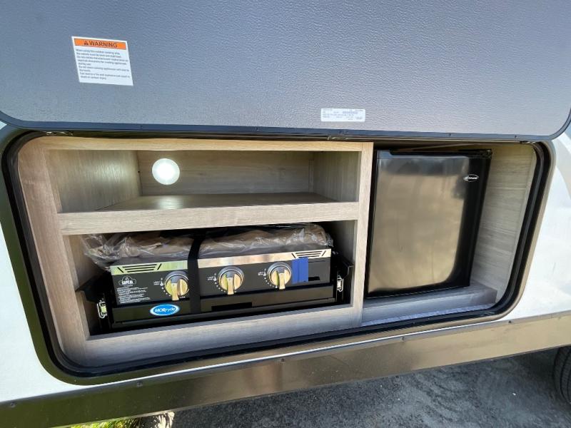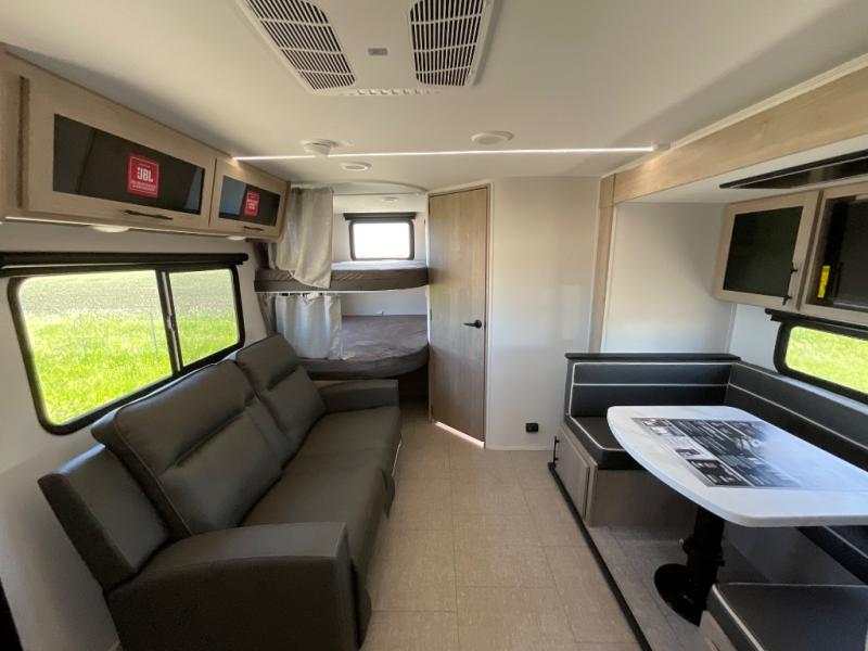 The dual entry doors make it easy to enter and exit this travel trailer! You will find a walk-around queen-size bed up front in the private bedroom, and one of the entry/exit doors to the unit so you can quietly slip out for an early morning fishing trip. The U-shaped dinette is right next to the window, so you can look out at your surroundings while you enjoy breakfast. The double-size bunks have some privacy curtains, and the bunks are right next to the full bathroom for easy access in the middle of the night. The fully equipped kitchen has everything you need to get dinner in the oven, and you can have some more prep space by using the flip-up countertop extension. You even have an outdoor griddle and an outdoor 1.6 cu. ft. refrigerator to enjoy a cold beverage while you cook under the 22' electric awning!