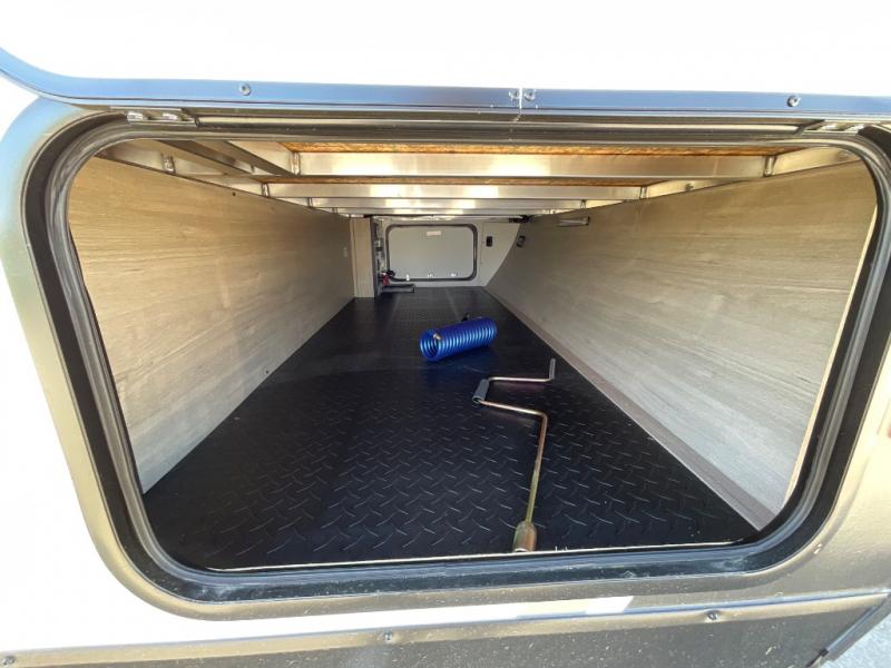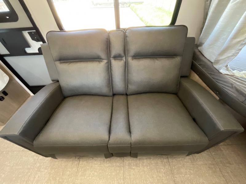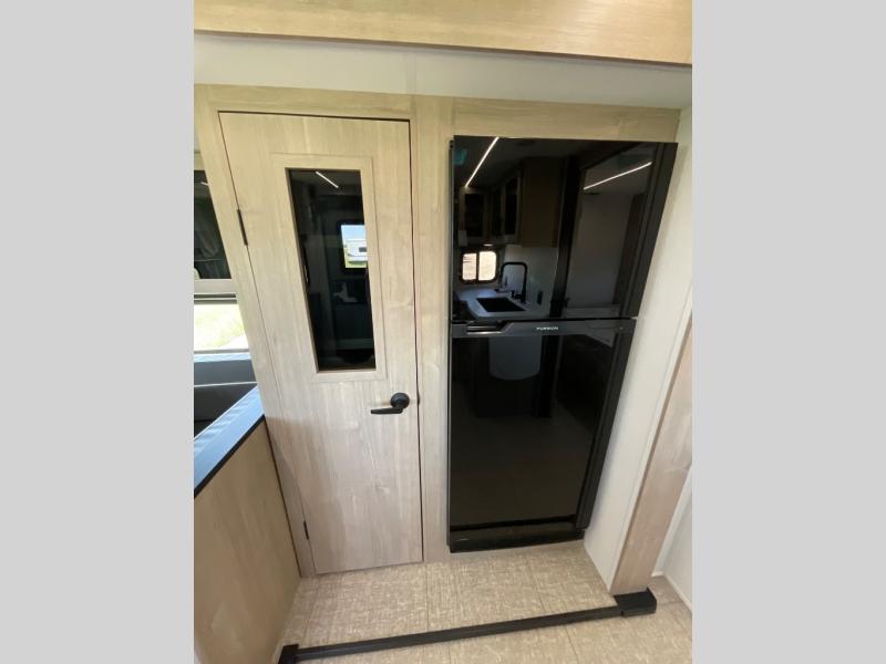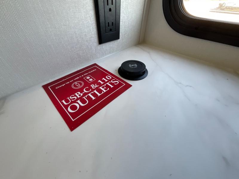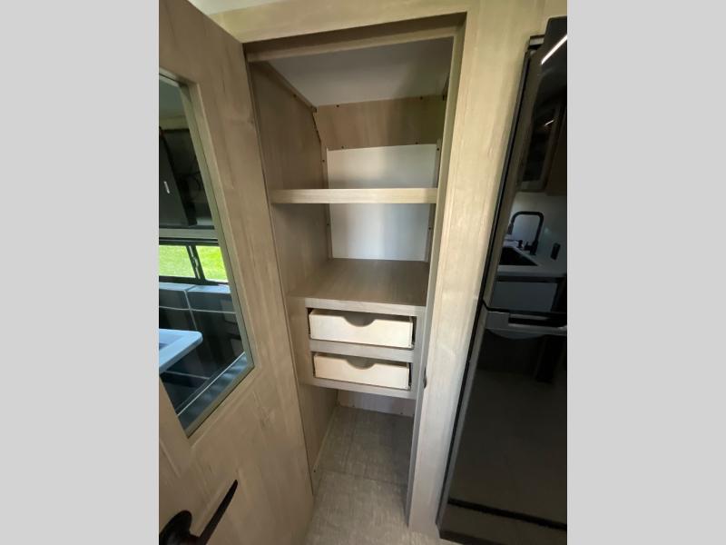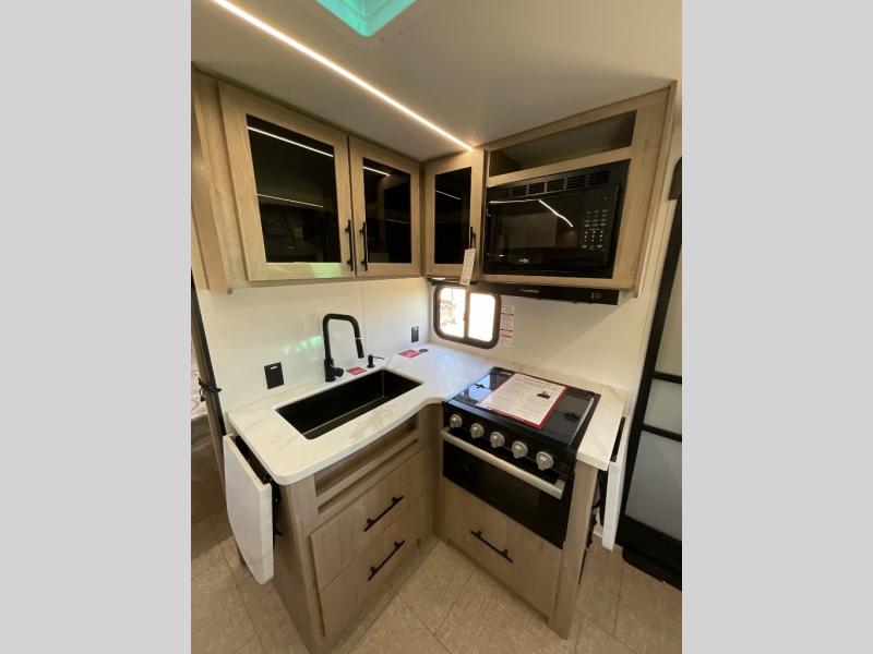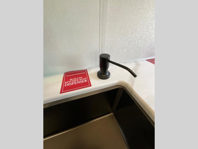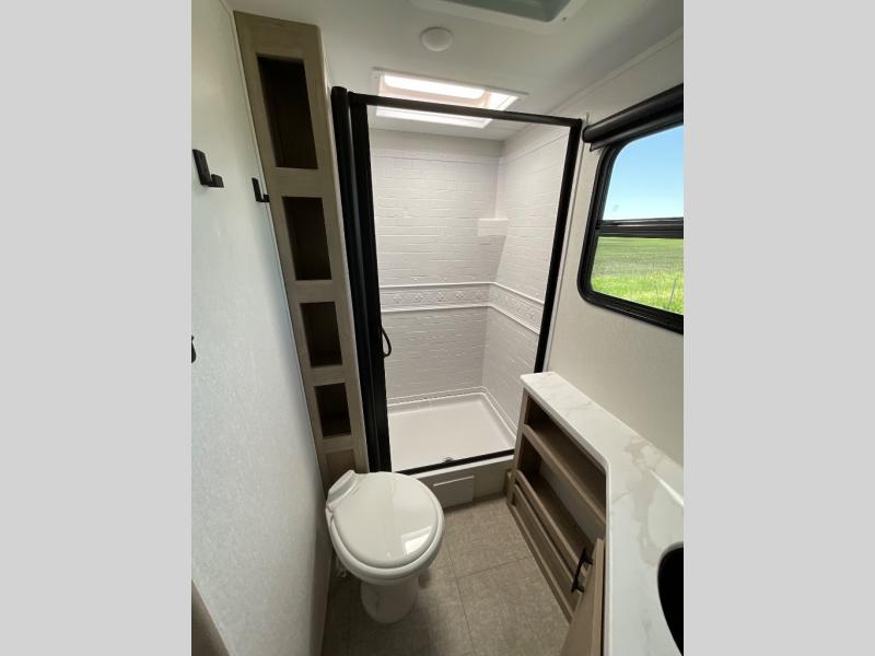 The dual entry doors make it easy to enter and exit this travel trailer! You will find a walk-around queen-size bed up front in the private bedroom, and one of the entry/exit doors to the unit so you can quietly slip out for an early morning fishing trip. The U-shaped dinette is right next to the window, so you can look out at your surroundings while you enjoy breakfast. The double-size bunks have some privacy curtains, and the bunks are right next to the full bathroom for easy access in the middle of the night. The fully equipped kitchen has everything you need to get dinner in the oven, and you can have some more prep space by using the flip-up countertop extension. You even have an outdoor griddle and an outdoor 1.6 cu. ft. refrigerator to enjoy a cold beverage while you cook under the 22' electric awning!