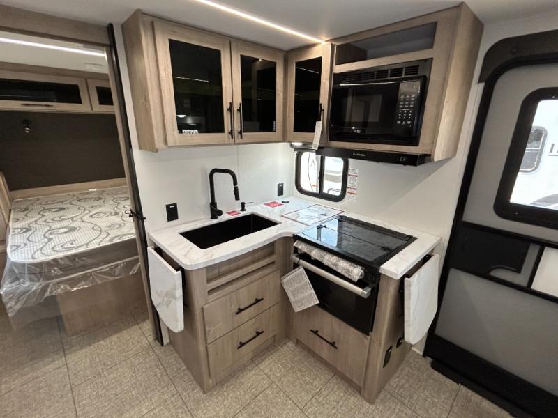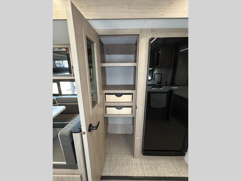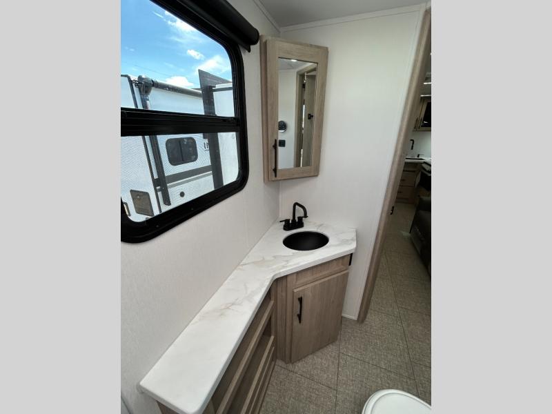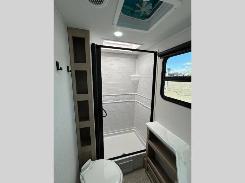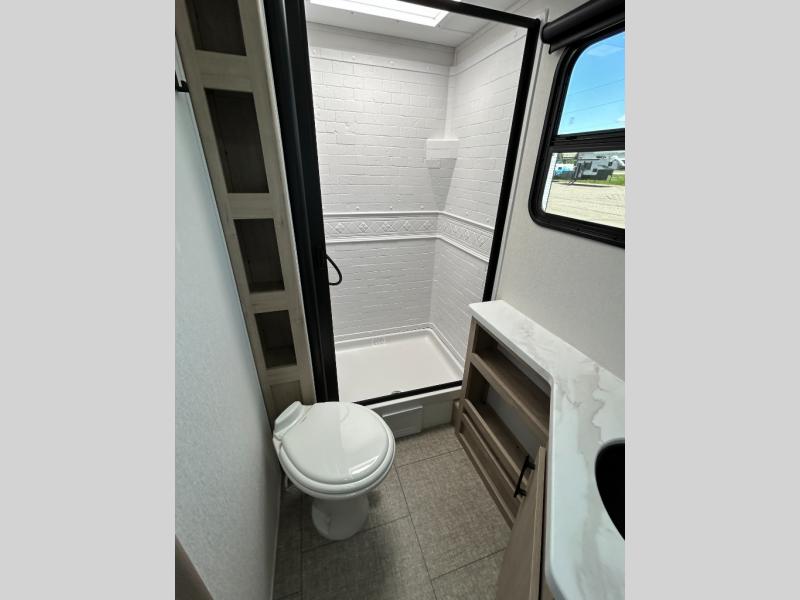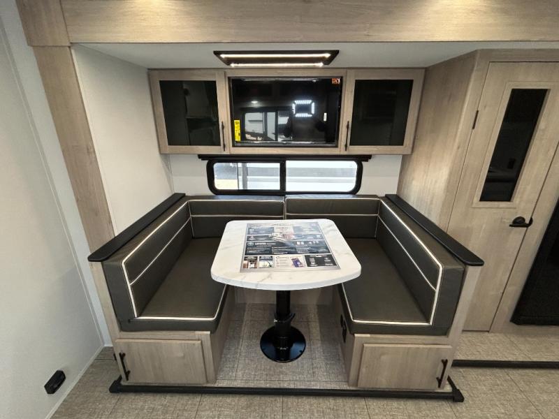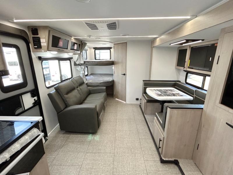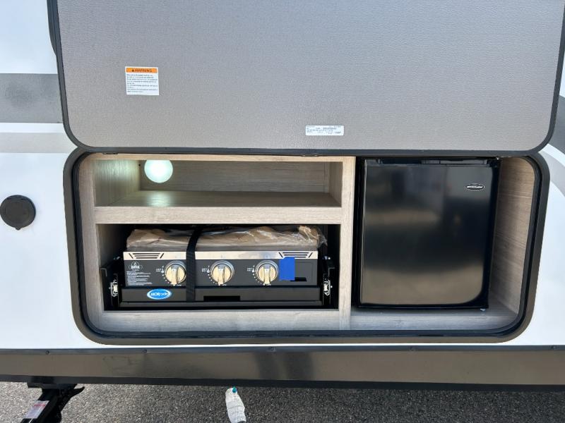 The dual entry doors make it easy to enter and exit this travel trailer! You will find a walk-around queen-size bed up front in the private bedroom, and one of the entry/exit doors to the unit so you can quietly slip out for an early morning fishing trip. The U-shaped dinette is right next to the window, so you can look out at your surroundings while you enjoy breakfast. The double-size bunks have some privacy curtains, and the bunks are right next to the full bathroom for easy access in the middle of the night. The fully equipped kitchen has everything you need to get dinner in the oven, and you can have some more prep space by using the flip-up countertop extension. You even have an outdoor griddle and an outdoor 1.6 cu. ft. refrigerator to enjoy a cold beverage while you cook under the 22' electric awning!