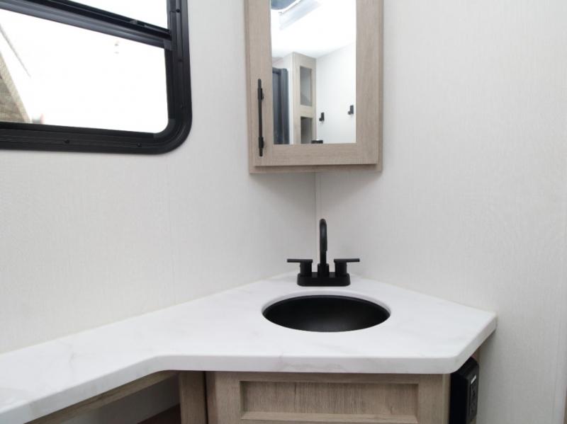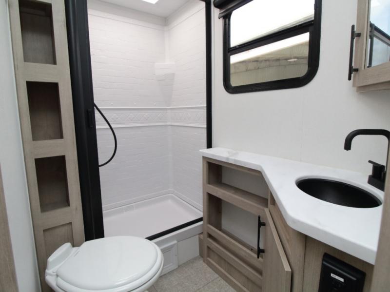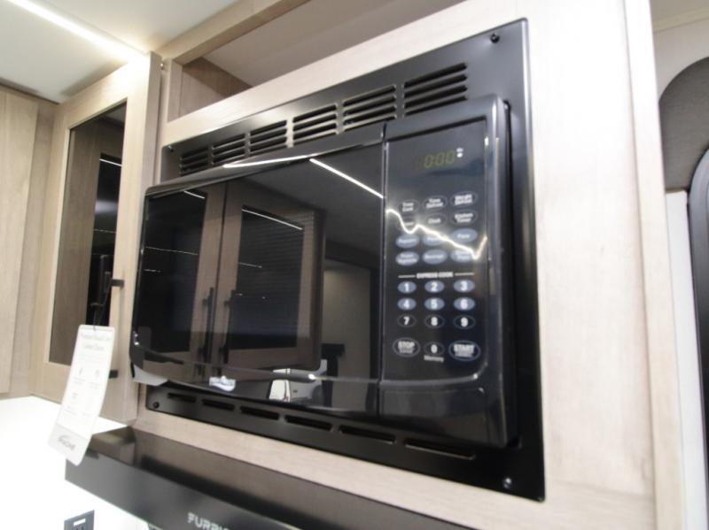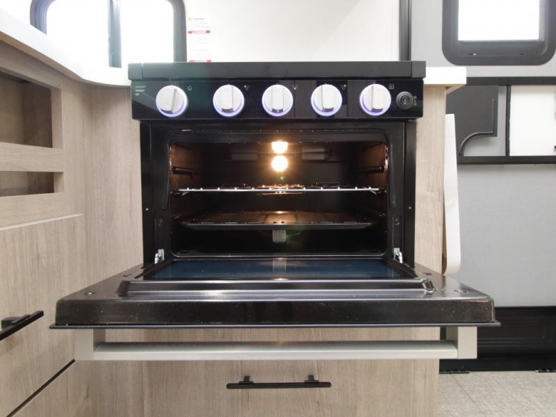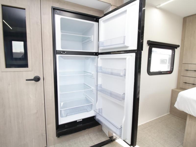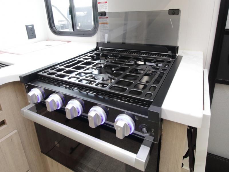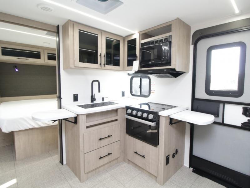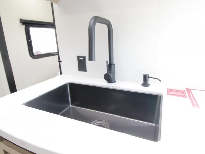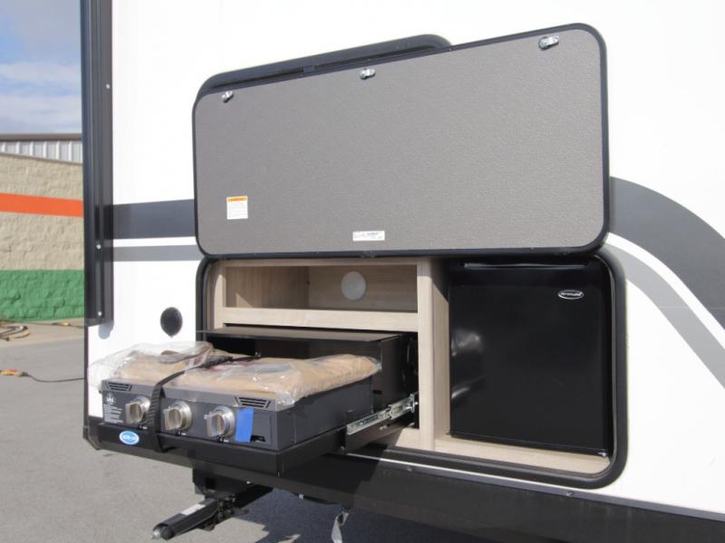 The fully equipped kitchen includes everything needed to prepare meals on the road, plus a flip-up countertop extension that adds valuable prep space. Outside, you can enjoy cooking under the 22’ electric awning thanks to the outdoor griddle and 1.6 cu. ft. refrigerator—ideal for campsite dinners and entertaining.