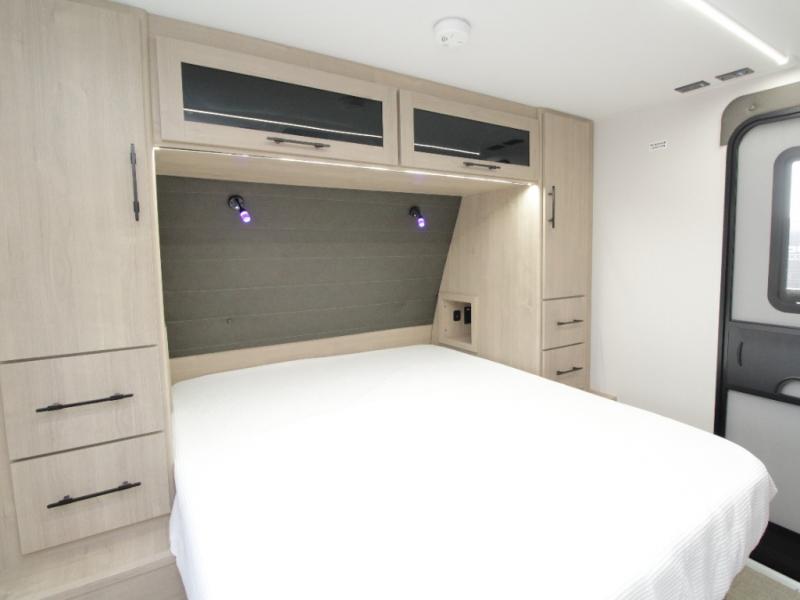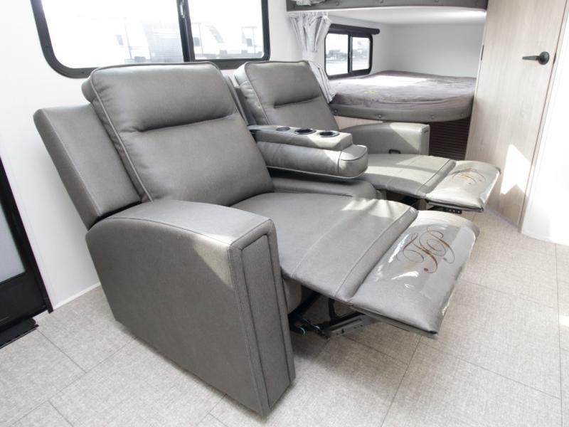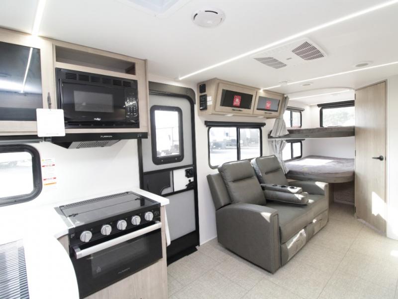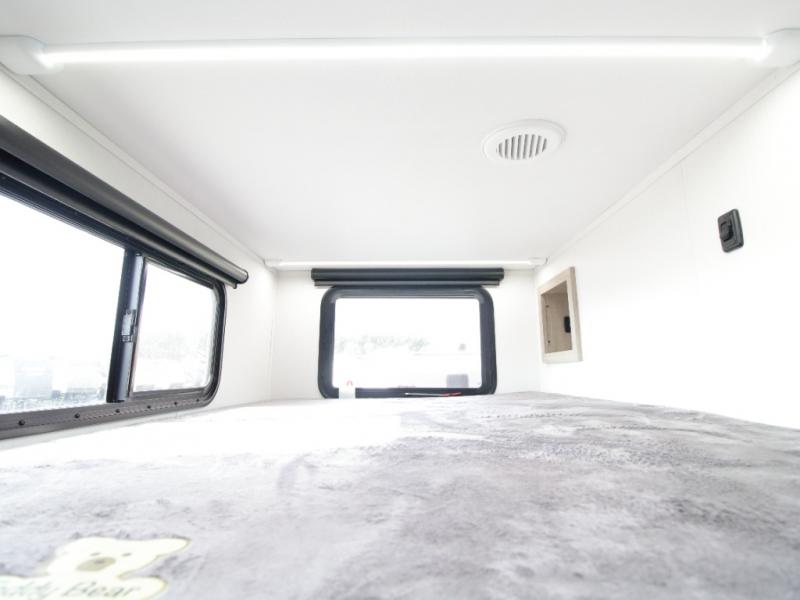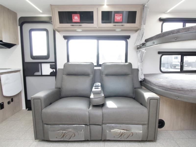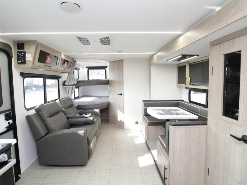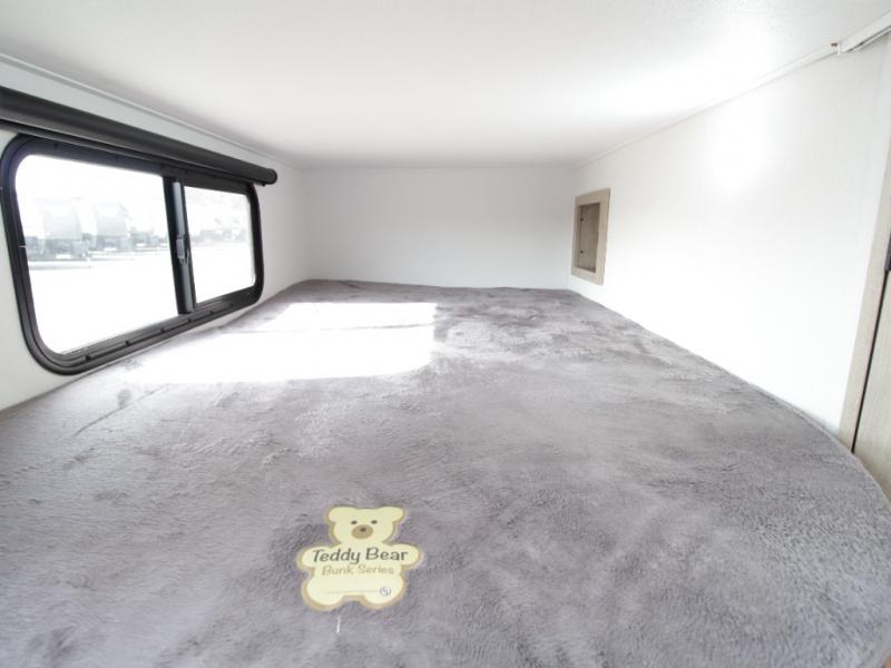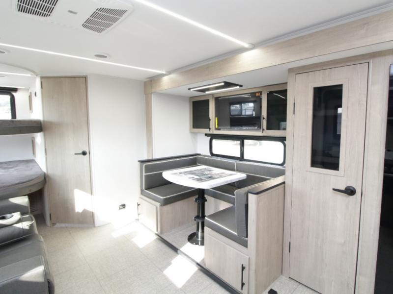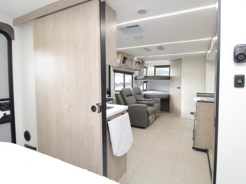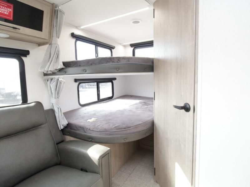 At the rear, double-size bunk beds with privacy curtains offer comfortable sleeping accommodations for kids or guests. Located just steps from the full bathroom, the bunk area provides easy nighttime access and added practicality for families.
