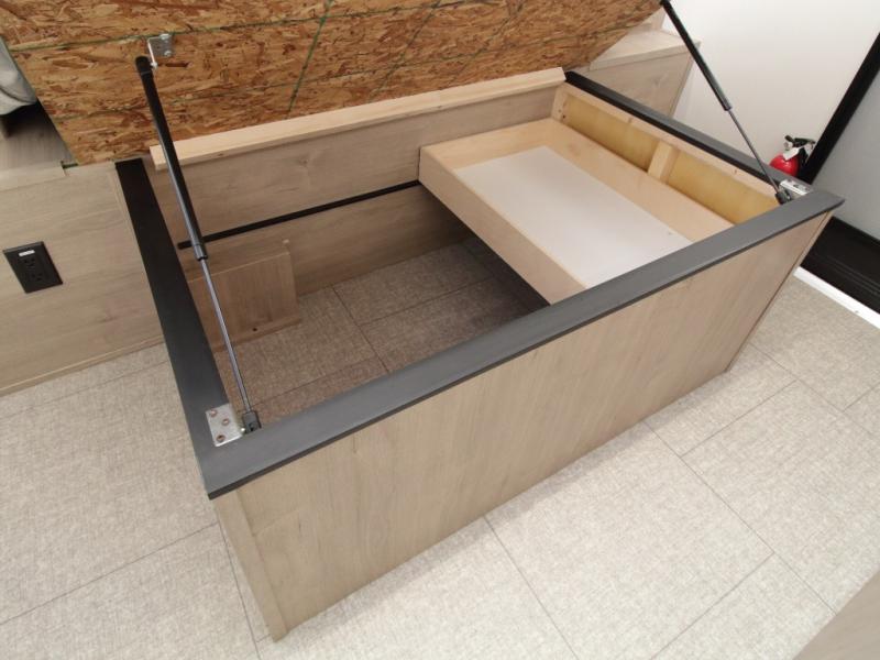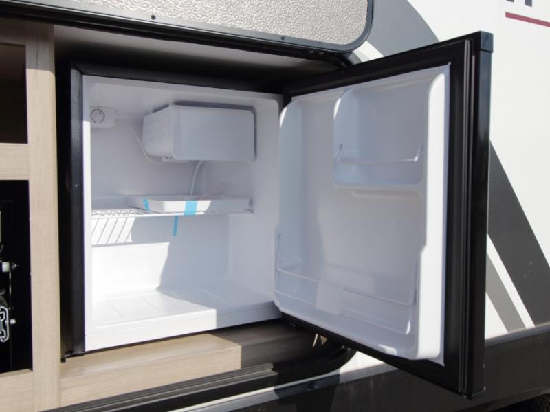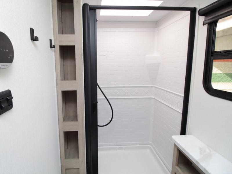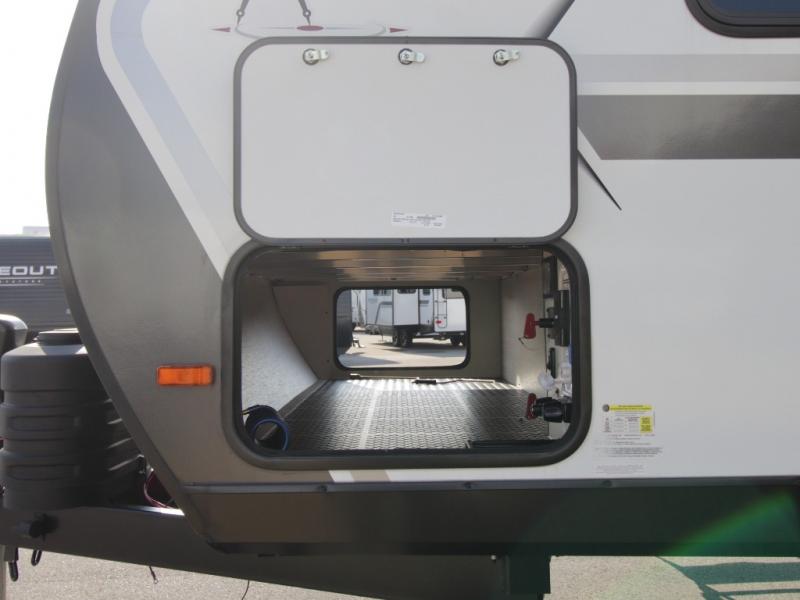Outside, the electric LED-lit awning extends your living space, while Tuff-Ply pass-through flooring is built to handle years of outdoor use. The XLS Solar Package further enhances off-grid capability with a 200W roof-mounted solar panel, a 40 Amp charge controller, a 12V 10 cu. ft. refrigerator, and roof-mounted quick-connect solar prep.