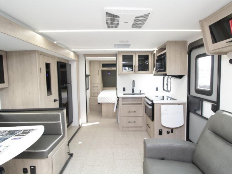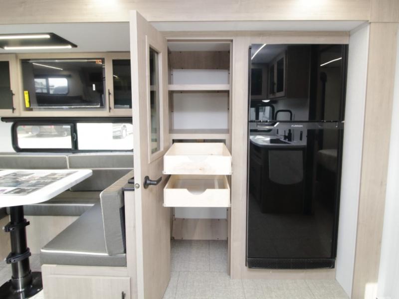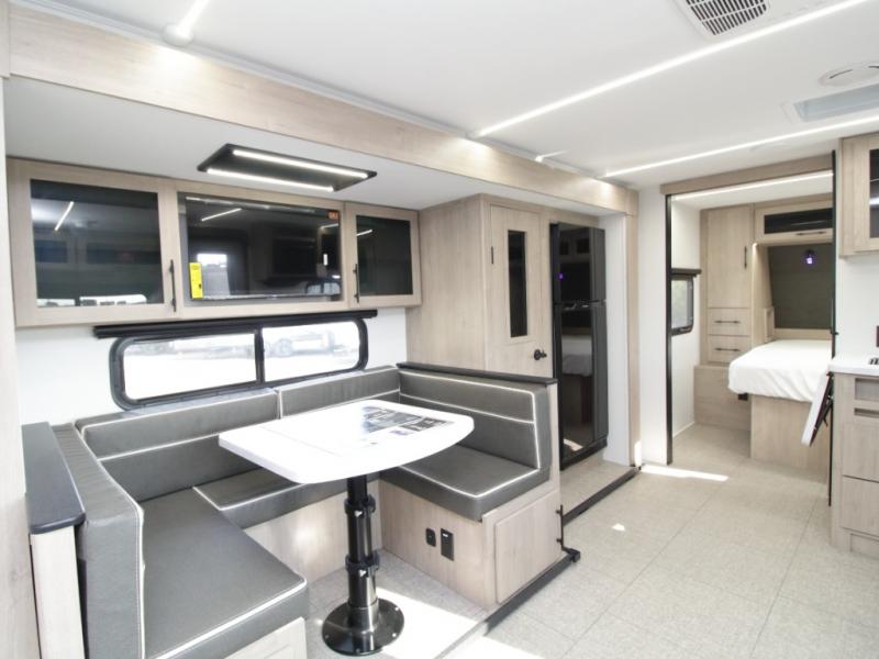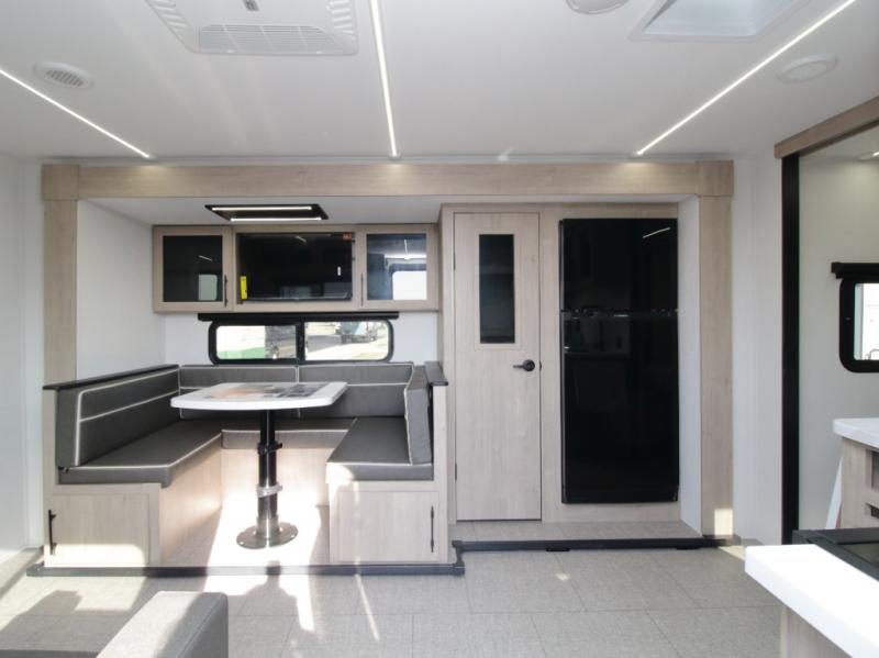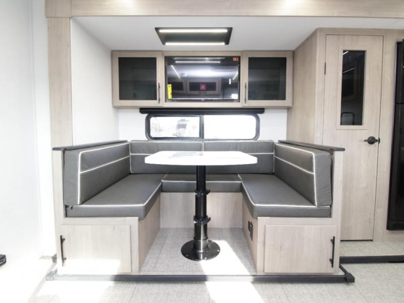 Up front, the private bedroom features a walk-around queen-size bed with ample storage, providing a peaceful retreat at the end of the day. In the main living area, the U-shaped dinette sits next to a large window, creating an inviting space for meals, games, or relaxing while enjoying scenic campground views.