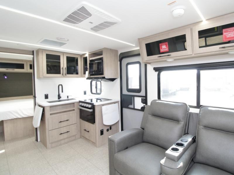 Experience ultimate convenience and outdoor enjoyment with the Grand Design Imagine XLS 25DBE, featuring dual entry doors for easy access and an outdoor griddle for perfect al fresco dining.