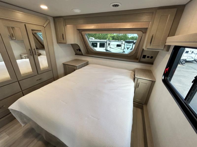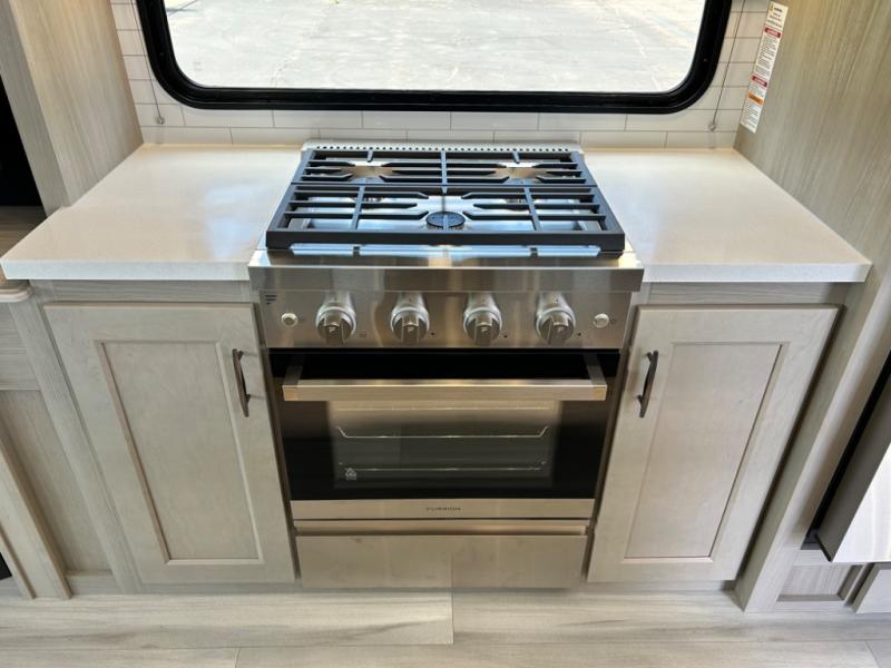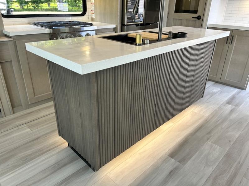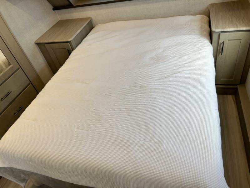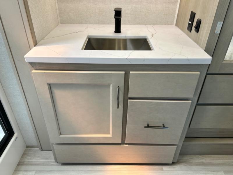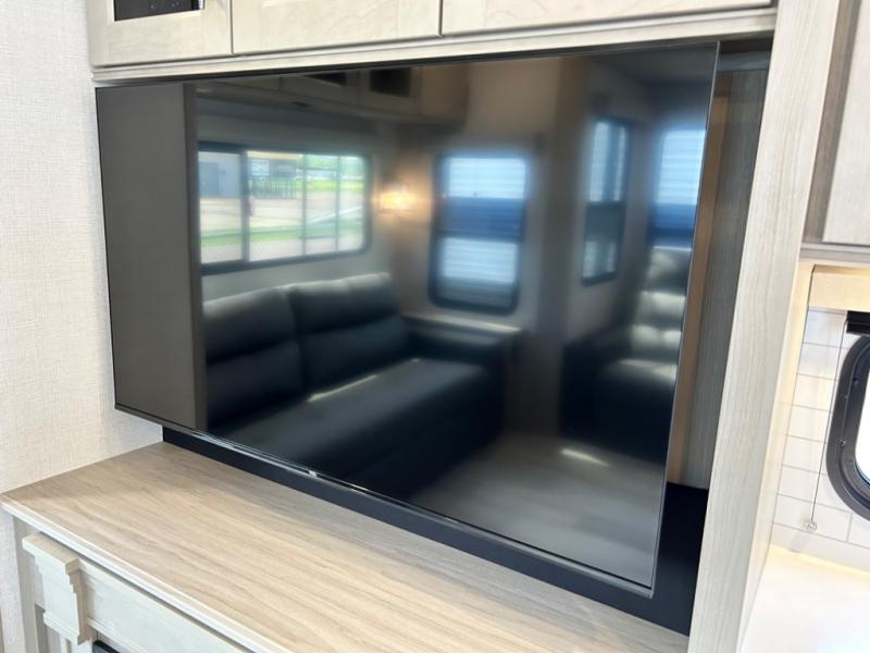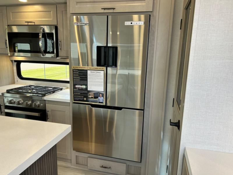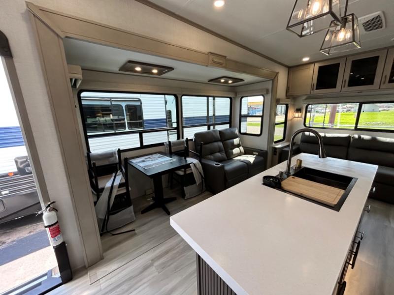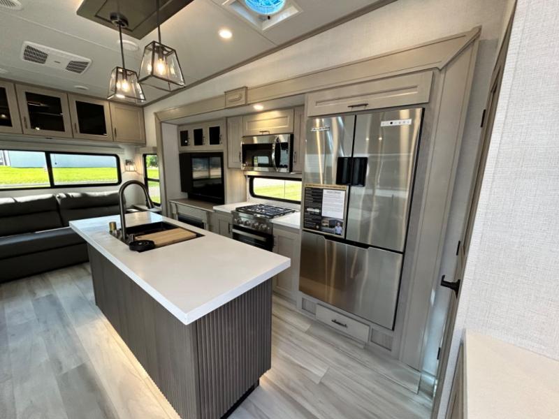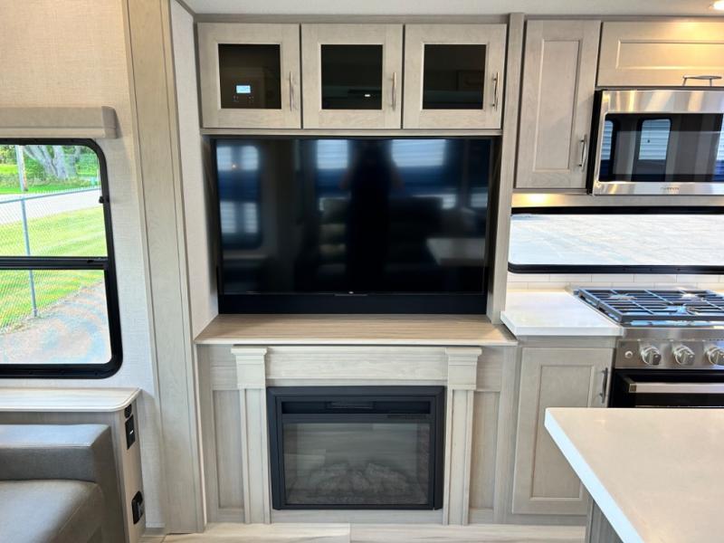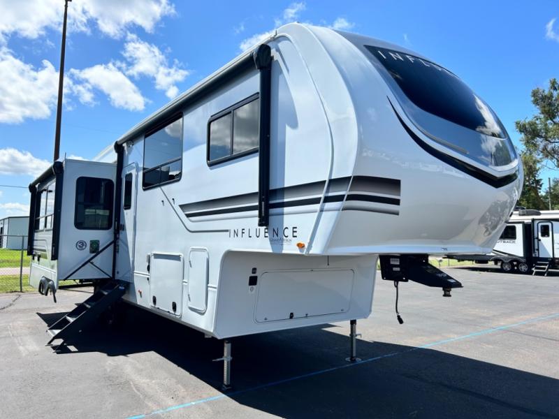 Any Grand Design Influence fifth wheel features five-sided aluminum cage construction with a walk-on roof and a fully enclosed underbelly with heated tanks and storage for all weather camping. For peace of mind, the MORryde CRE3000 Suspension system and ABS braking system will provide safe and smooth towing, and the 101" widebody construction offers all the room you need and that is before multiple slides are fully engaged. You will appreciate the keyed alike locks, slam-latch baggage doors with magnetic door catches, exterior security light, and solid surface entry steps. On the inside, Congoleum flooring, premium roller shades for privacy, a hallway handrail for safety, and nightstands with USB ports to keep all of your electronics fully charged. You will also love the On Demand tankless water heater when showering, plus the added heat and ambiance from an electric fireplace, and so much more!