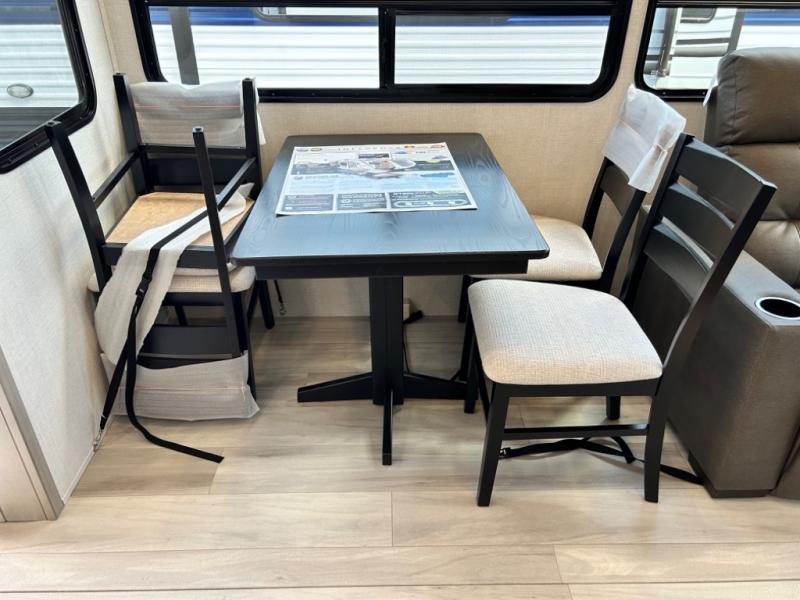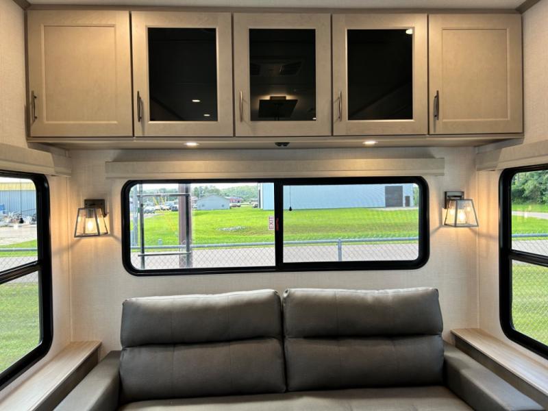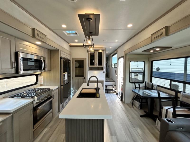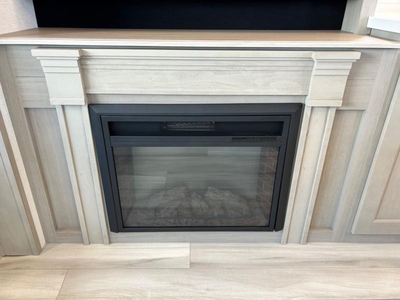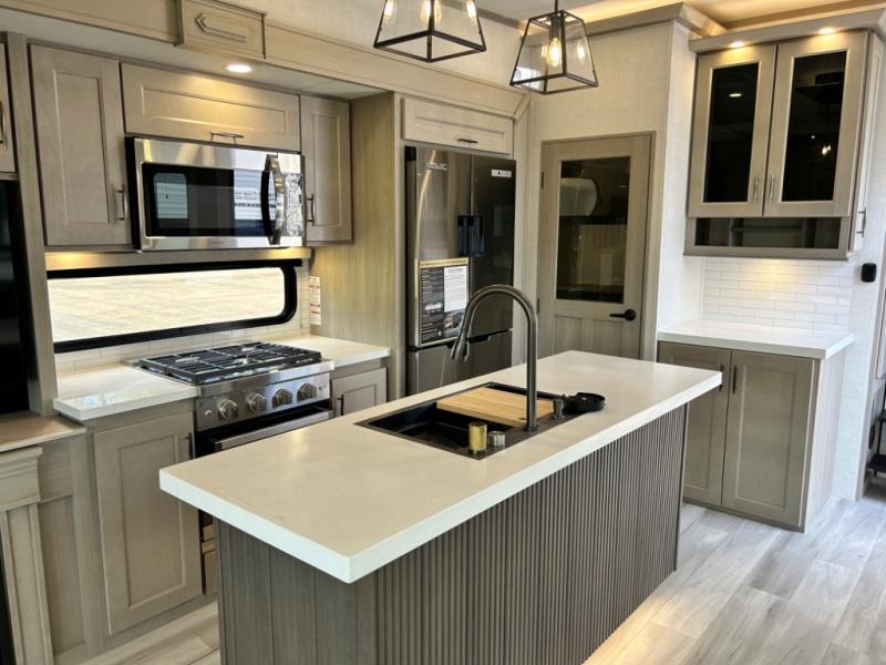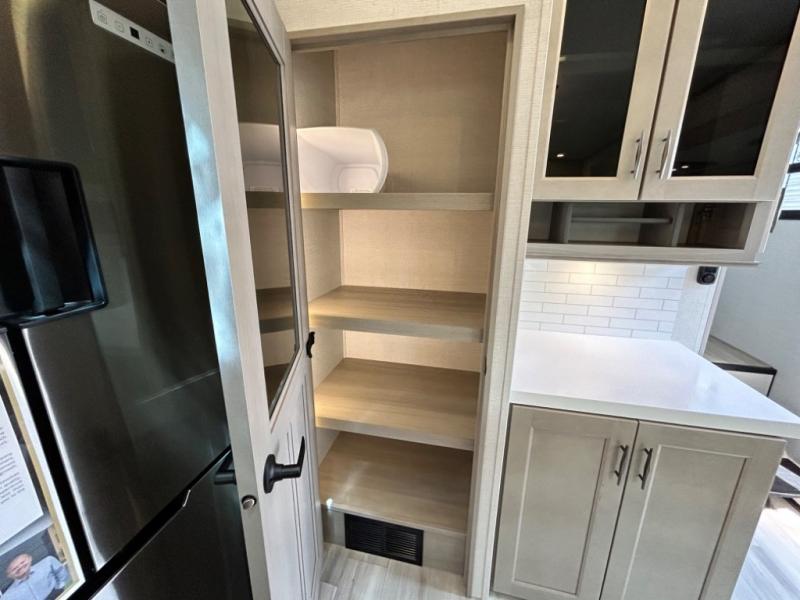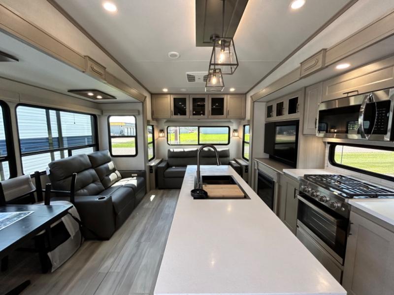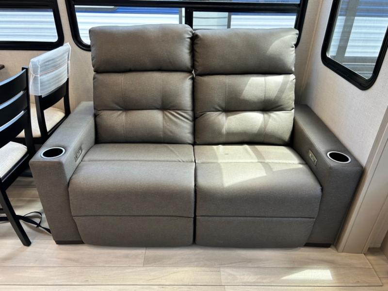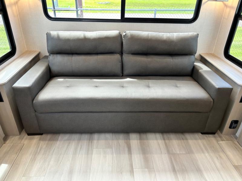 You'll feel right at home in this spacious fifth wheel with triple slides, a front master bedroom, and a kitchen island with extra counter space. The theatre seating is right across from the entertainment center which includes a 40" TV and fireplace, and there is a rear tri-fold sofa if you have any guests staying over. This model includes a hutch in the kitchen with cabinets above to store you nice dishes, plus there is a large pantry with washer and dryer prep if you plan to go full-time. Head to the dual entry bath that includes a linen closet and a spacious shower with a skylight, and check out the front master bedroom with its queen bed, and slide out wardrobe. You can choose the optional king bed if you enjoy a bit more room in bed!