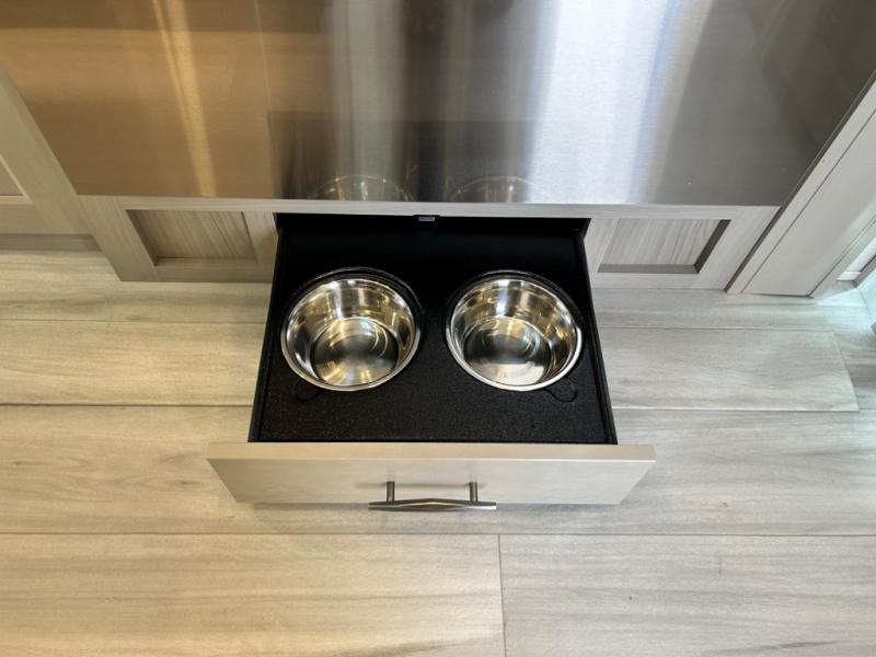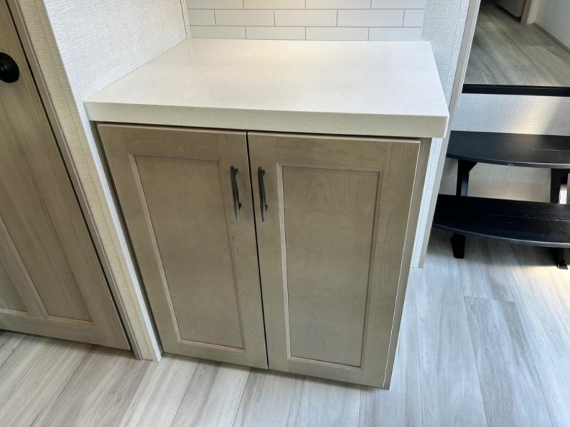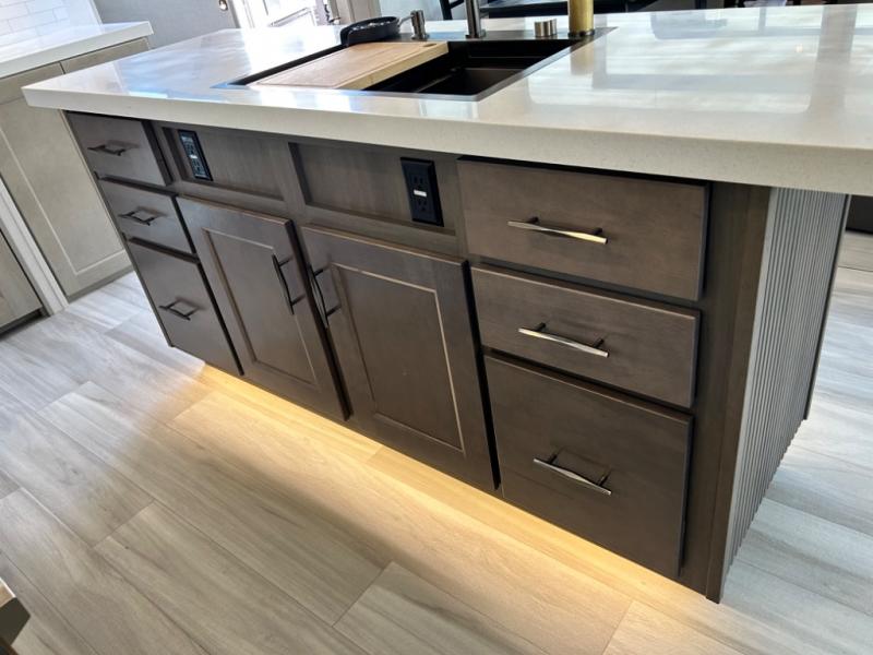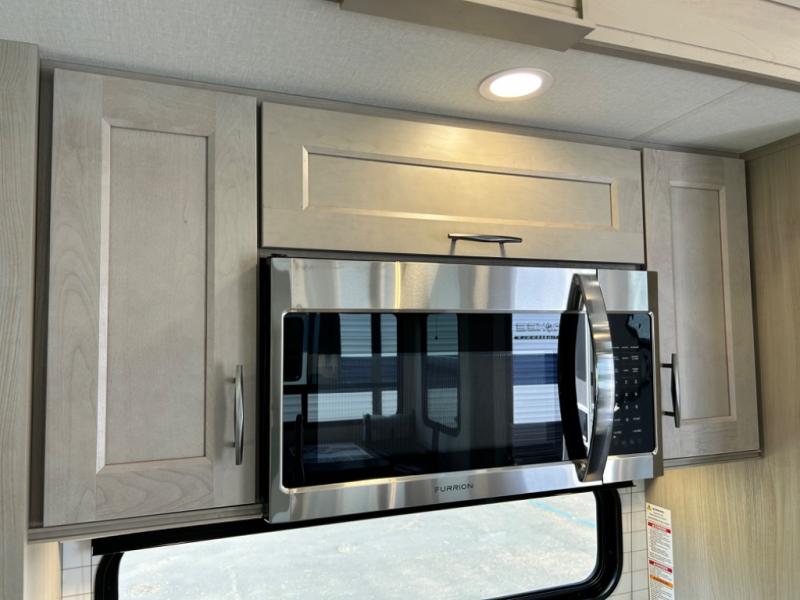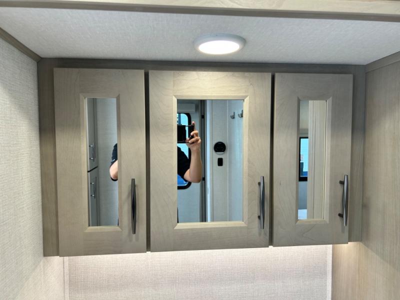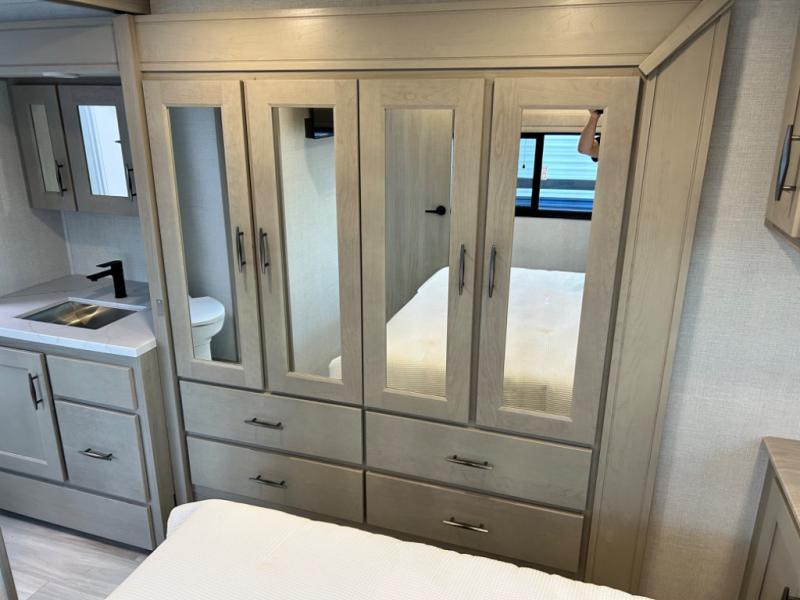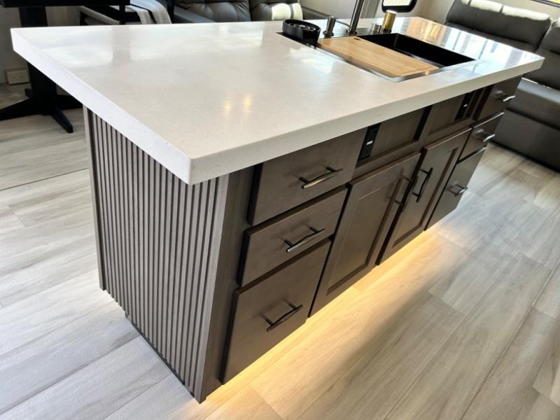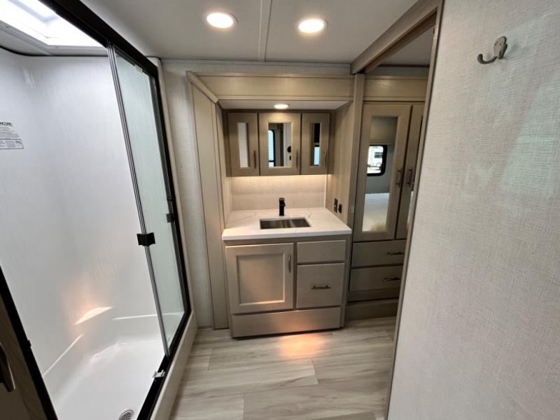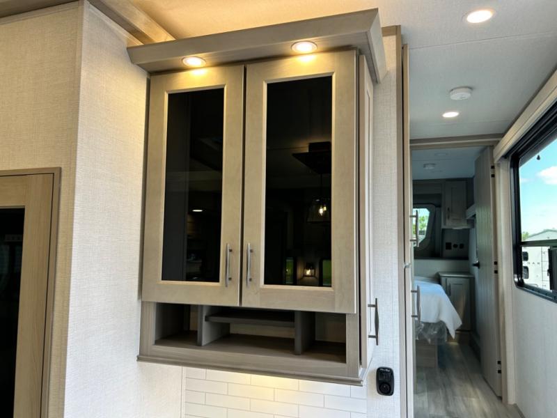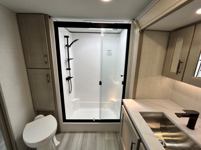 You'll feel right at home in this spacious fifth wheel with triple slides, a front master bedroom, and a kitchen island with extra counter space. The theatre seating is right across from the entertainment center which includes a 40" TV and fireplace, and there is a rear tri-fold sofa if you have any guests staying over. This model includes a hutch in the kitchen with cabinets above to store you nice dishes, plus there is a large pantry with washer and dryer prep if you plan to go full-time. Head to the dual entry bath that includes a linen closet and a spacious shower with a skylight, and check out the front master bedroom with its queen bed, and slide out wardrobe. You can choose the optional king bed if you enjoy a bit more room in bed!