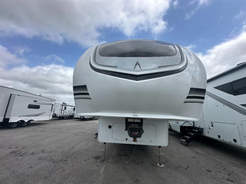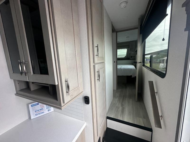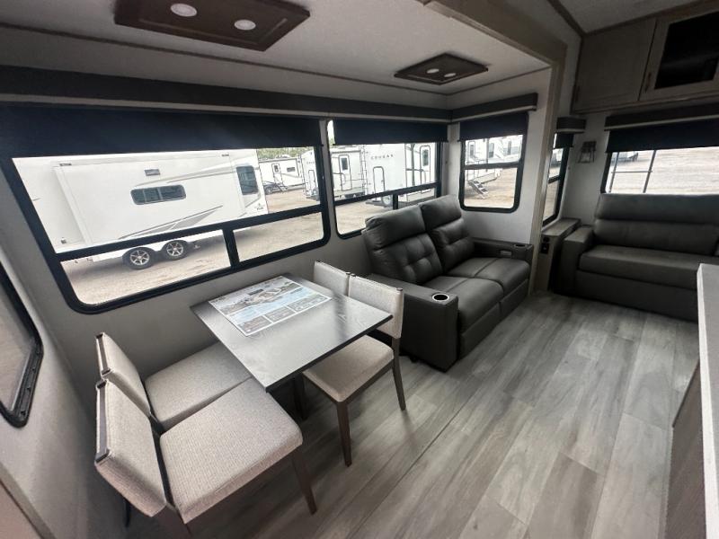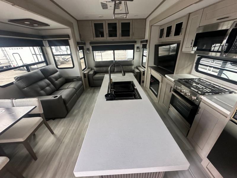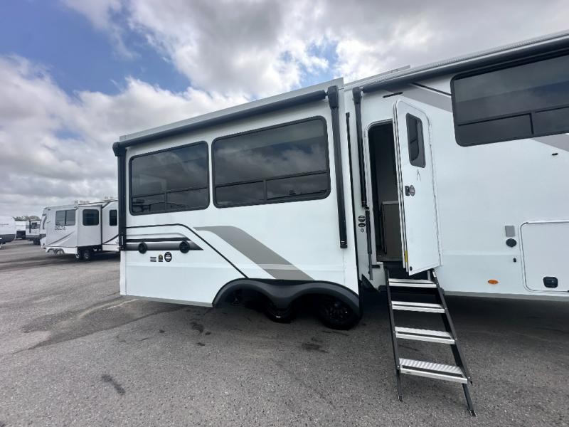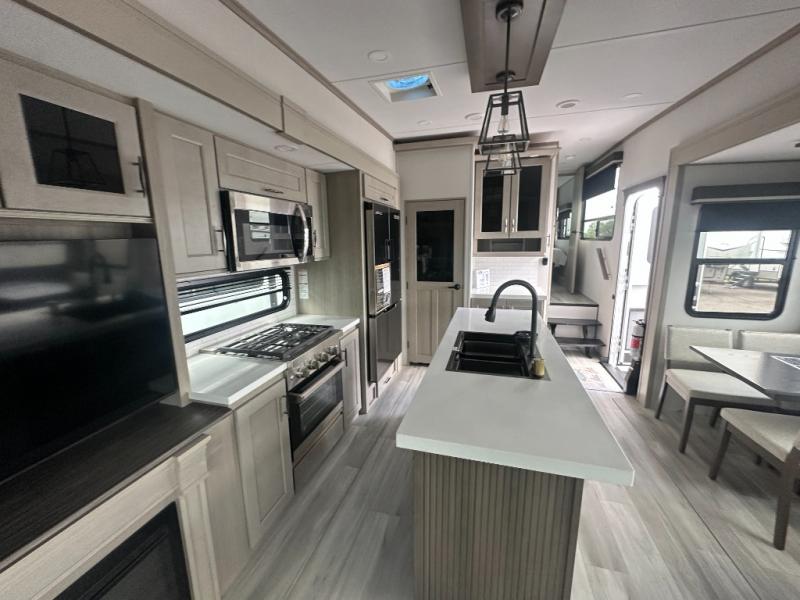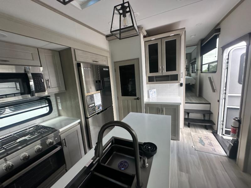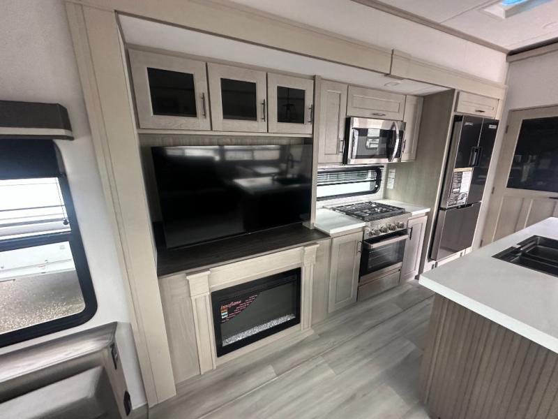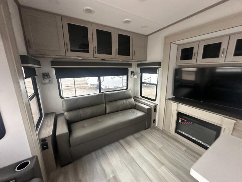 You'll feel right at home in this spacious fifth wheel with triple slides, a front master bedroom, and a kitchen island with extra counter space. The theatre seating is right across from the entertainment center which includes a 40" TV and fireplace, and there is a rear tri-fold sofa if you have any guests staying over. This model includes a hutch in the kitchen with cabinets above to store you nice dishes, plus there is a large pantry with washer and dryer prep if you plan to go full-time. Head to the dual entry bath that includes a linen closet and a spacious shower, and check out the front master bedroom with its queen bed, and slide out wardrobe. You can choose the optional king bed if you enjoy a bit more room in bed!