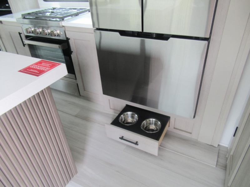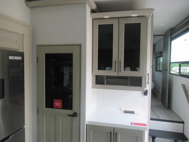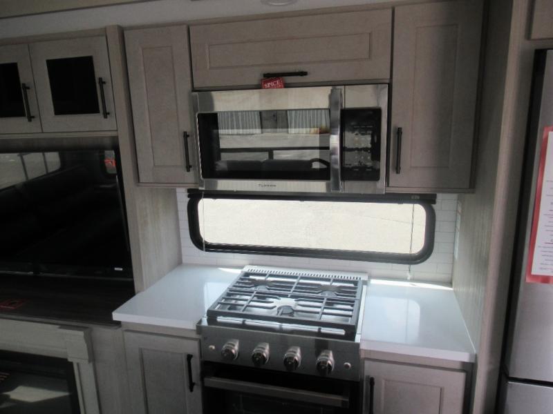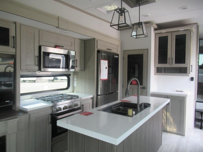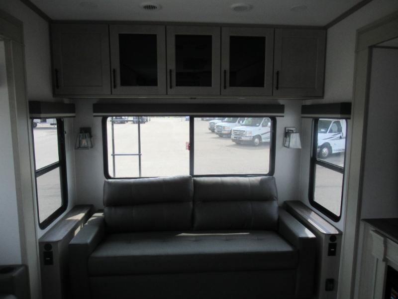 You'll feel right at home in this spacious fifth wheel with triple slides, a front master bedroom, and a kitchen island with extra counter space. The theatre seating is right across from the entertainment center which includes a 40" TV and fireplace, and there is a rear tri-fold sofa if you have any guests staying over. This model includes a hutch in the kitchen with cabinets above to store you nice dishes, plus there is a large pantry with washer and dryer prep if you plan to go full-time. Head to the dual entry bath that includes a linen closet and a spacious shower, and check out the front master bedroom with its queen bed, and slide out wardrobe. You can choose the optional king bed if you enjoy a bit more room in bed!