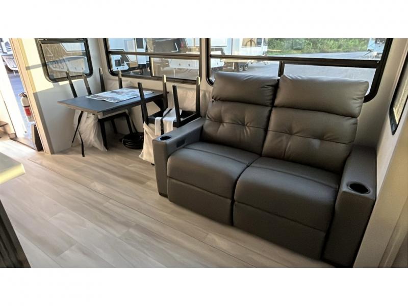 A perfect fifth wheel featuring triple slides and a tri-fold sofa for overnight guests! You will love the spacious interior thanks to the dual opposing slides in the main living and kitchen area. Here you will find a kitchen island in the center and plenty of seating with a free standing dinette, theater seating for movie night opposite the fireplace and entertainment center, as well as a tri-fold sofa. The kitchen offers all of the amenities just like home, a 16 cu. ft. 12-volt refrigerator for your perishables, and a hutch with an electronics drawer to keep your gadgets organized. There is even a pet dish under the refrigerator for your furry friends. The spacious full bath includes a 48" x 30" shower, dual linen closets, and an accessory drawer for necessities. You'll love the front bedroom with its queen bed slide out, slide top dresser, front wardrobe with washer and dryer prep, plus a pass-thru clothes hamper between the bedroom and bath; how convenient!