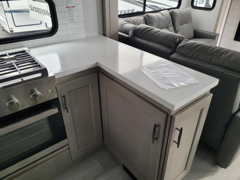 It will be so easy to enjoy camping trips in this triple slide out fifth wheel! You can wake up each morning in your own master bedroom with a queen bed slide out, a spacious closet with a clothes hamper plus washer and dryer prep, and a slide top dresser. You'll also find a private entry door into the dual entry bath and an accessory drawer to keep bath necessities organized. If you had any guests stay over, they can sleep on the L-shaped sofa with recliners. The chef of your group will love the rear kitchen with its U-shaped counterspace, ample storage, and 16 cu. ft. 12V refrigerator. There is even a convenient pull-out pet dish for your furry friends. Head outside to find two power awnings, exterior storage, and an exterior spray port to wash off hiking gear!