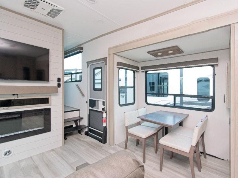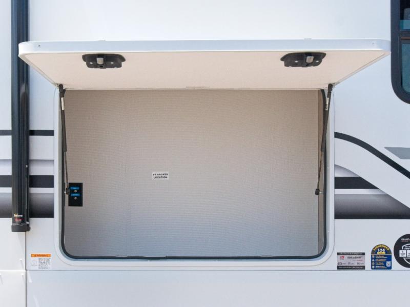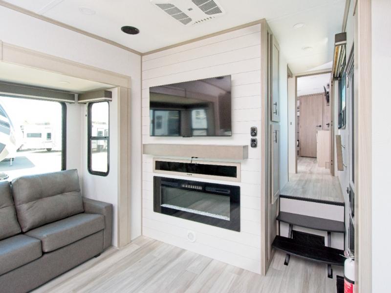 You'll appreciate the Keyed-Alike locks, slam-latch baggage doors with magnetic catches, exterior security light, and SolidStep entry steps. Inside, enjoy Congoleum flooring, premium roller shades for privacy, a hallway handrail for safety, and nightstands with USB ports to keep your electronics charged. Plus, the On Demand tankless water heater offers endless hot showers, and the electric fireplace adds warmth and ambiance.