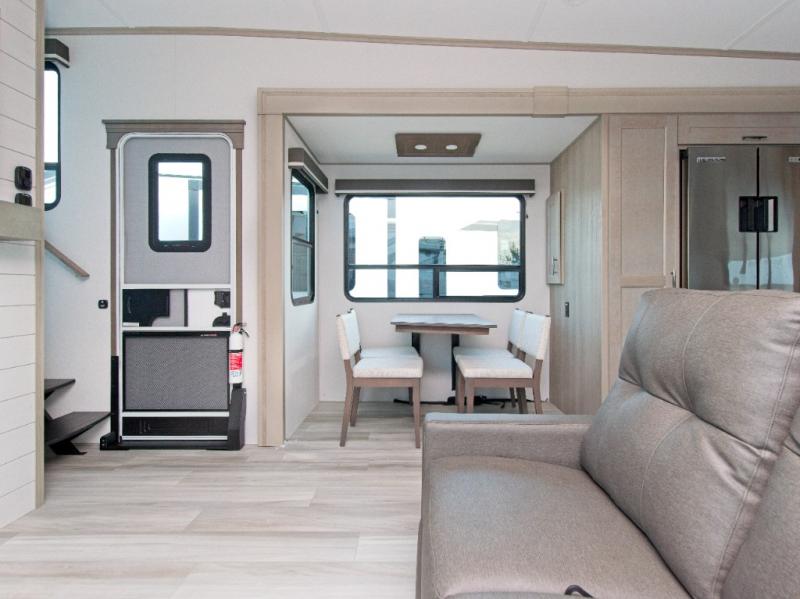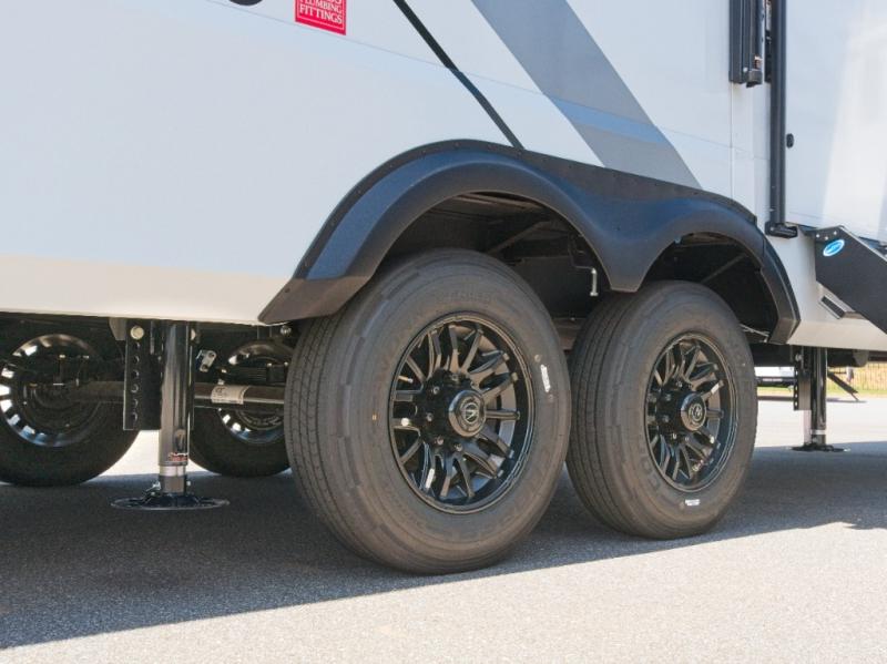 The Grand Design Influence fifth wheel is designed for all-weather camping with its five-sided aluminum cage construction, walk-on roof, and fully enclosed underbelly with heated tanks and storage. The MORryde CRE3000 Suspension system ensures safe and smooth towing, while the 101" widebody construction provides plenty of room, even with multiple slides engaged.