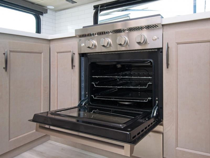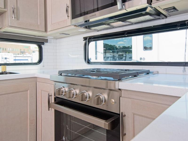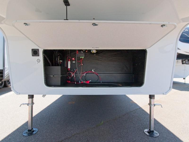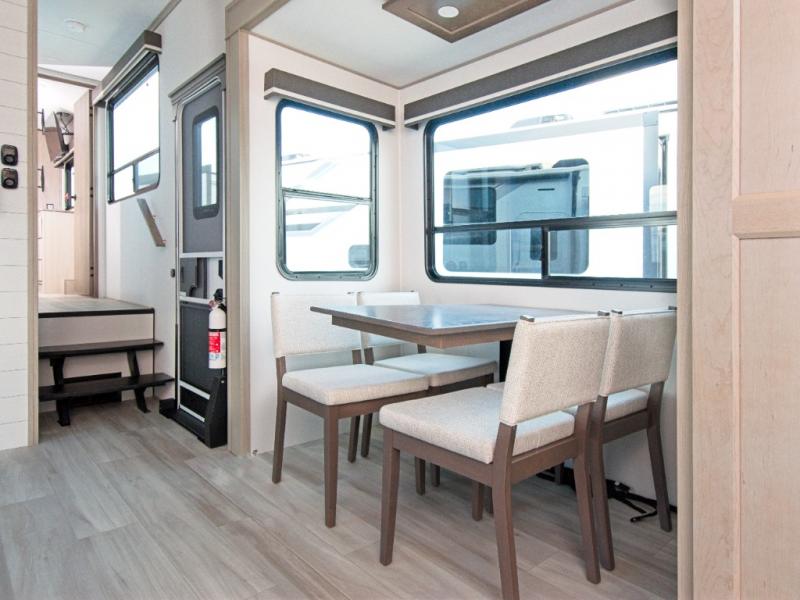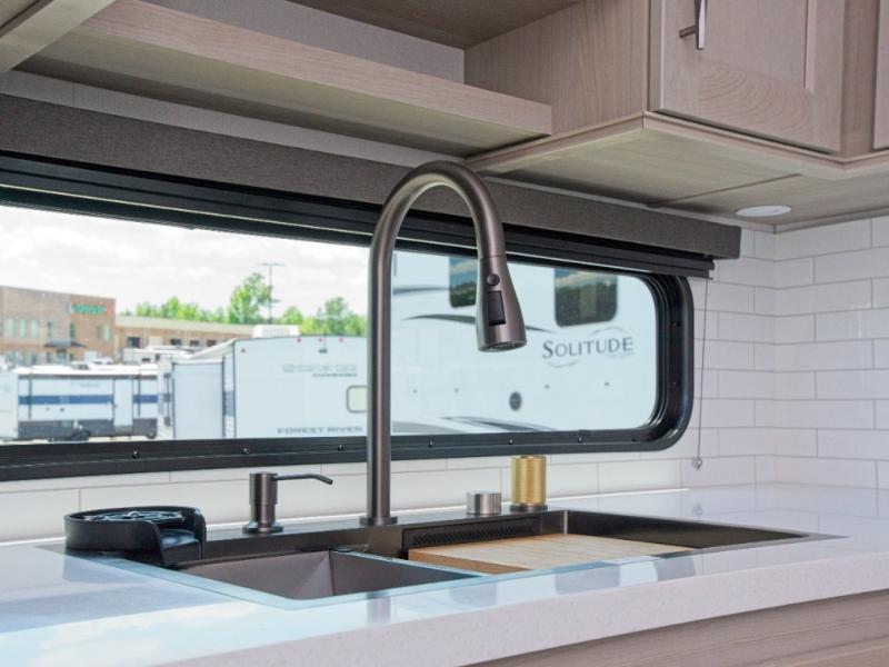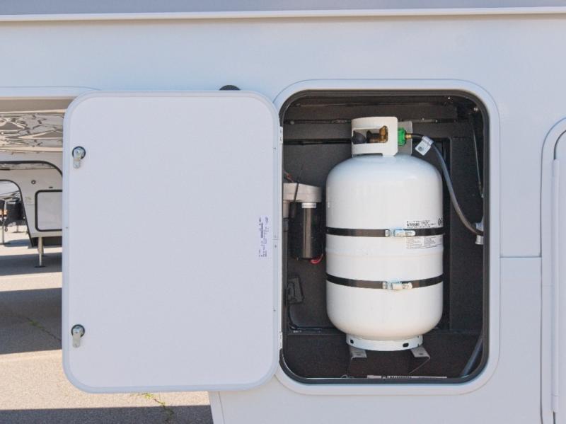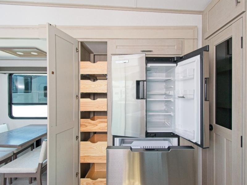 The chef in your group will be thrilled with the rear kitchen, featuring a U-shaped counter, ample storage, and a 16 cu. ft. 12V refrigerator. There's even a pull-out pet dish for your furry friends! Head outside to enjoy two power awnings, exterior storage, and an exterior spray port to wash off your hiking gear.