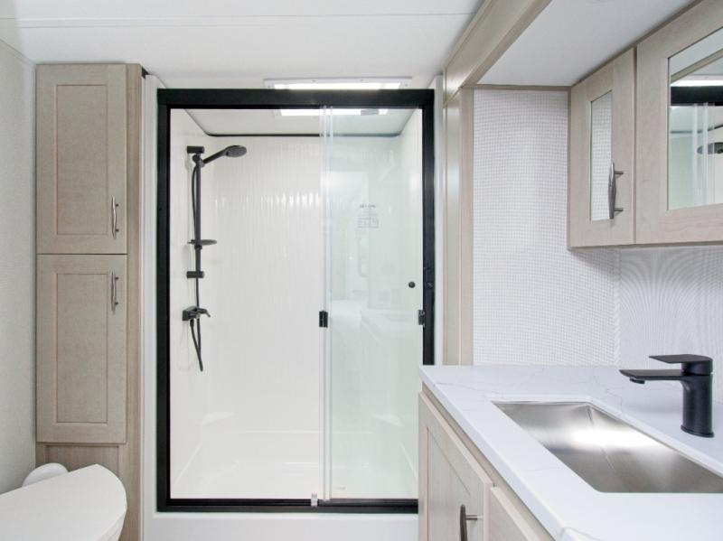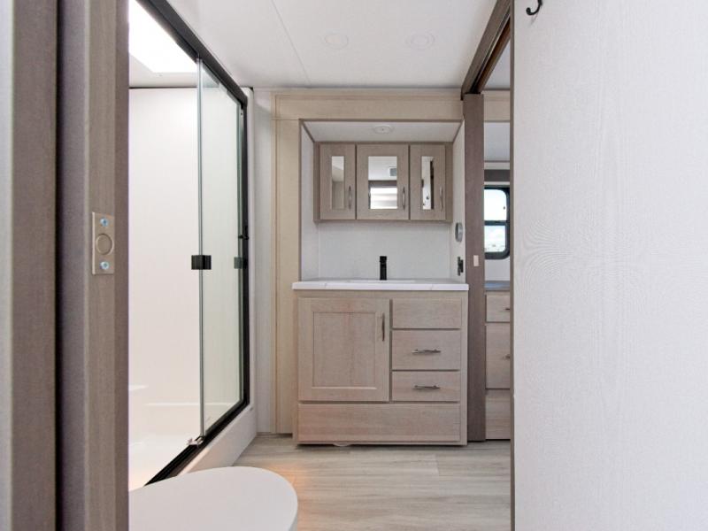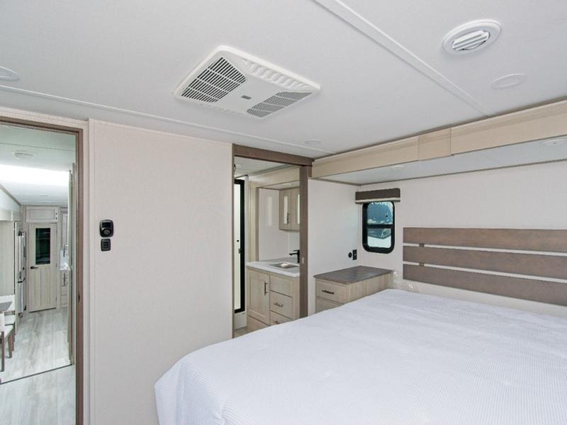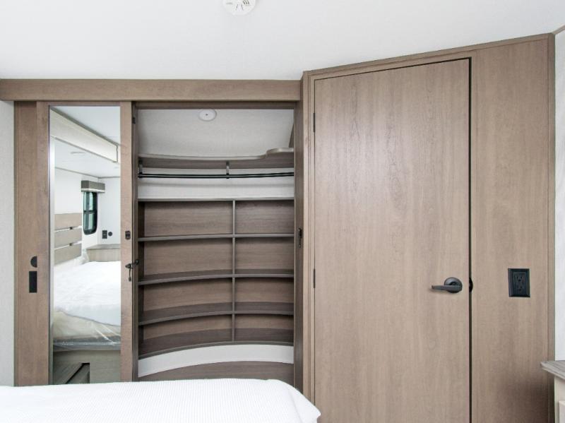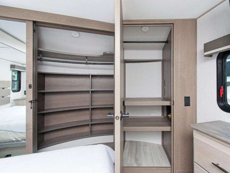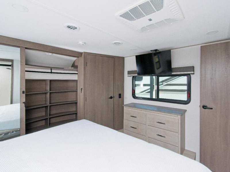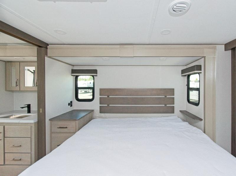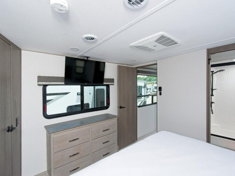 Imagine waking up each morning in your own cozy master bedroom, complete with a queen bed slide-out, a spacious closet with a clothes hamper, and washer and dryer prep. You'll love the slide-top dresser for extra storage and the private entry into the dual-entry bath, where you can keep all your bath necessities organized in the accessory drawer. If you have guests, they can sleep comfortably on the L-shaped sofa with recliners.