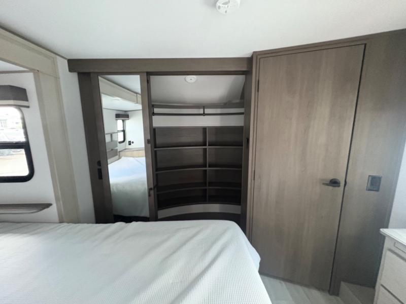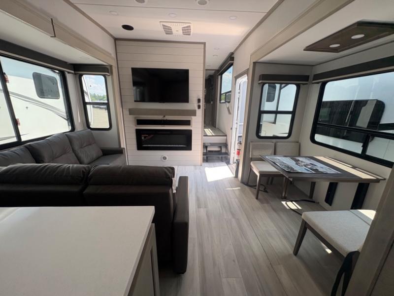 Any Grand Design Influence fifth wheel features five-sided aluminum cage construction with a walk-on roof and a fully enclosed underbelly with heated tanks and storage for all weather camping. For peace of mind, the MORryde CRE3000 Suspension system will provide safe and smooth towing, and the 101" widebody construction offers all the room you need and that is before multiple slides are fully engaged. You will appreciate the Keyed-Alike locks, slam-latch baggage doors with magnetic door catches, exterior security light, and SolidStep entry steps. On the inside, Congoleum flooring, premium roller shades for privacy, a hallway handrail for safety, and nightstands with USB ports to keep all of your electronics fully charged. You will also love the On Demand tankless water heater when showering, plus the added heat and ambiance from an electric fireplace, and so much more!