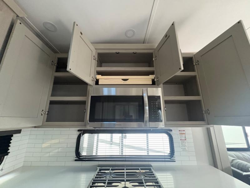 Gourmet Kitchen: Equipped with a 16 cu. ft. 12V refrigerator, a three-burner cooktop with oven, a microwave, and solid surface countertops, the kitchen is perfect for preparing meals on the go.?