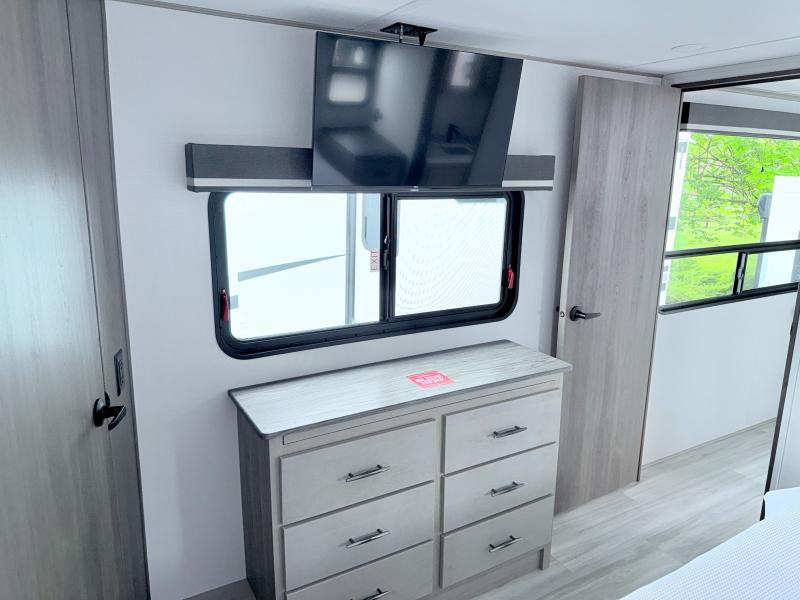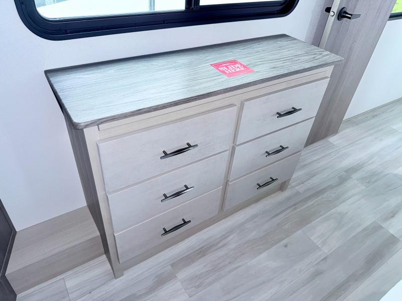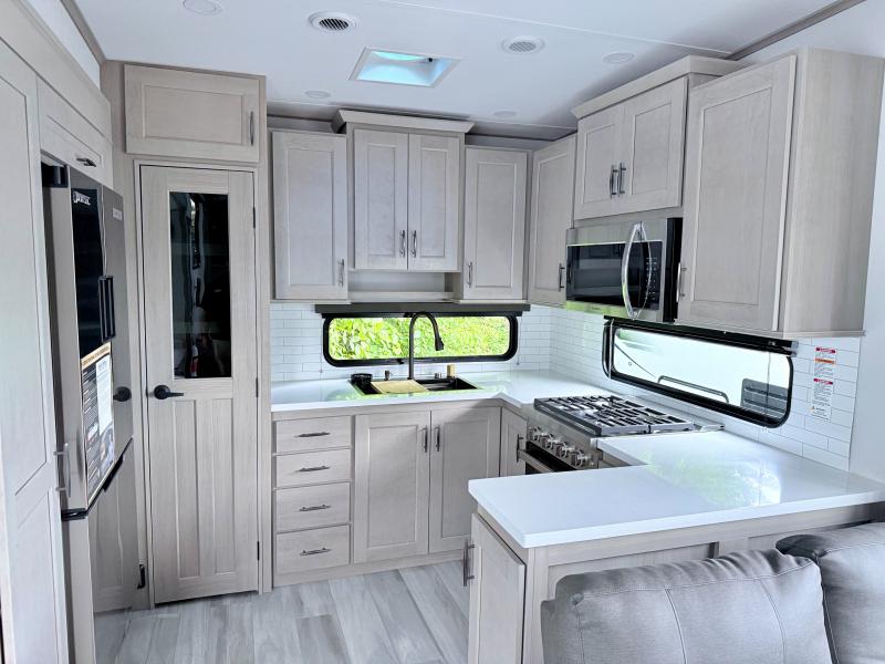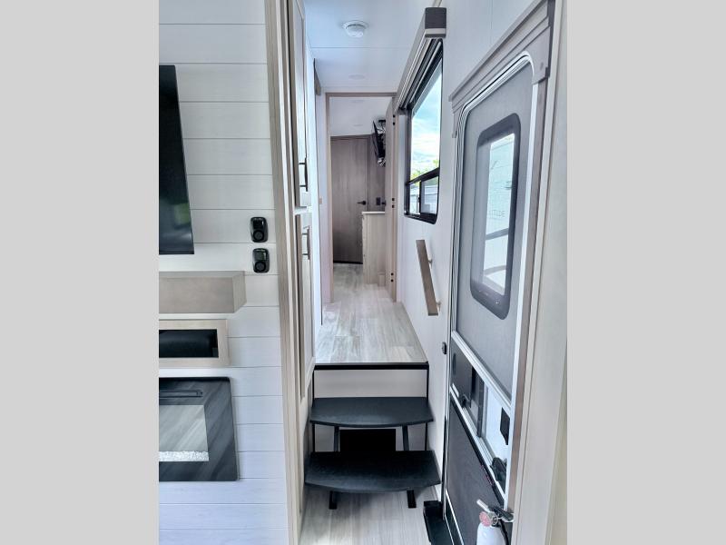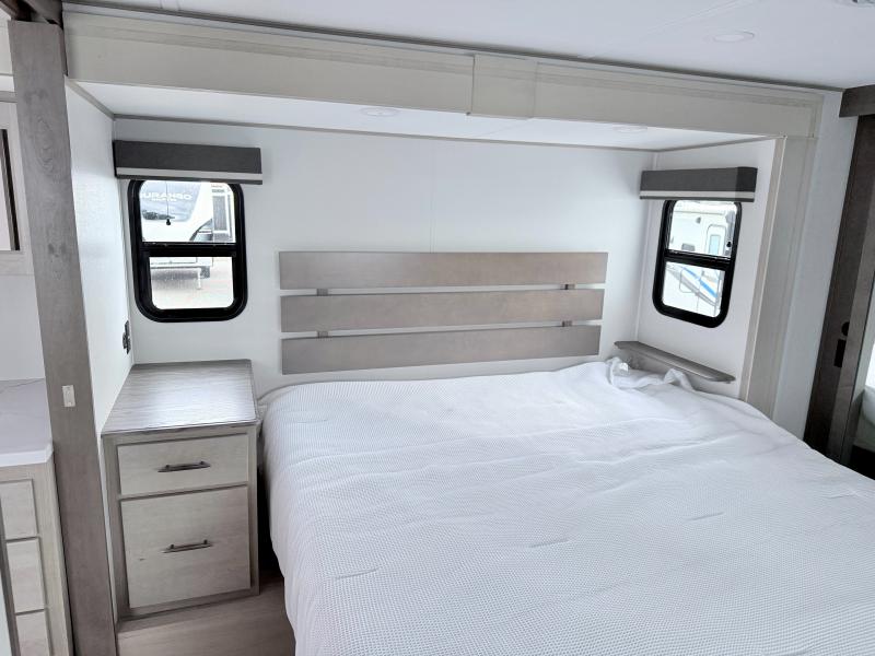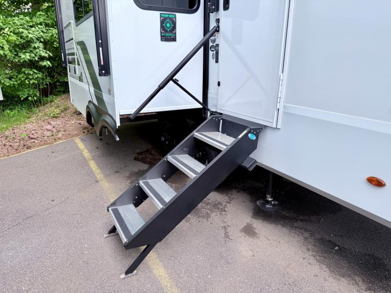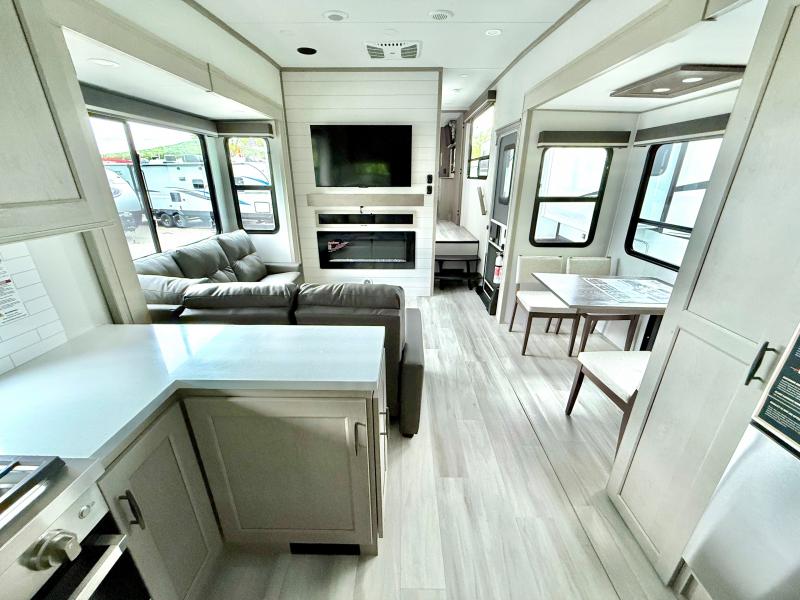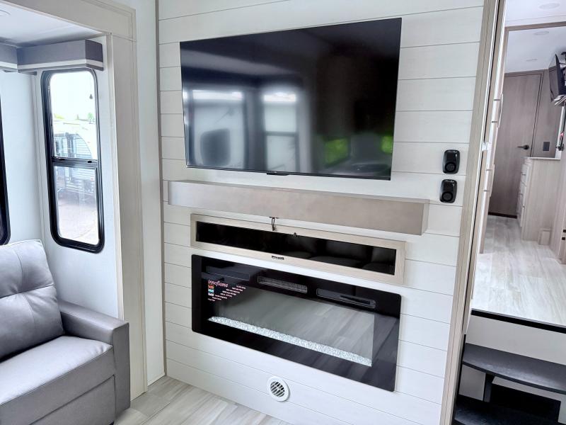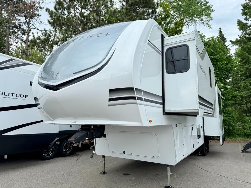 Any Grand Design Influence fifth wheel features five-sided aluminum cage construction with a walk-on roof and a fully enclosed underbelly with heated tanks and storage for all weather camping. For peace of mind, the MORryde CRE3000 Suspension system will provide safe and smooth towing, and the 101" widebody construction offers all the room you need and that is before multiple slides are fully engaged. You will appreciate the Keyed-Alike locks, slam-latch baggage doors with magnetic door catches, exterior security light, and SolidStep entry steps. On the inside, Congoleum flooring, premium roller shades for privacy, a hallway handrail for safety, and nightstands with USB ports to keep all of your electronics fully charged. You will also love the On Demand tankless water heater when showering, plus the added heat and ambiance from an electric fireplace, and so much more!