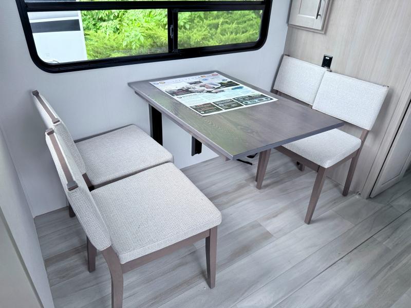 It will be so easy to enjoy camping trips in this triple slide out fifth wheel! You can wake up each morning in your own master bedroom with a queen bed slide out, a spacious closet with a clothes hamper plus washer and dryer prep, and a slide top dresser. You'll also find a private entry door into the dual entry bath and an accessory drawer to keep bath necessities organized. If you had any guests stay over, they can sleep on the L-shaped sofa with recliners. The chef of your group will love the rear kitchen with its U-shaped counterspace, ample storage, and 16 cu. ft. 12V refrigerator. There is even a convenient pull-out pet dish for your furry friends. Head outside to find two power awnings, exterior storage, and an exterior spray port to wash off hiking gear!