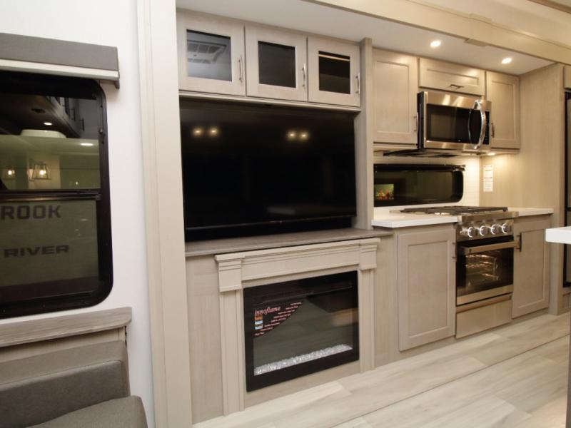 The 2025 Grand Design Influence 3503GK delivers residential luxury on the road with a spacious kitchen island and a cozy electric fireplace—perfect for couples who love to travel in comfort.