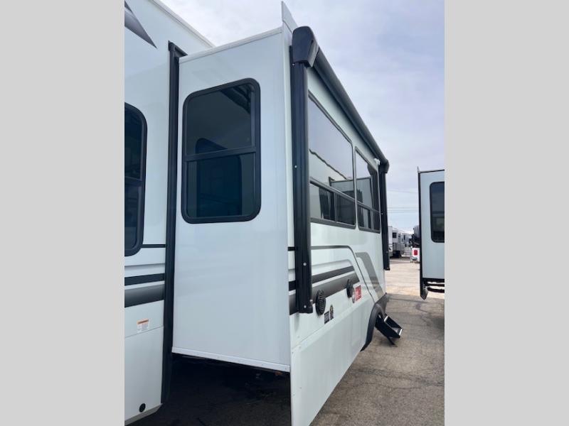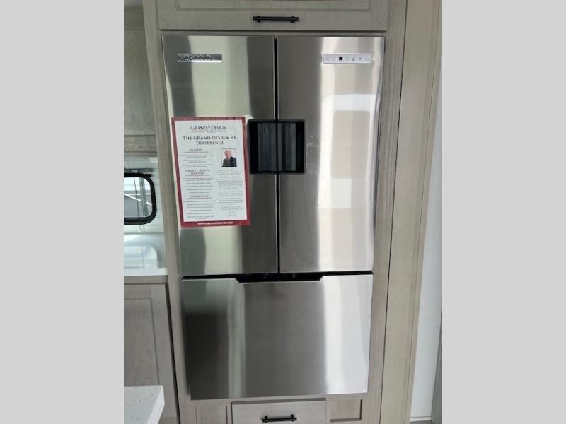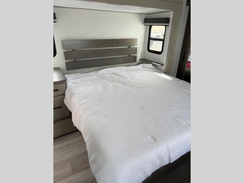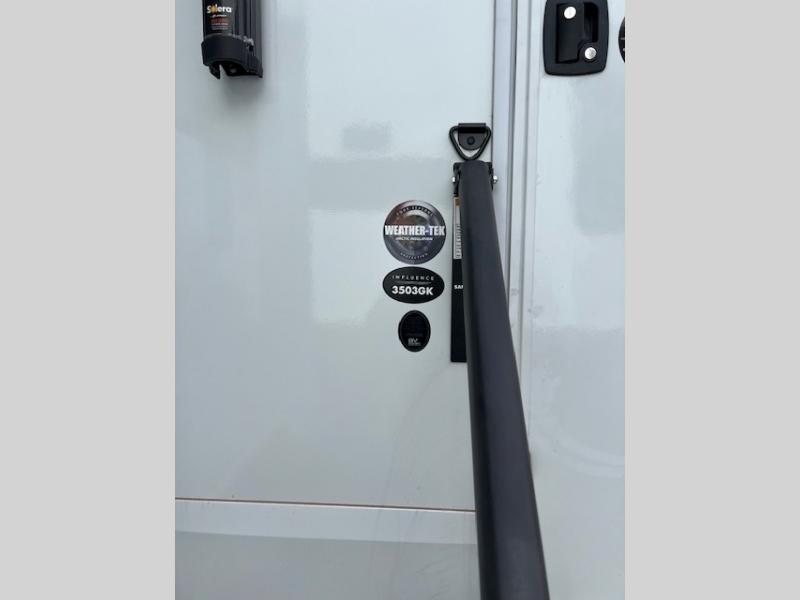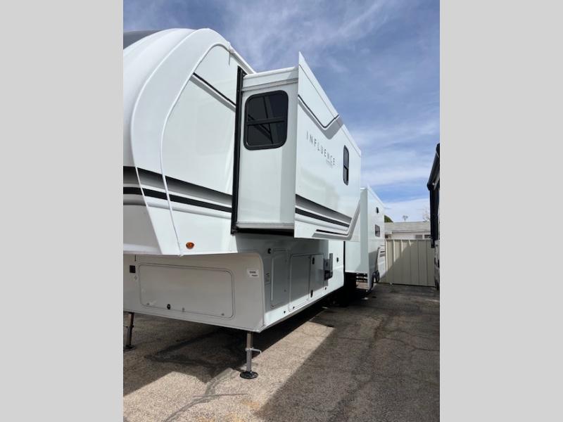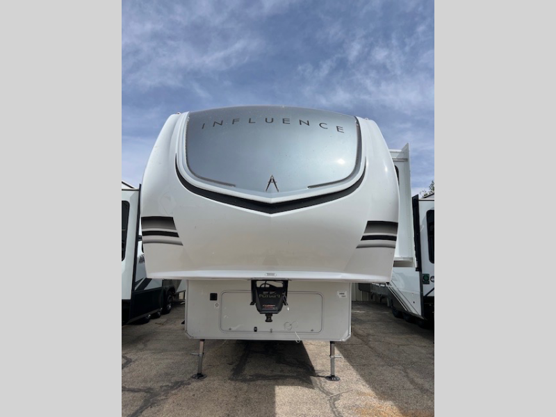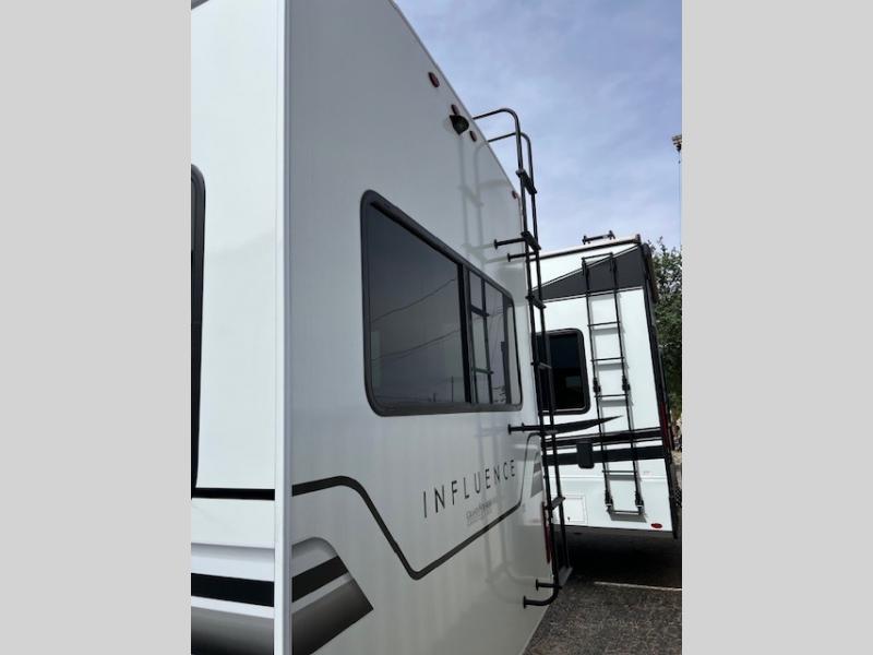 Any Grand Design Influence fifth wheel features five-sided aluminum cage construction with a walk-on roof and a fully enclosed underbelly with heated tanks and storage for all weather camping. For peace of mind, the MORryde CRE3000 Suspension system will provide safe and smooth towing, and the 101" widebody construction offers all the room you need and that is before multiple slides are fully engaged. You will appreciate the Keyed-Alike locks, slam-latch baggage doors with magnetic door catches, exterior security light, and SolidStep entry steps. On the inside, Congoleum flooring, premium roller shades for privacy, a hallway handrail for safety, and nightstands with USB ports to keep all of your electronics fully charged. You will also love the On Demand tankless water heater when showering, plus the added heat and ambiance from an electric fireplace, and so much more!