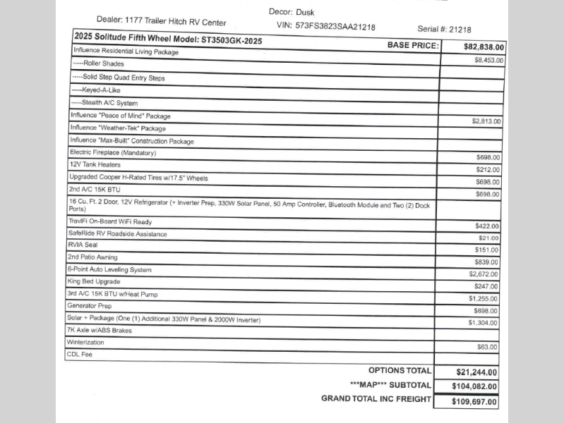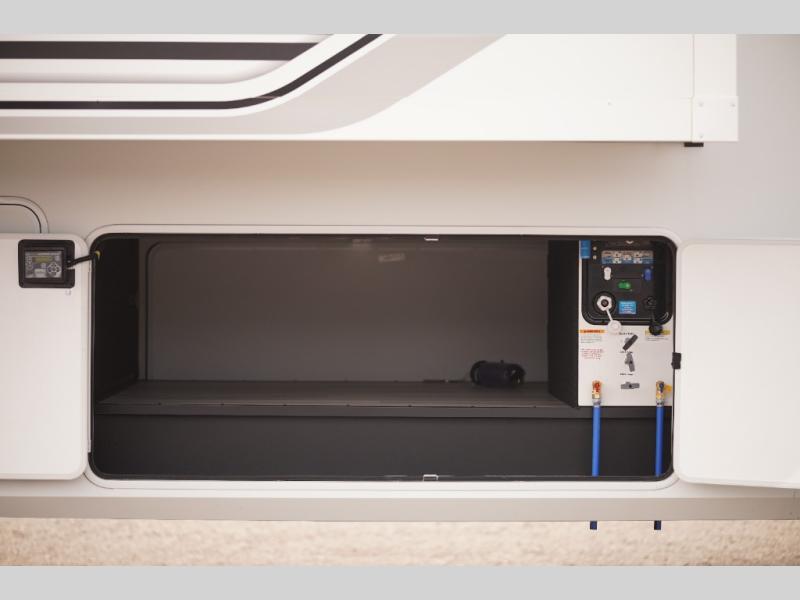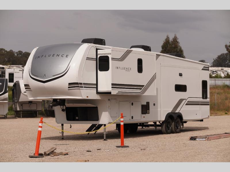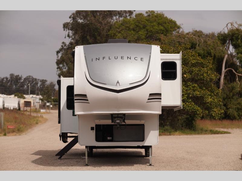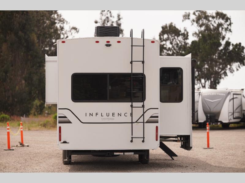 Any Grand Design Influence fifth wheel features five-sided aluminum cage construction with a walk-on roof and a fully enclosed underbelly with heated tanks and storage for all weather camping. For peace of mind, the MORryde CRE3000 Suspension system will provide safe and smooth towing, and the 101" widebody construction offers all the room you need and that is before multiple slides are fully engaged. You will appreciate the Keyed-Alike locks, slam-latch baggage doors with magnetic door catches, exterior security light, and SolidStep entry steps. On the inside, Congoleum flooring, premium roller shades for privacy, a hallway handrail for safety, and nightstands with USB ports to keep all of your electronics fully charged. You will also love the On Demand tankless water heater when showering, plus the added heat and ambiance from an electric fireplace, and so much more!