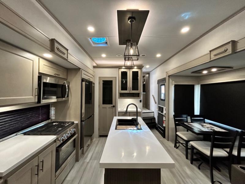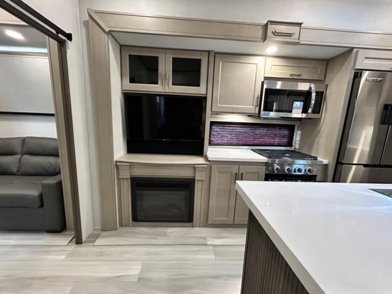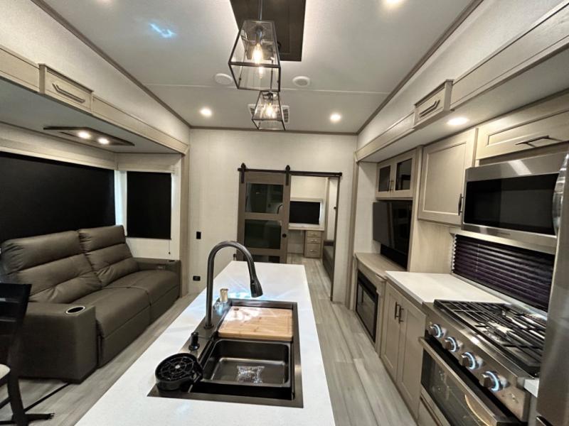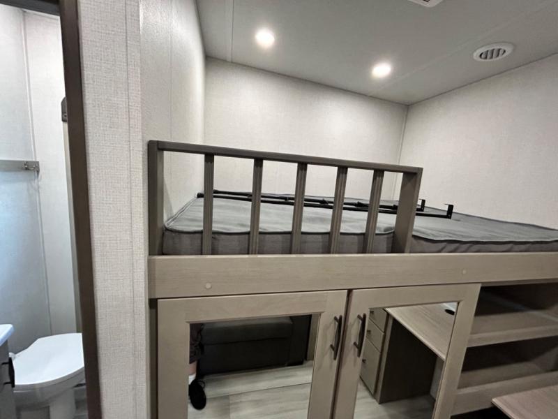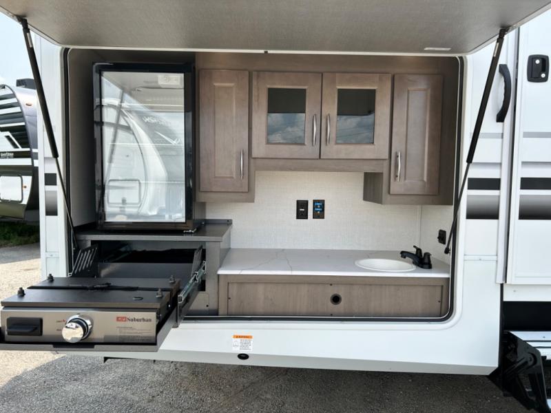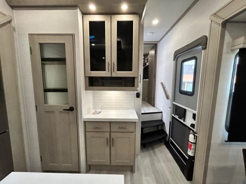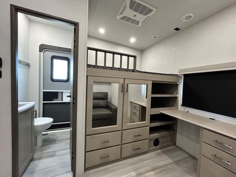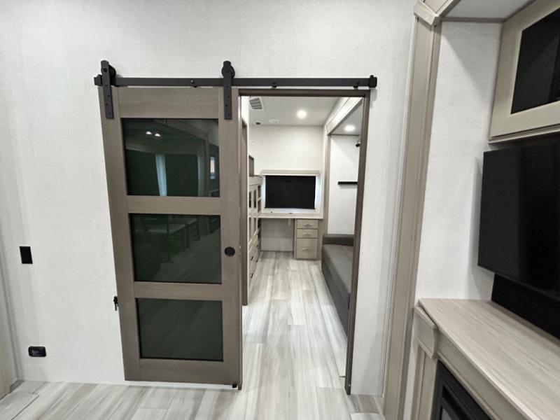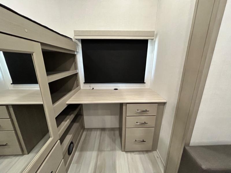 Grab the whole gang and head out in this fifth wheel featuring a private bunkhouse that sleeps five. This unit also features dual entry doors for added convenience with one set leading into a half bath, and quad slides for even more space in this widebody layout. The combined kitchen and living area featuring dual opposing slides offer space to dine and relax including theater seating for two opposite the entertainment center and fireplace. The chef in your group will appreciate the amenities for dreaming up dishes to feed everyone, and the outside griddle, sink and beverage cooler provides even more options. In front, a private bedroom and full bath with a queen bed or optional king, your choice. You can even add a washer and dryer with a space in front prepped for both if you like.