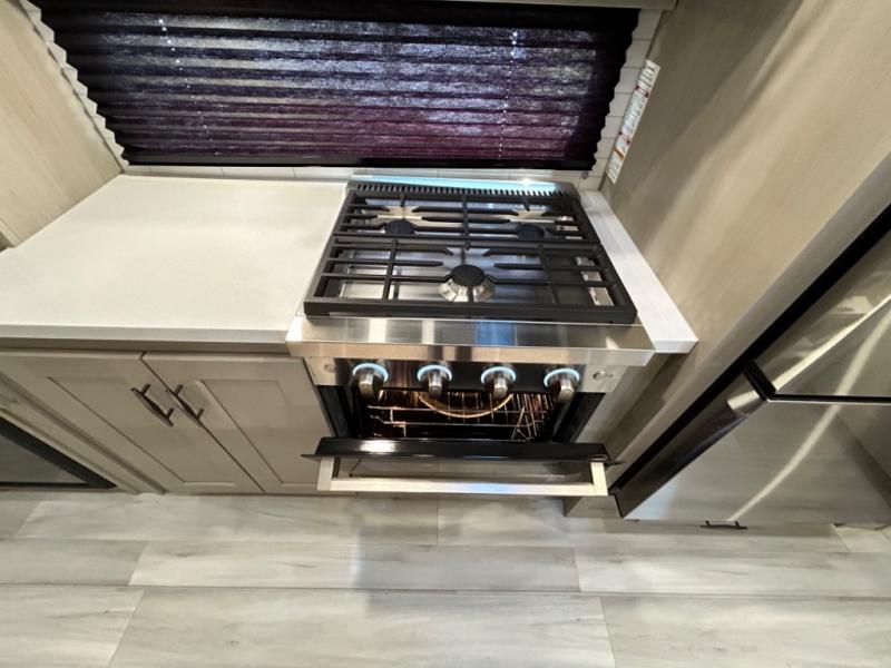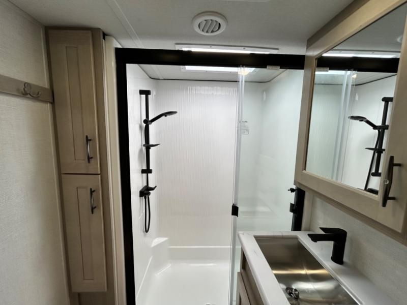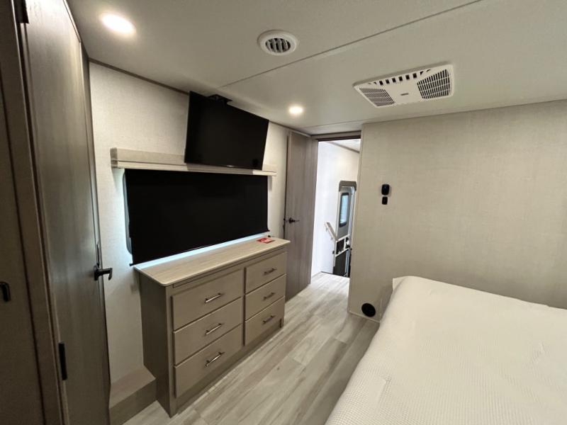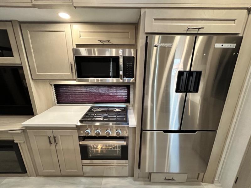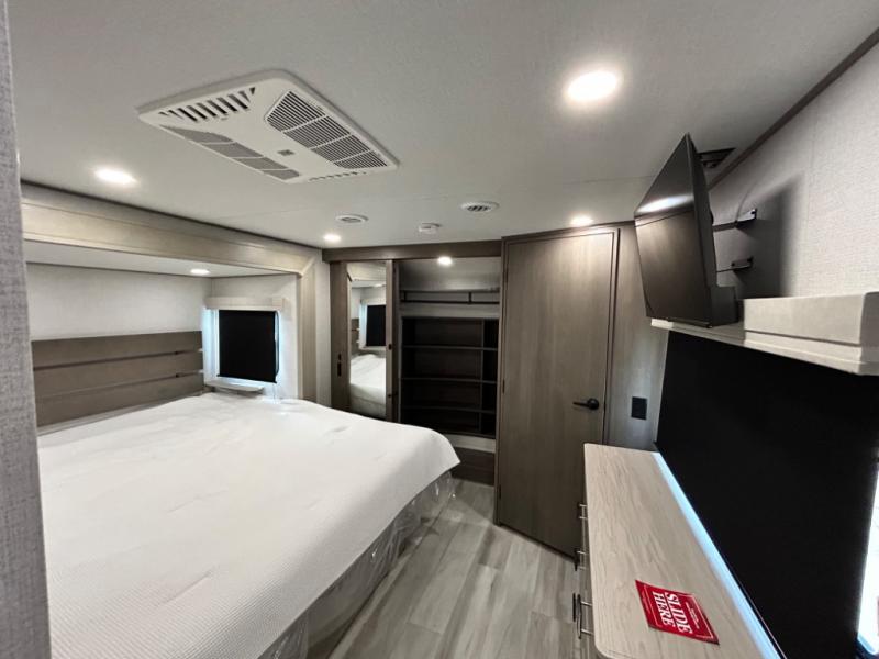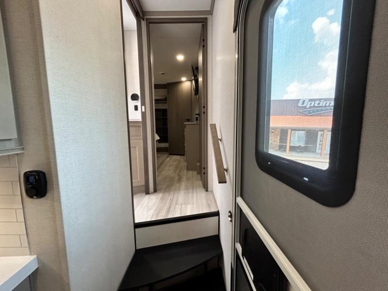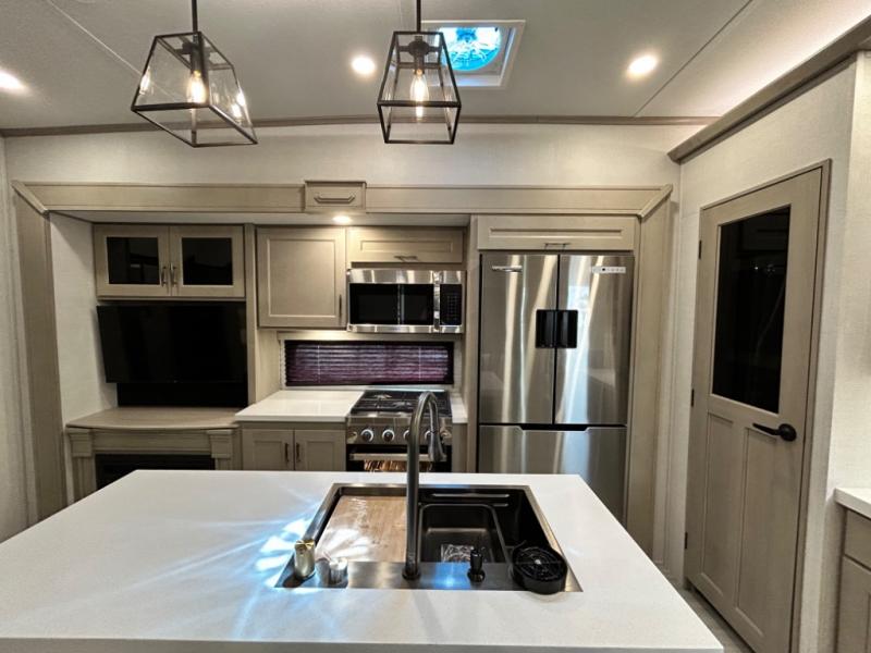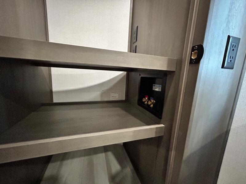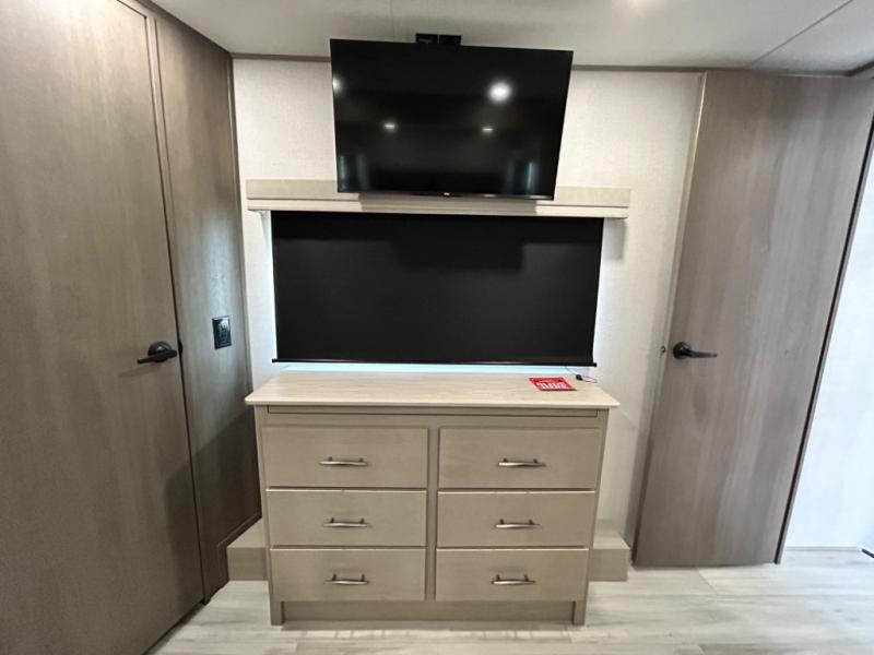 Grab the whole gang and head out in this fifth wheel featuring a private bunkhouse that sleeps five. This unit also features dual entry doors for added convenience with one set leading into a half bath, and quad slides for even more space in this widebody layout. The combined kitchen and living area featuring dual opposing slides offer space to dine and relax including theater seating for two opposite the entertainment center and fireplace. The chef in your group will appreciate the amenities for dreaming up dishes to feed everyone, and the outside griddle, sink and beverage cooler provides even more options. In front, a private bedroom and full bath with a queen bed or optional king, your choice. You can even add a washer and dryer with a space in front prepped for both if you like.